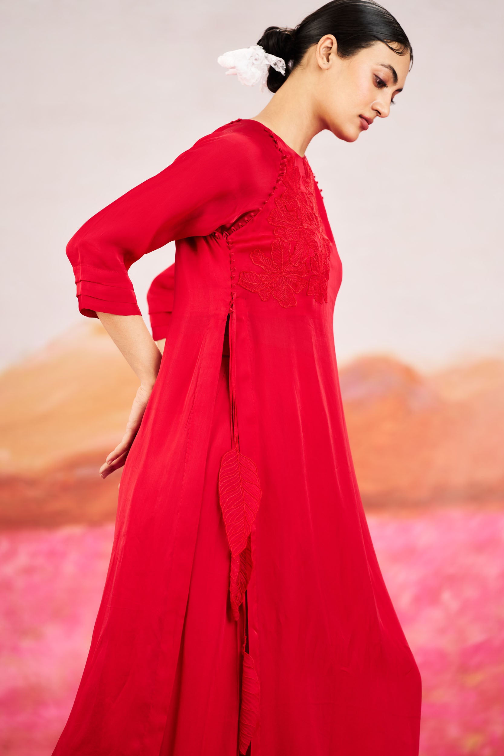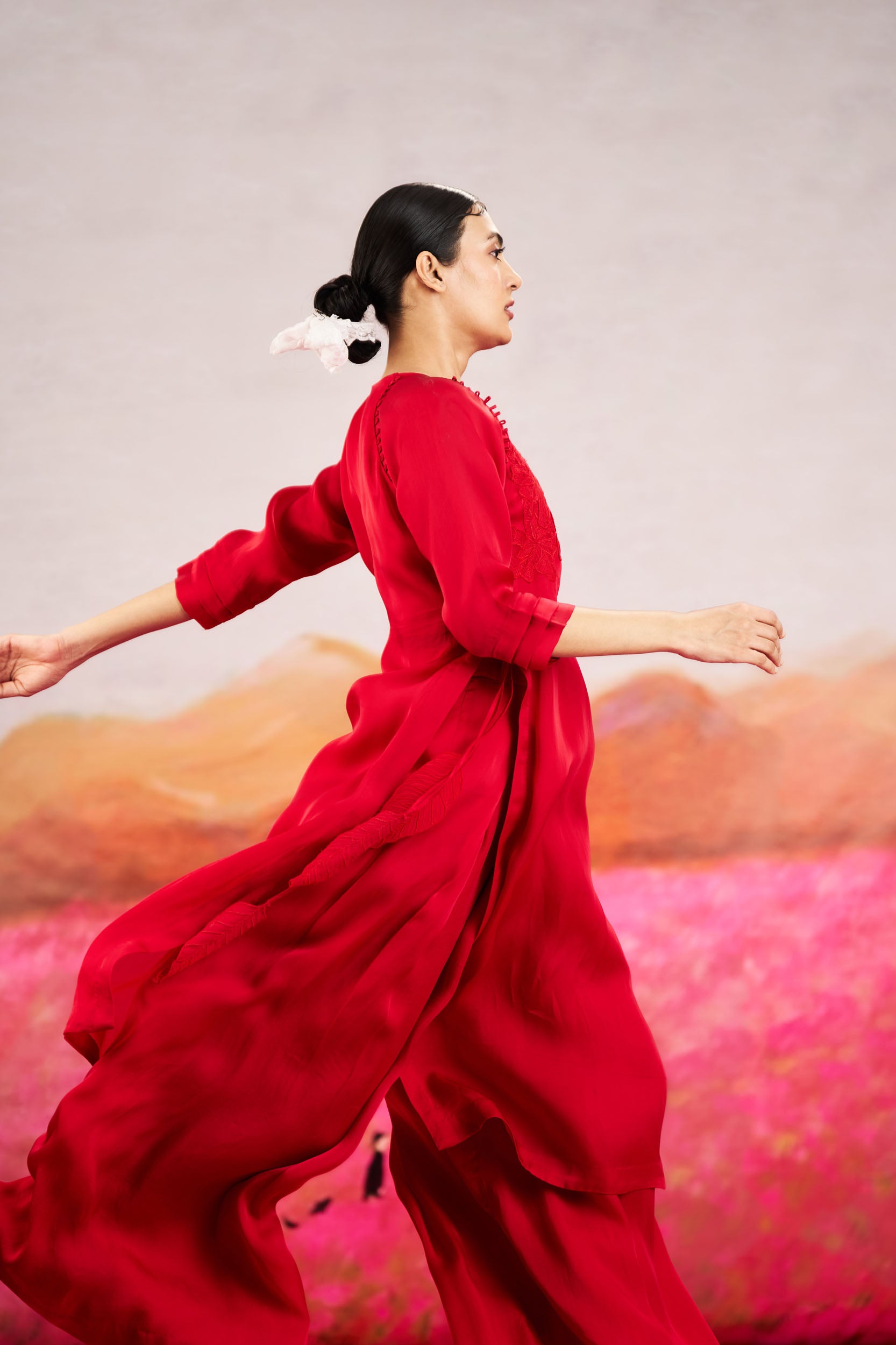Description: A coordinated red set blending a modern structured top with a tailored bottom for effortless polish.