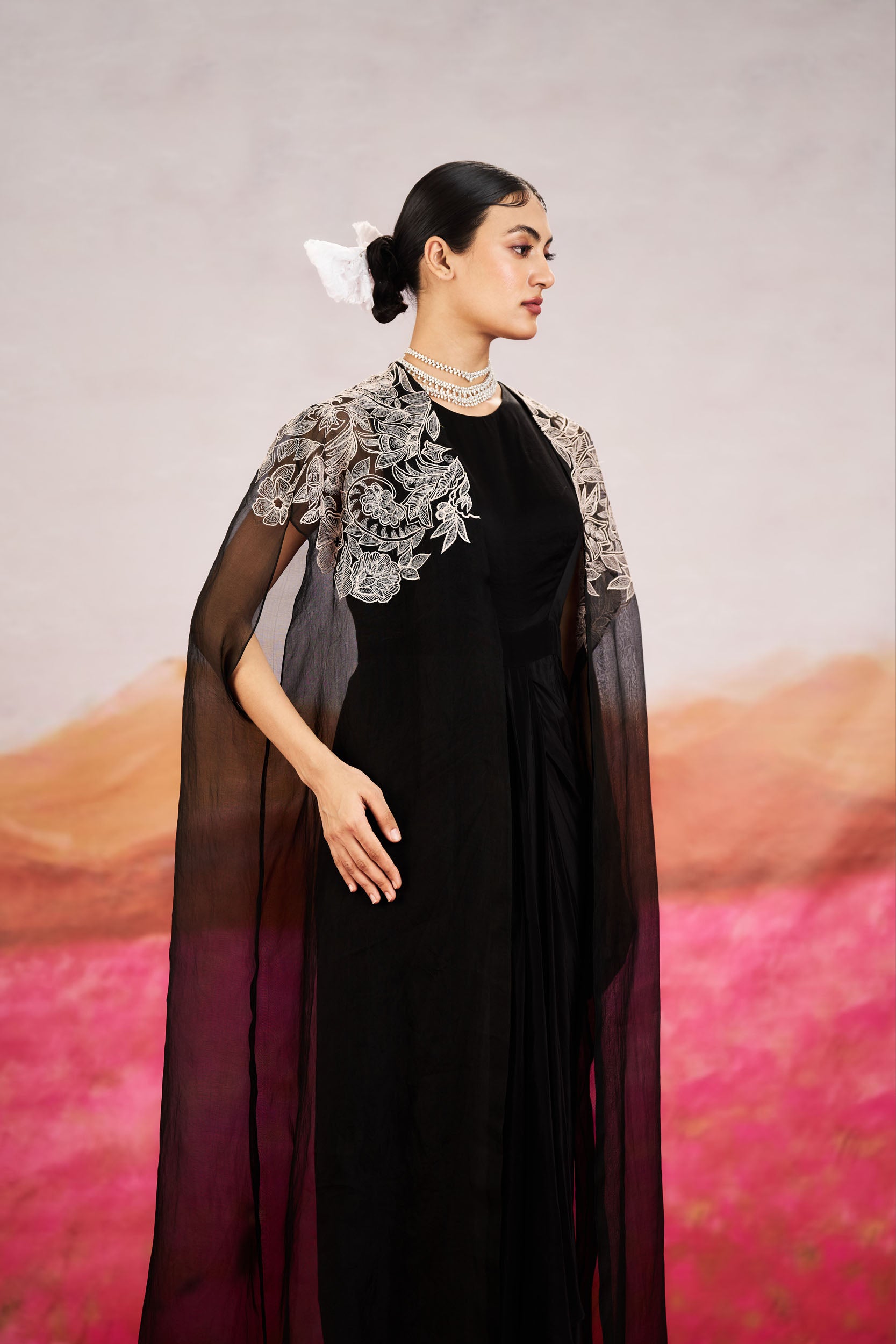 Description: A fluid drape dress in timeless black, elevated with a dramatic long cape.