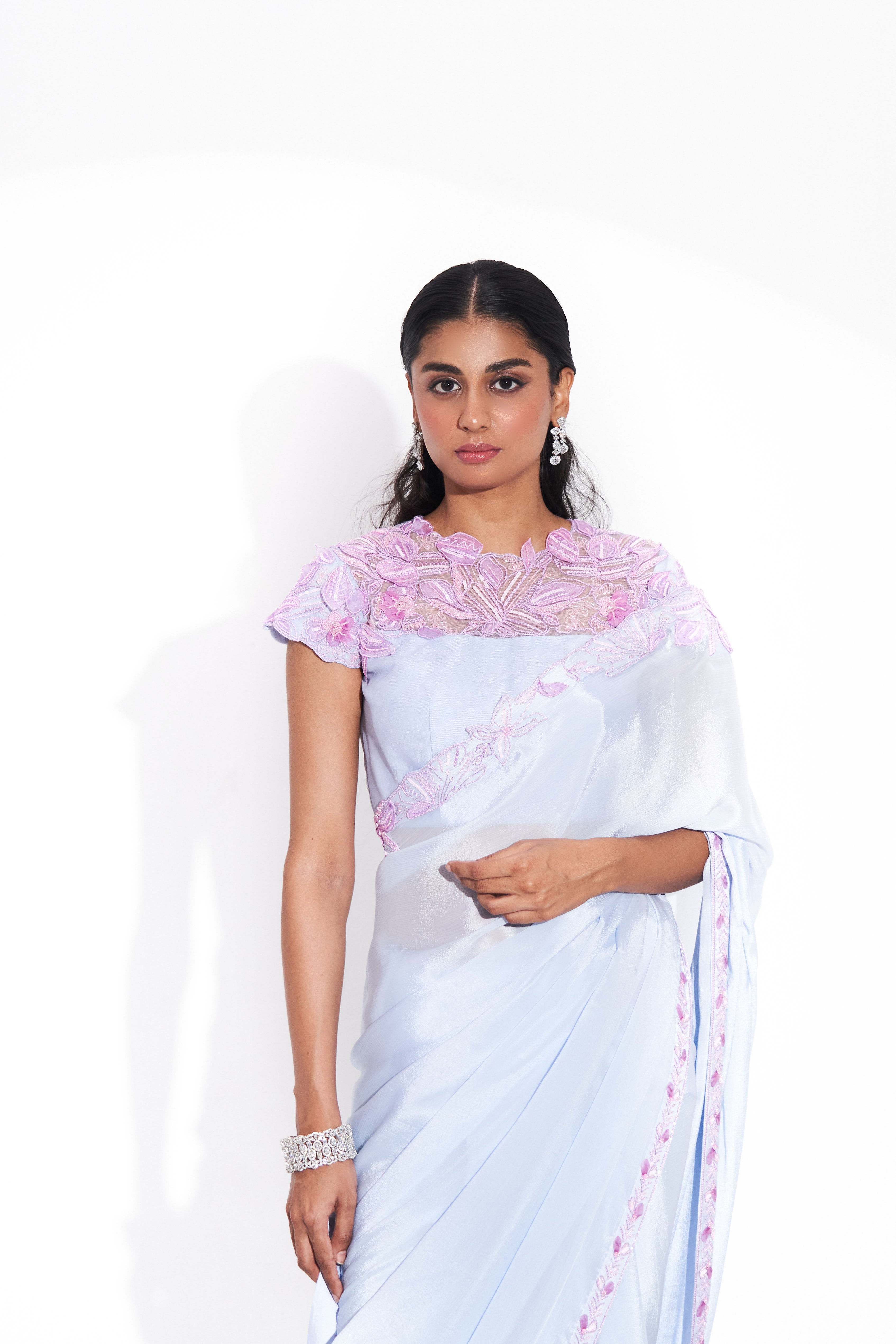 Description : pale blue lehanga set comes with a lehanga and blouse with sleeveless and closed neckline. Embroidery: pink colour, crystal and beaded embroidery. Fabric: chiffon.