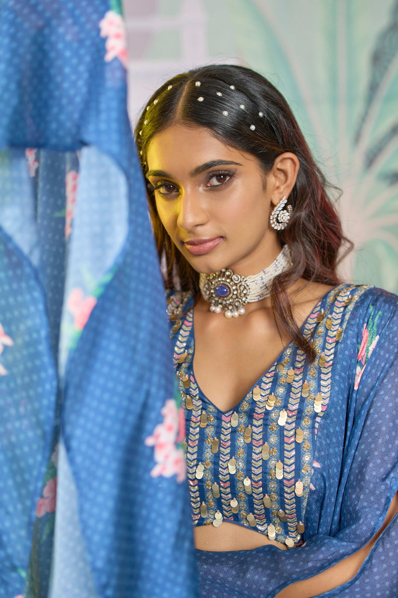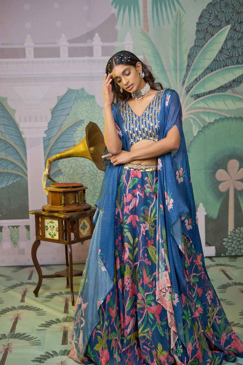 Fabric : Printed organza lehenga with silk blouse with attached chiffon sleeves with hand embriodery details.