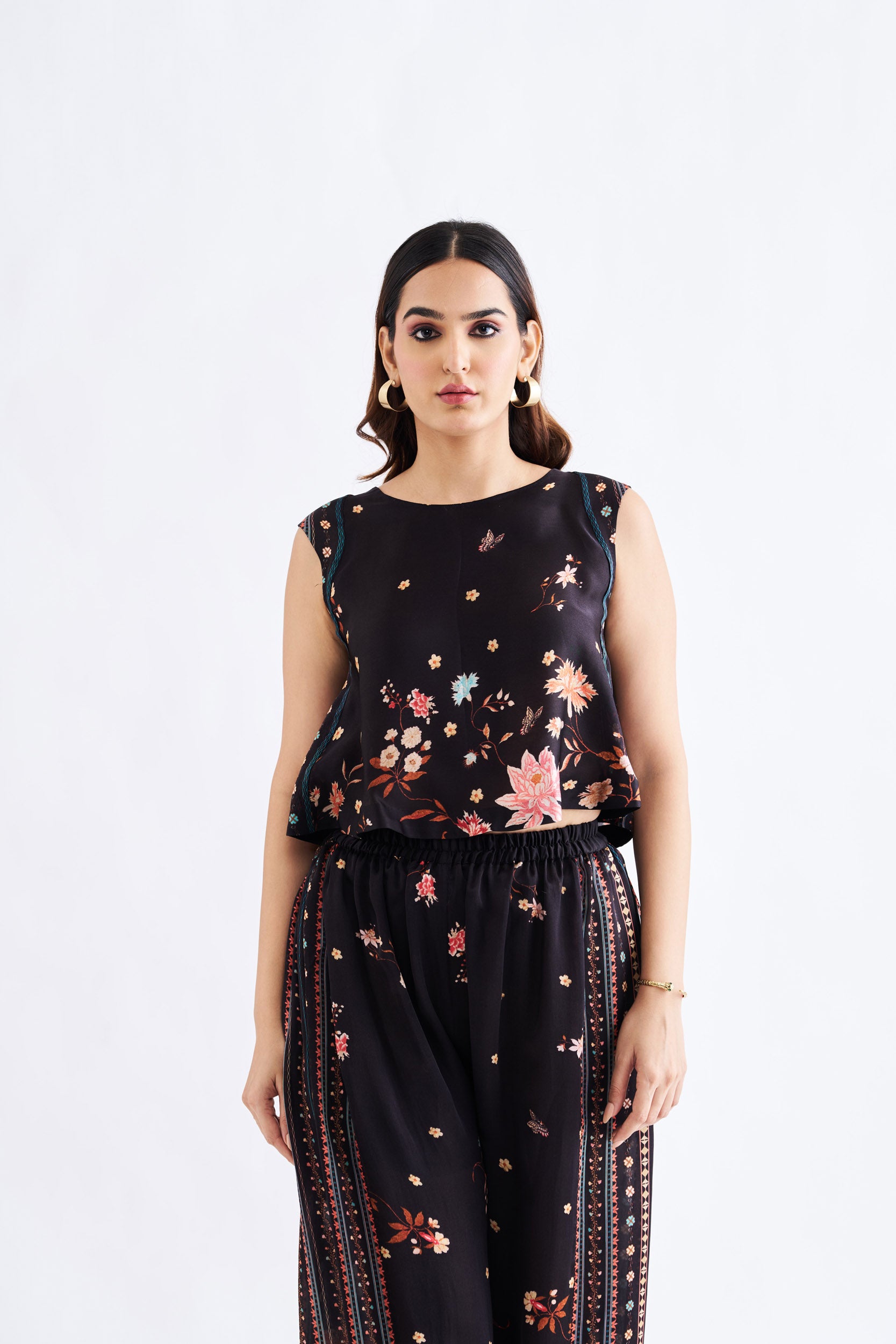 Description: Black floral print co-Ord set has sleeveless crop top and Palazzo pant with strips printed design on the both sides