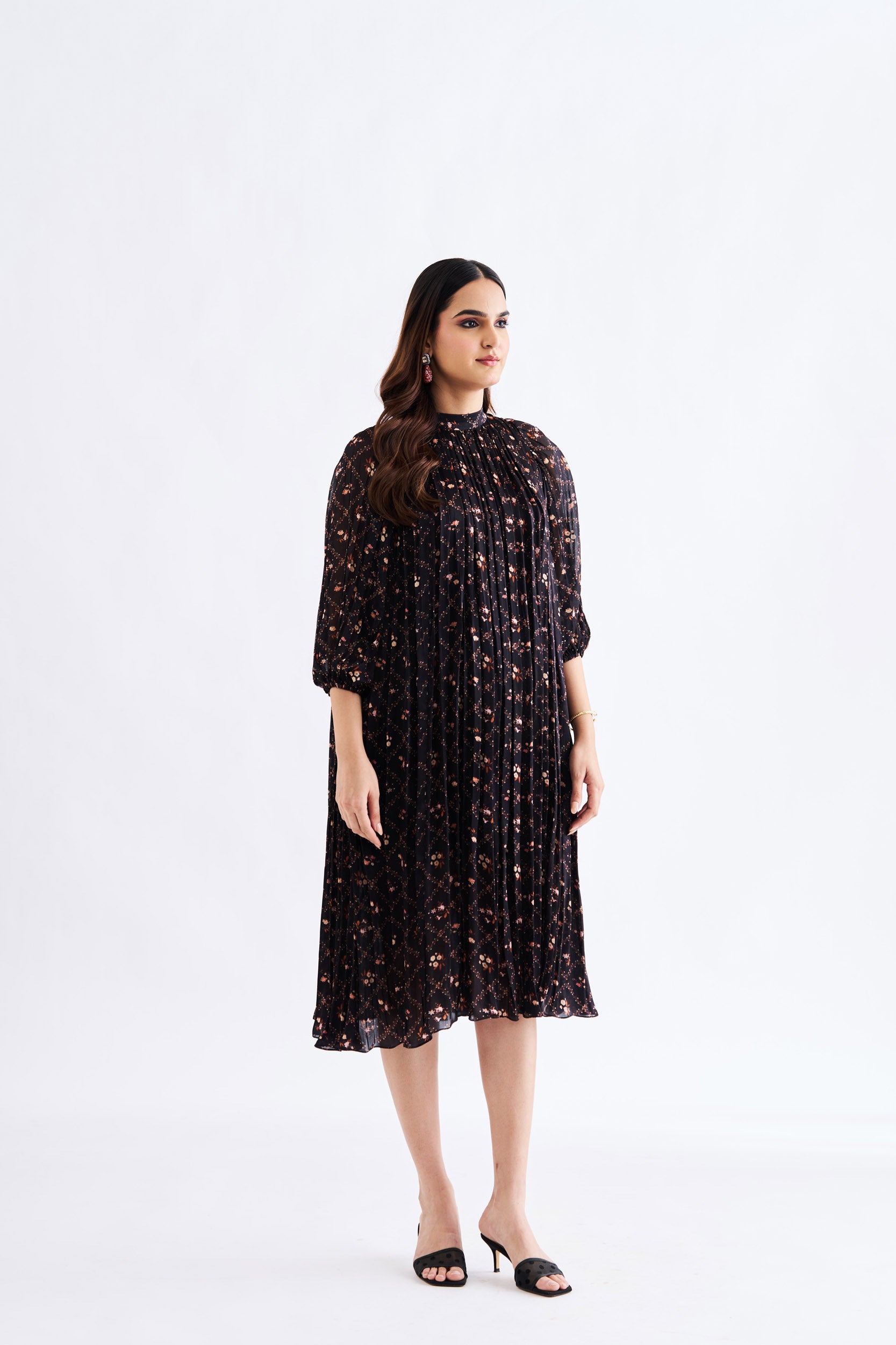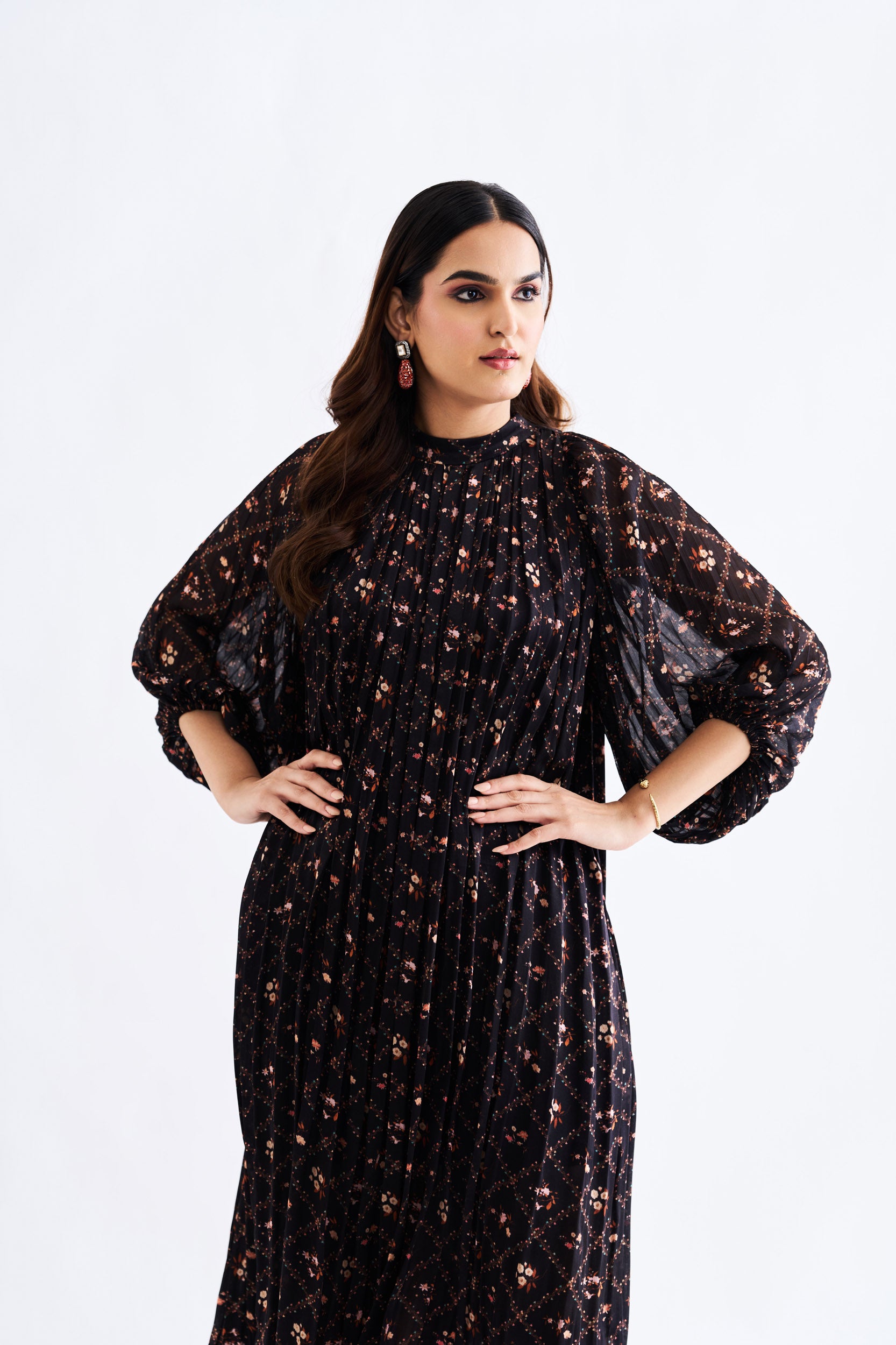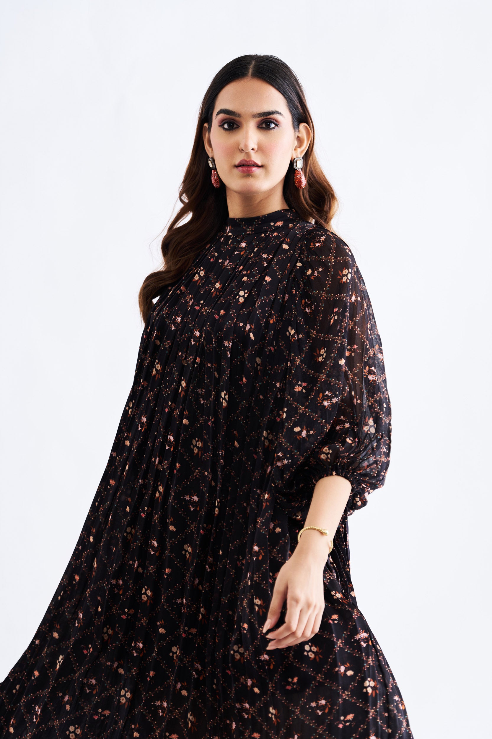 Description: Black floral Modal Silk dress with high collar neck and Chiffon bishop hands.