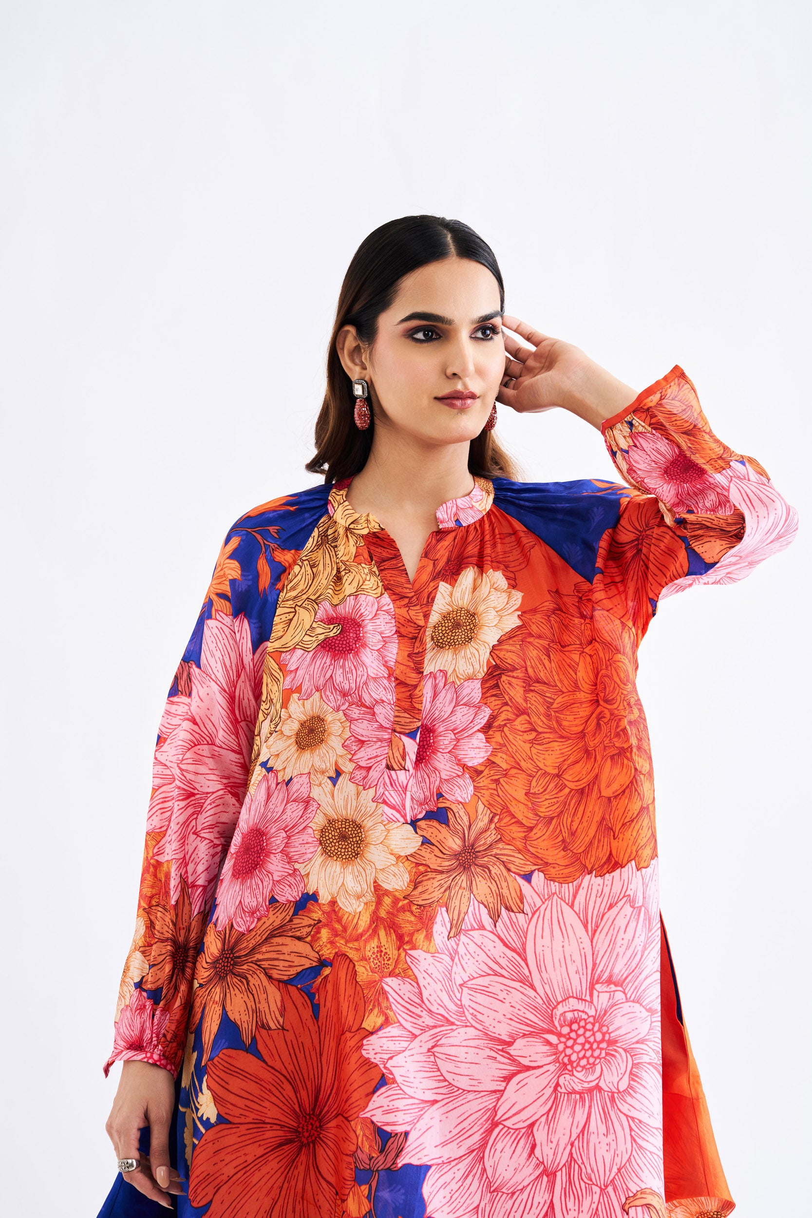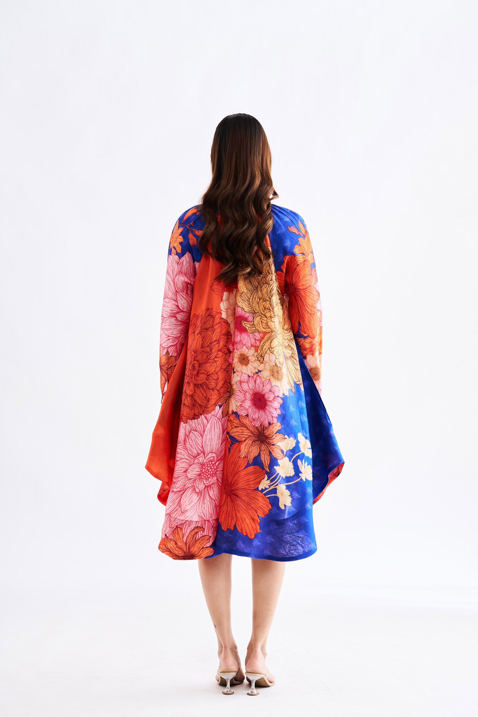 Description: Blue floral asymmetric dress with high collar neck and full sleeves.