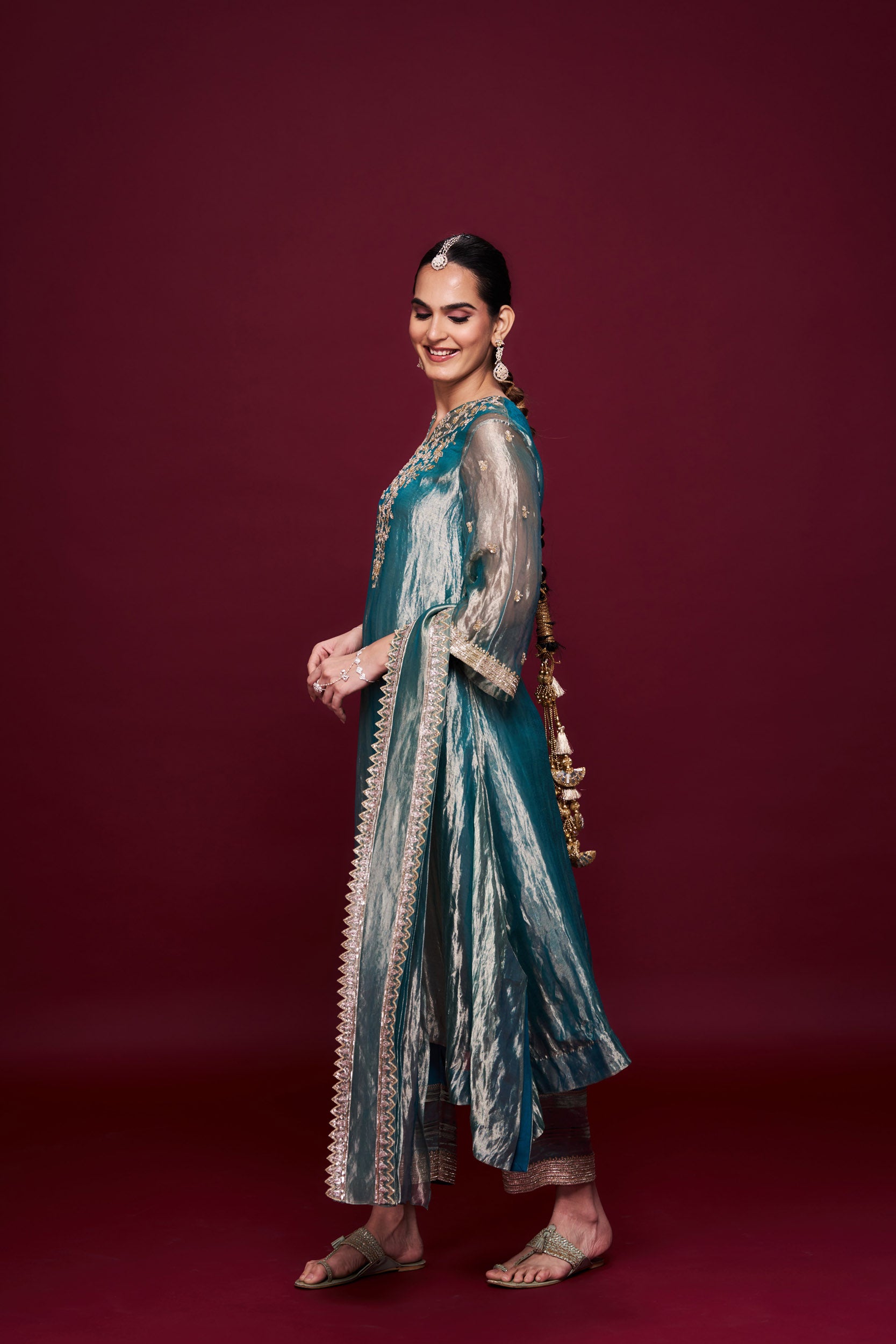 Description: This is a Emerald green silver tissue dress with heavy cutdana & sequins hand embroidered work.