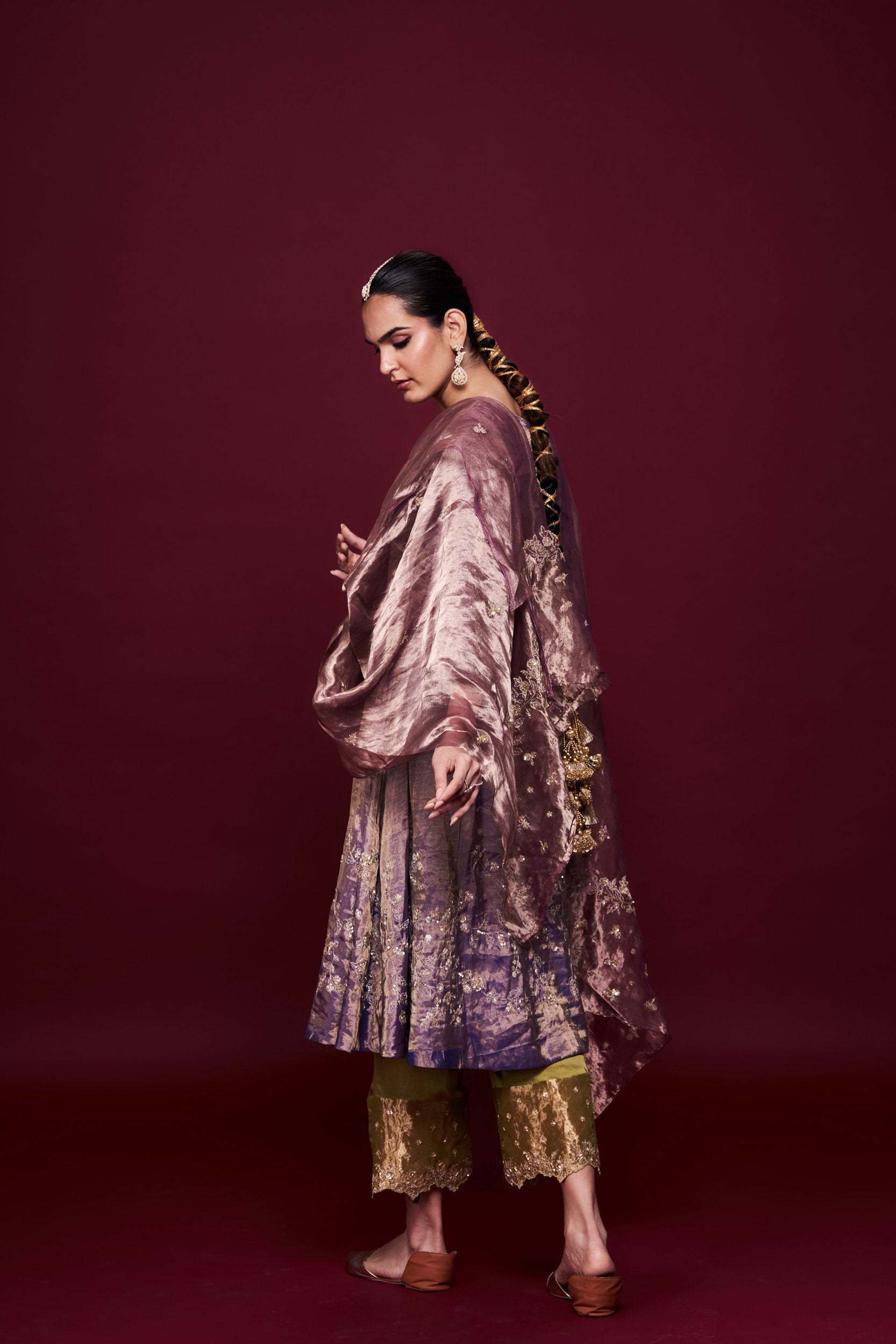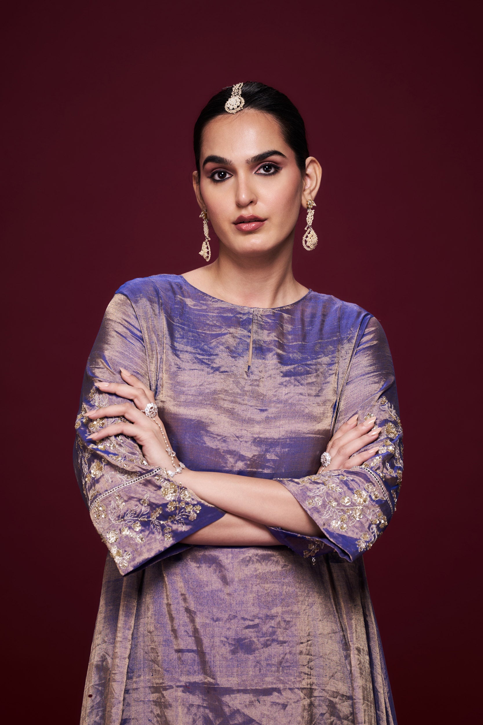 Description: Bluish purple kurti set with heavy cutdana hand embroidered work.