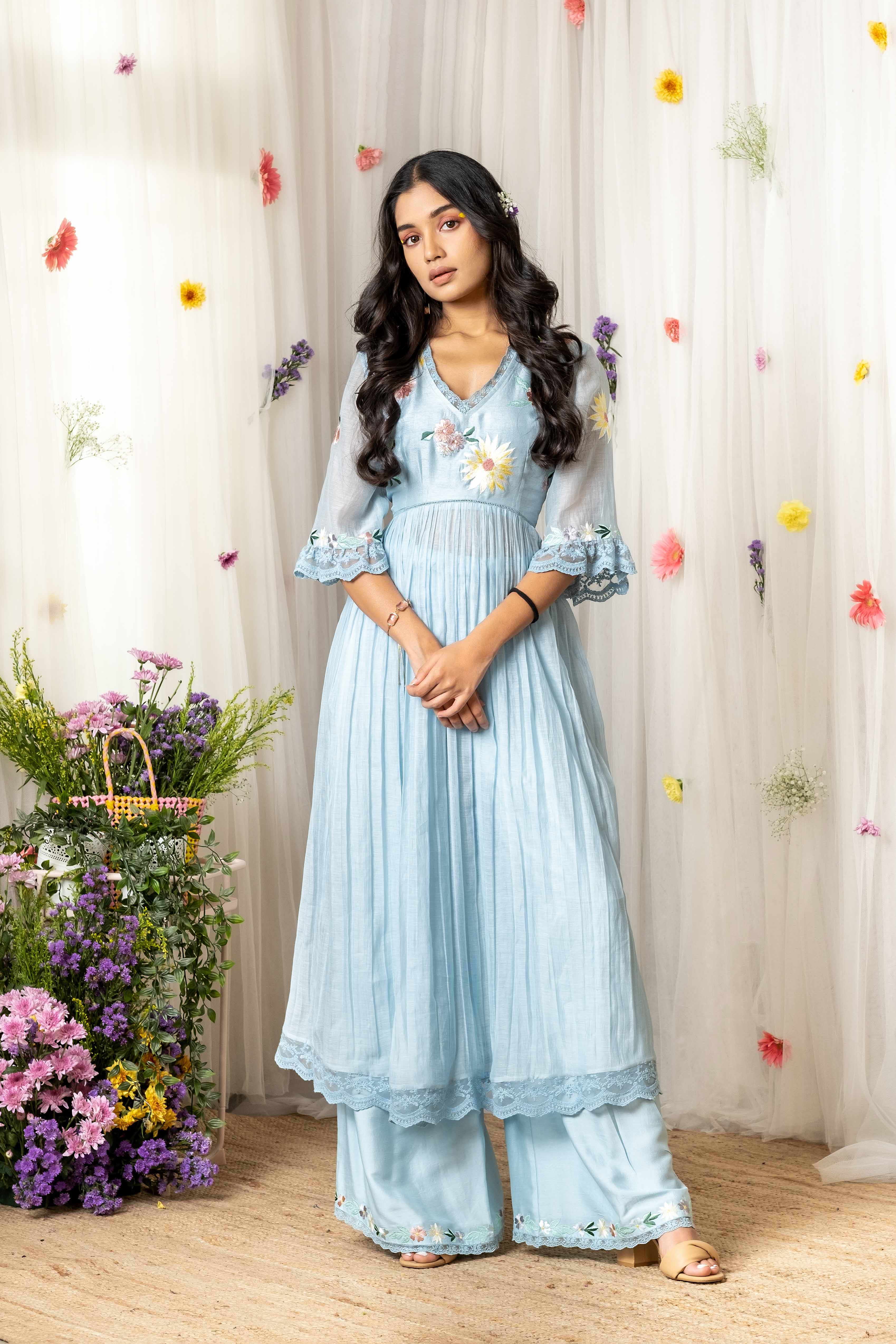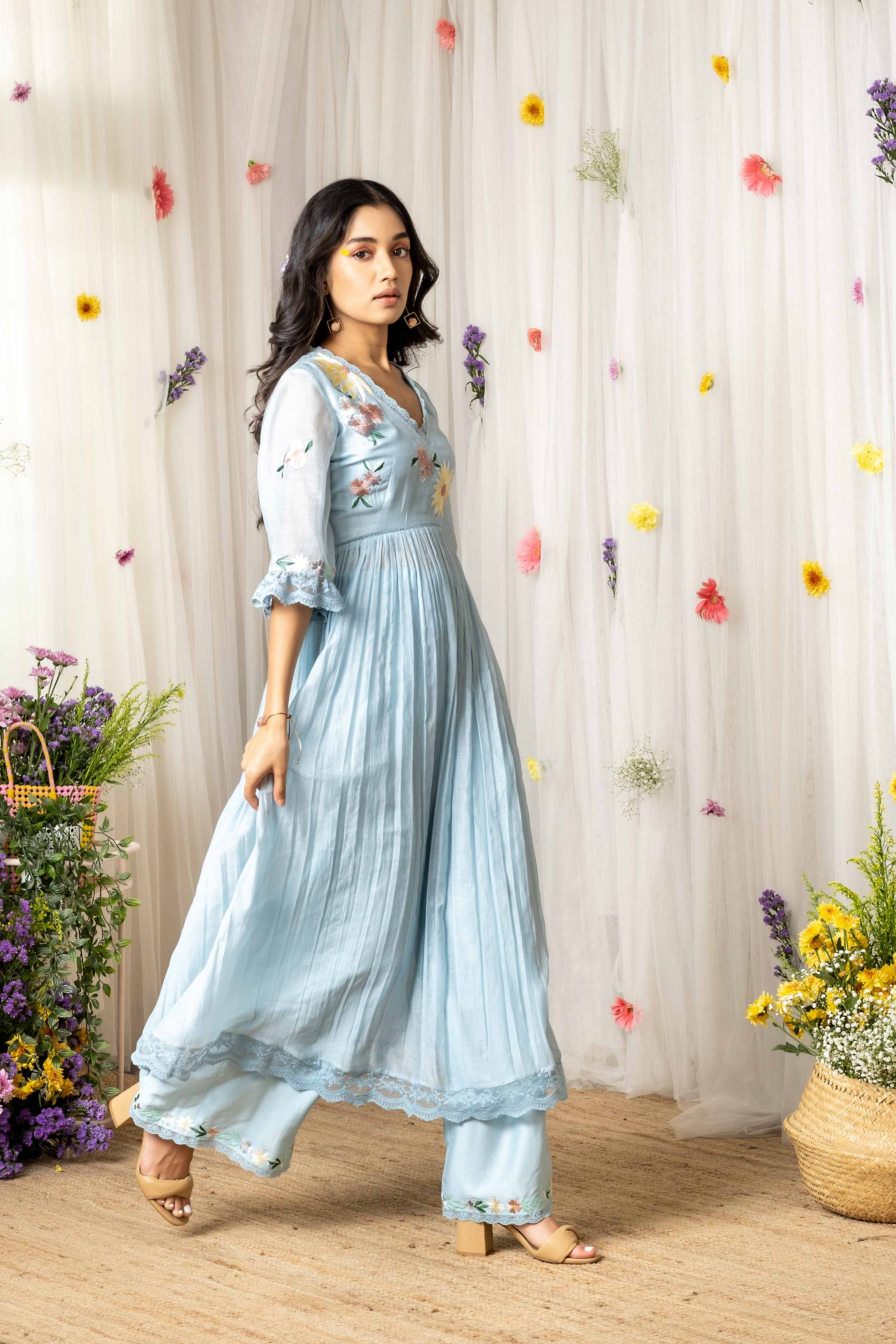 Description - A Gorgeous dress set in the trendy Powder blue colour with beautiful blooming bouquet of flowers, Shimmery embellished yoke design with sensuous V neckline yoke and short flared sleeves with gathered scallop bouquet lace. The fit and flare and the lace detailing's adds to its allure.