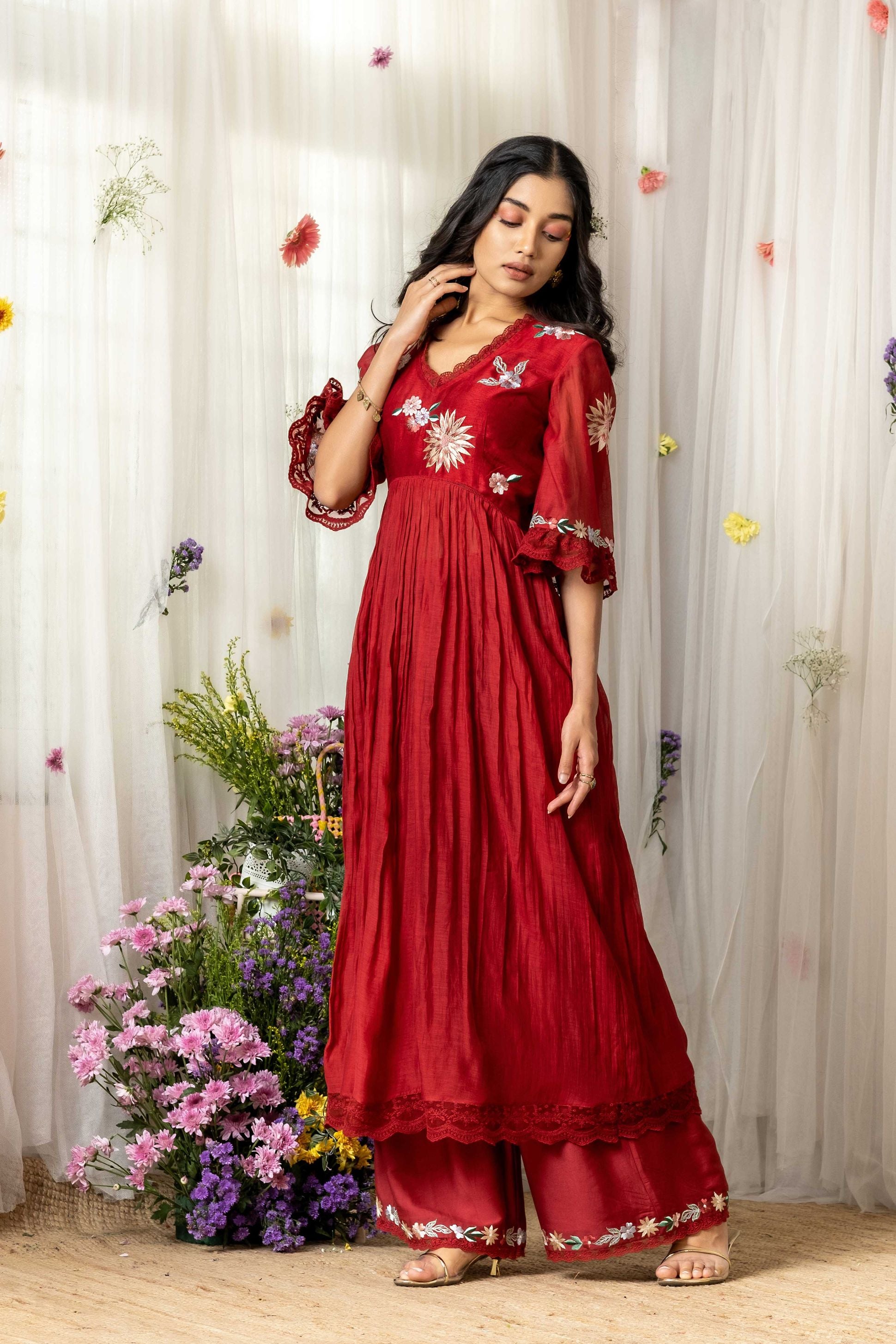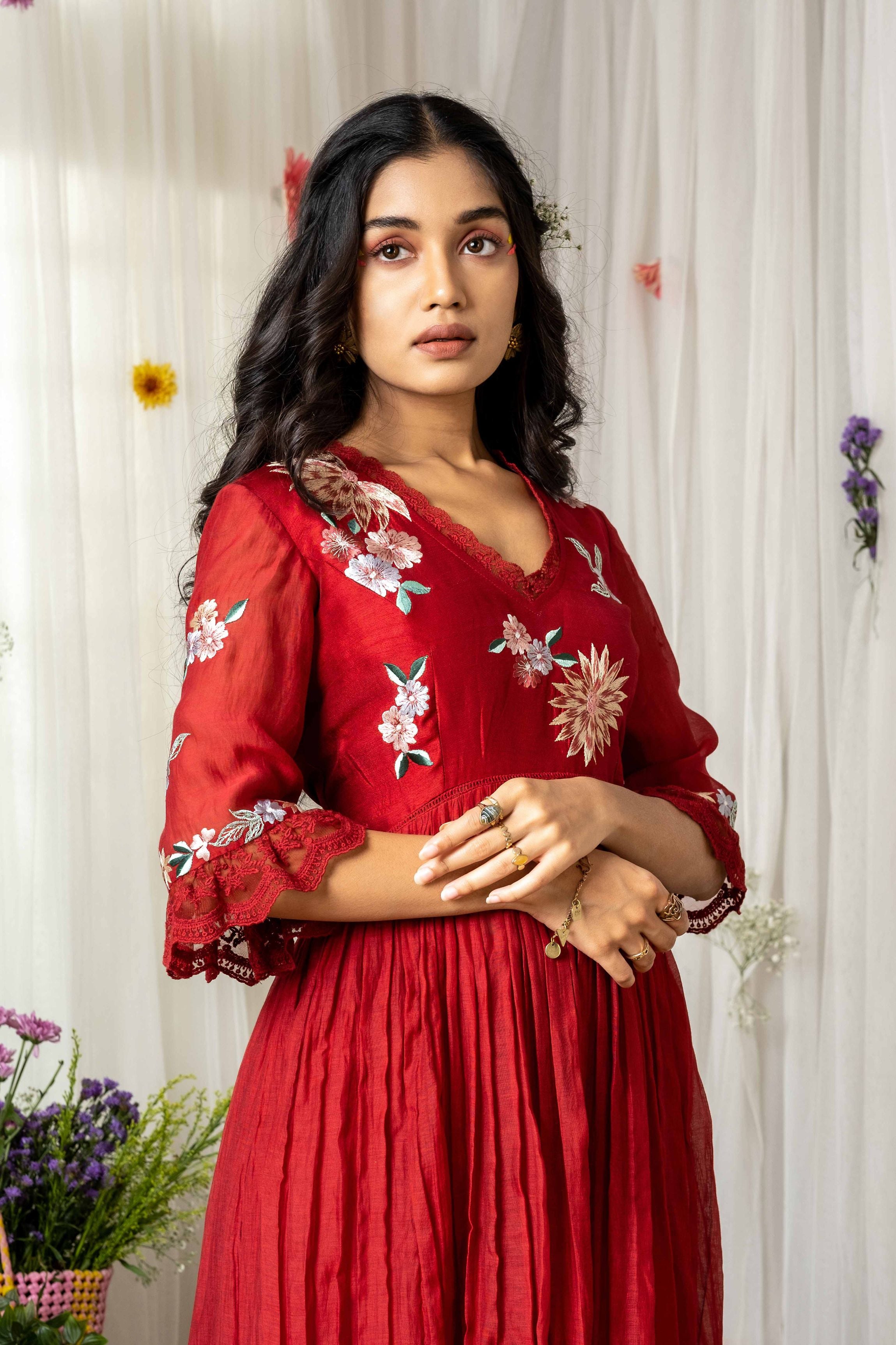 A Gorgeous dress set in the trendy Ruby colour with beautiful blooming bouquet of flowers, Shimmery embellished yoke design with sensuous V neckline yoke and short flared sleeves with gathered scallop bouquet lace. The fit and flare and the lace detailing's adds to its allure.