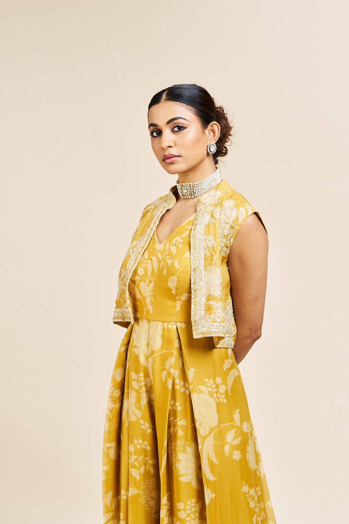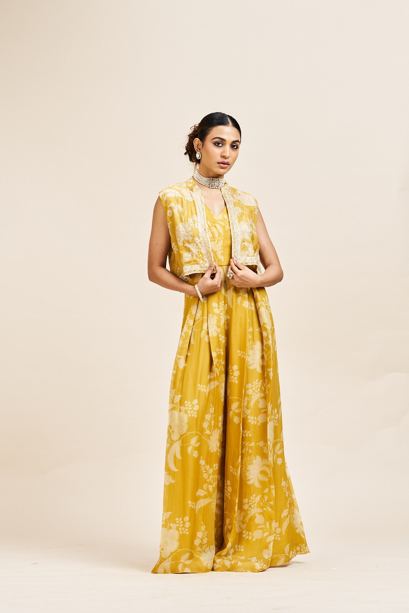 Description: Trendy yellow jumpsuit with a cape for a bold fusion statement.