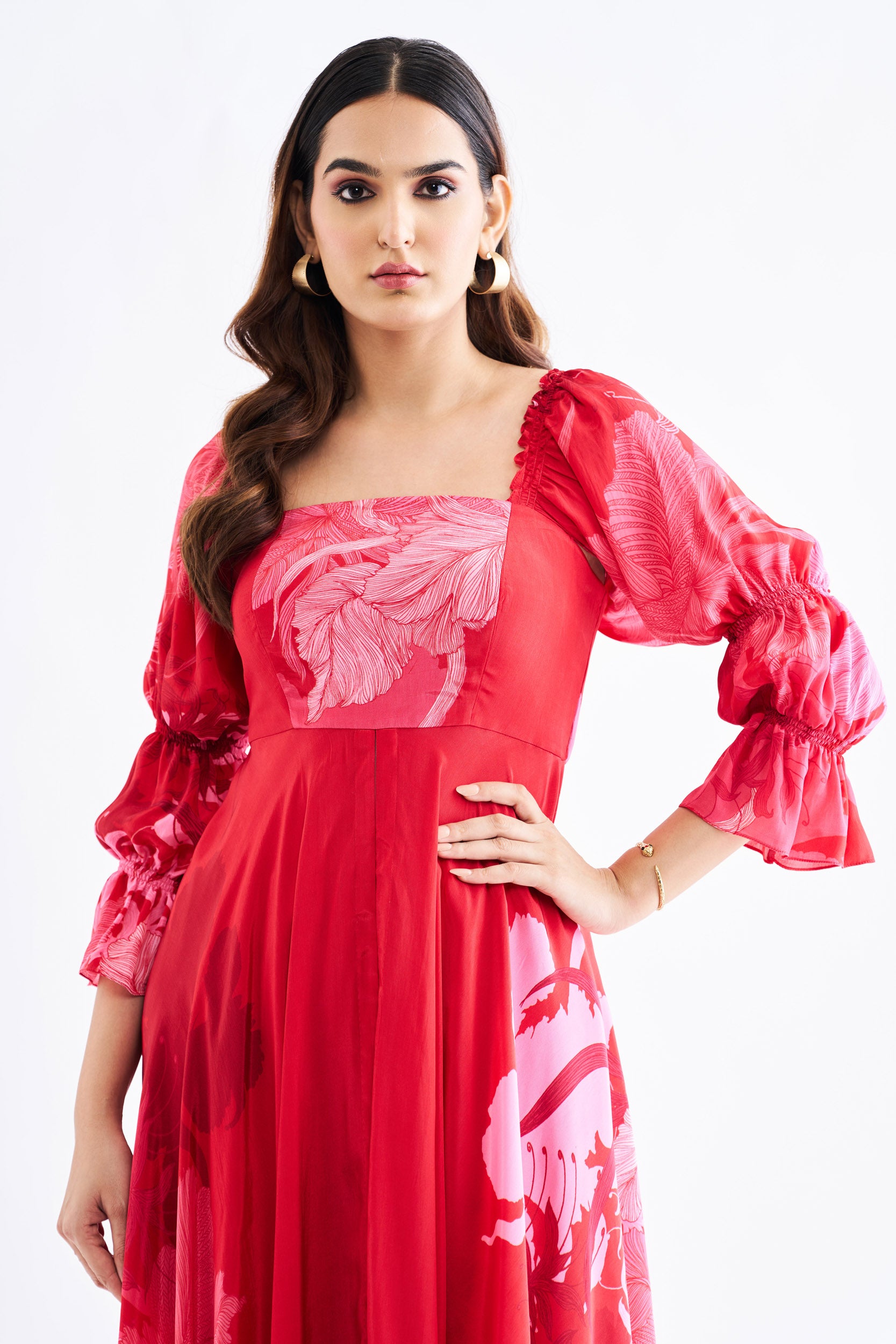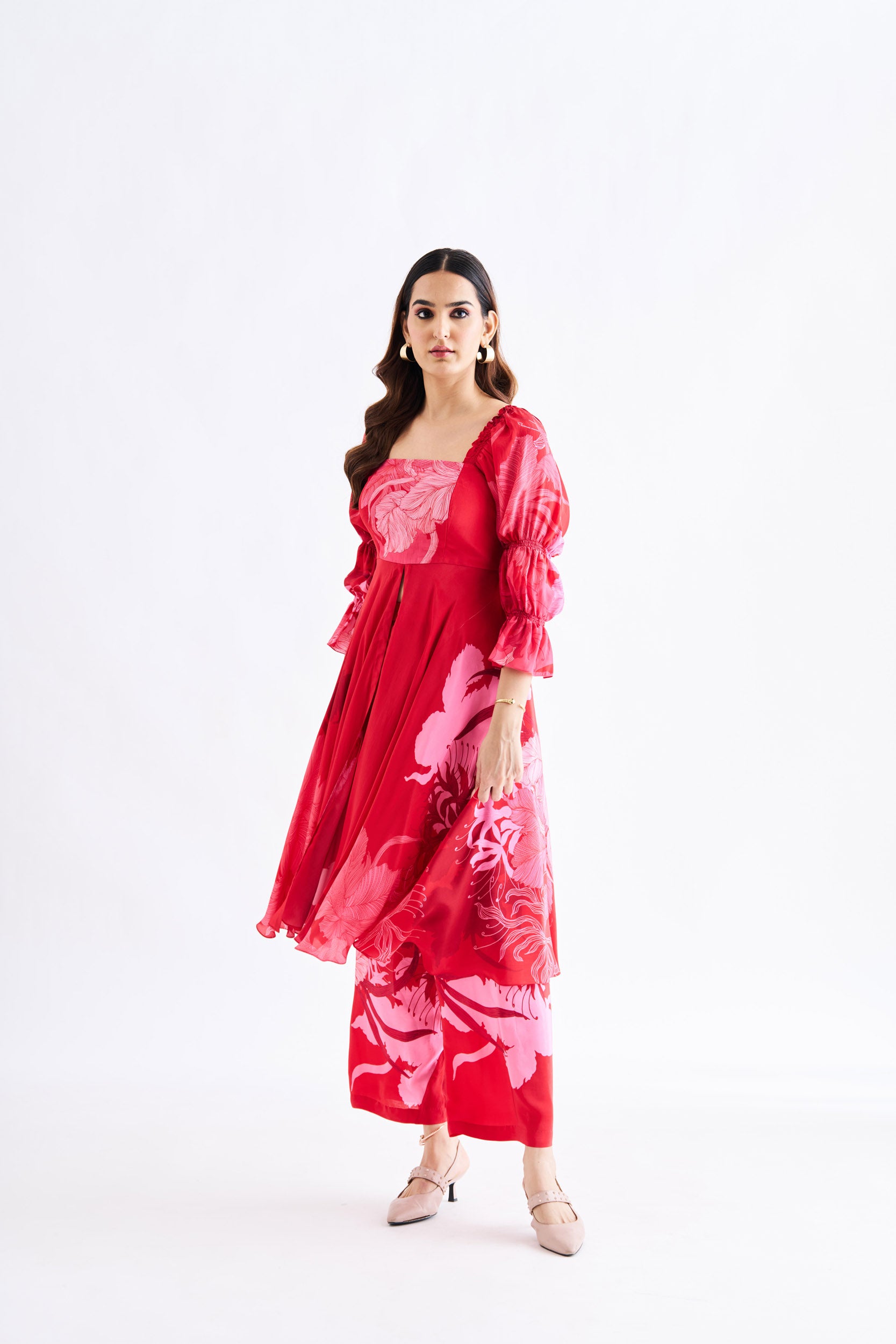 Description: Red floral pure crape Top with front slit and Marie sleeves paired with palazzo pant