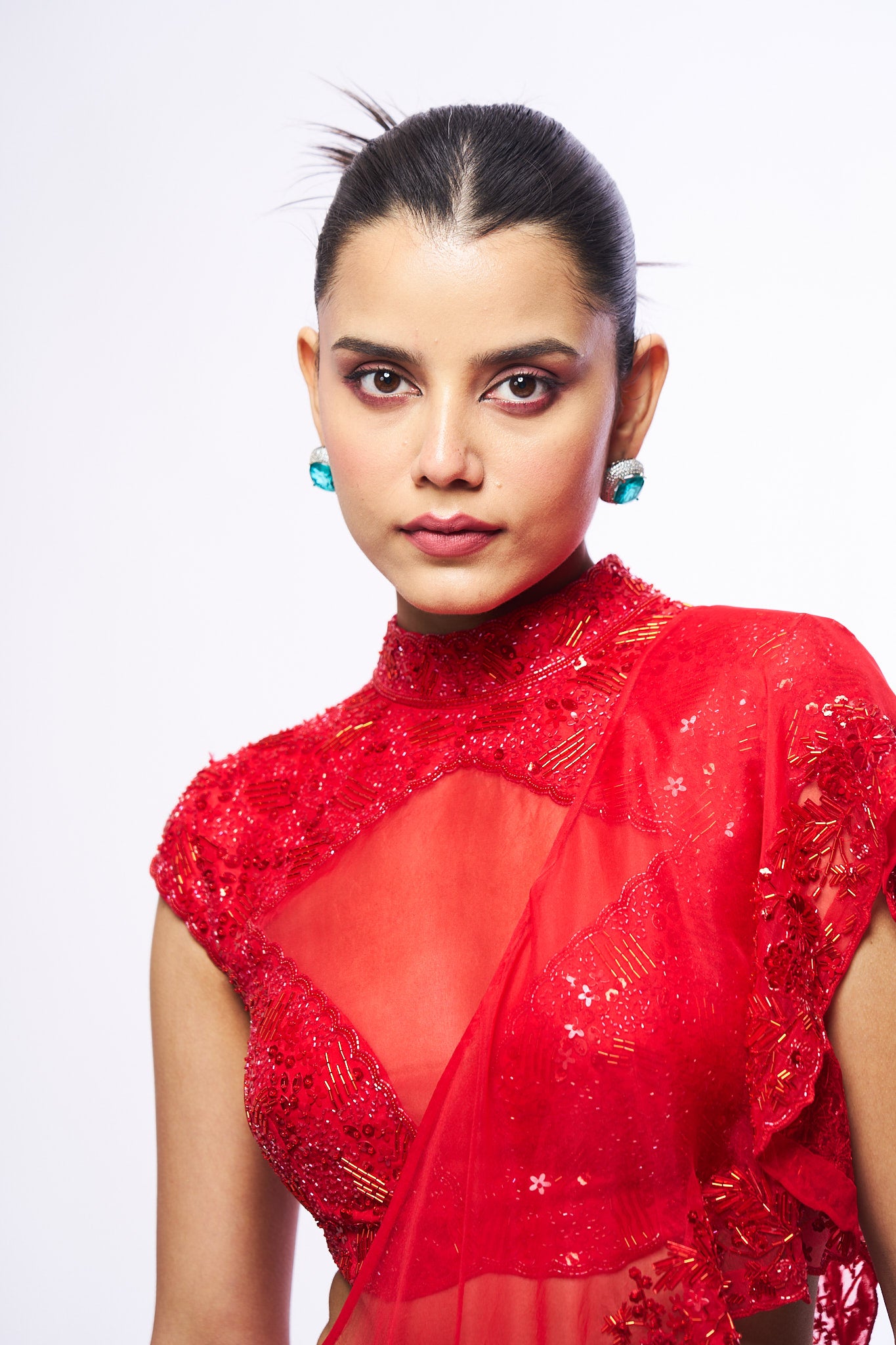 Embroidery: lines of crystal and beaded embroidery on the blouse and belt. Cutwork on saree.