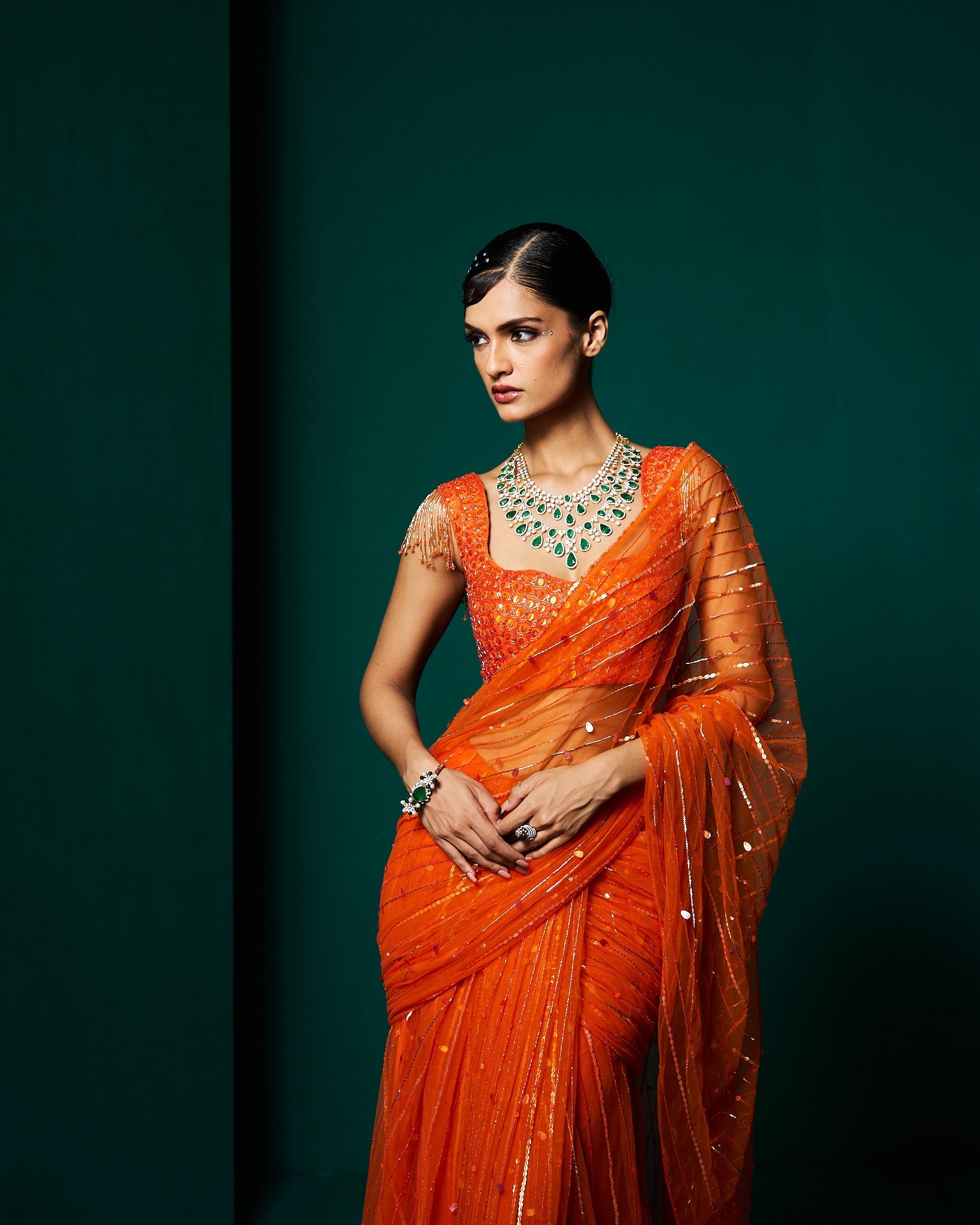 Embroidery: lines of crystal and beaded embroidery on the blouse and belt. Cutwork on saree.