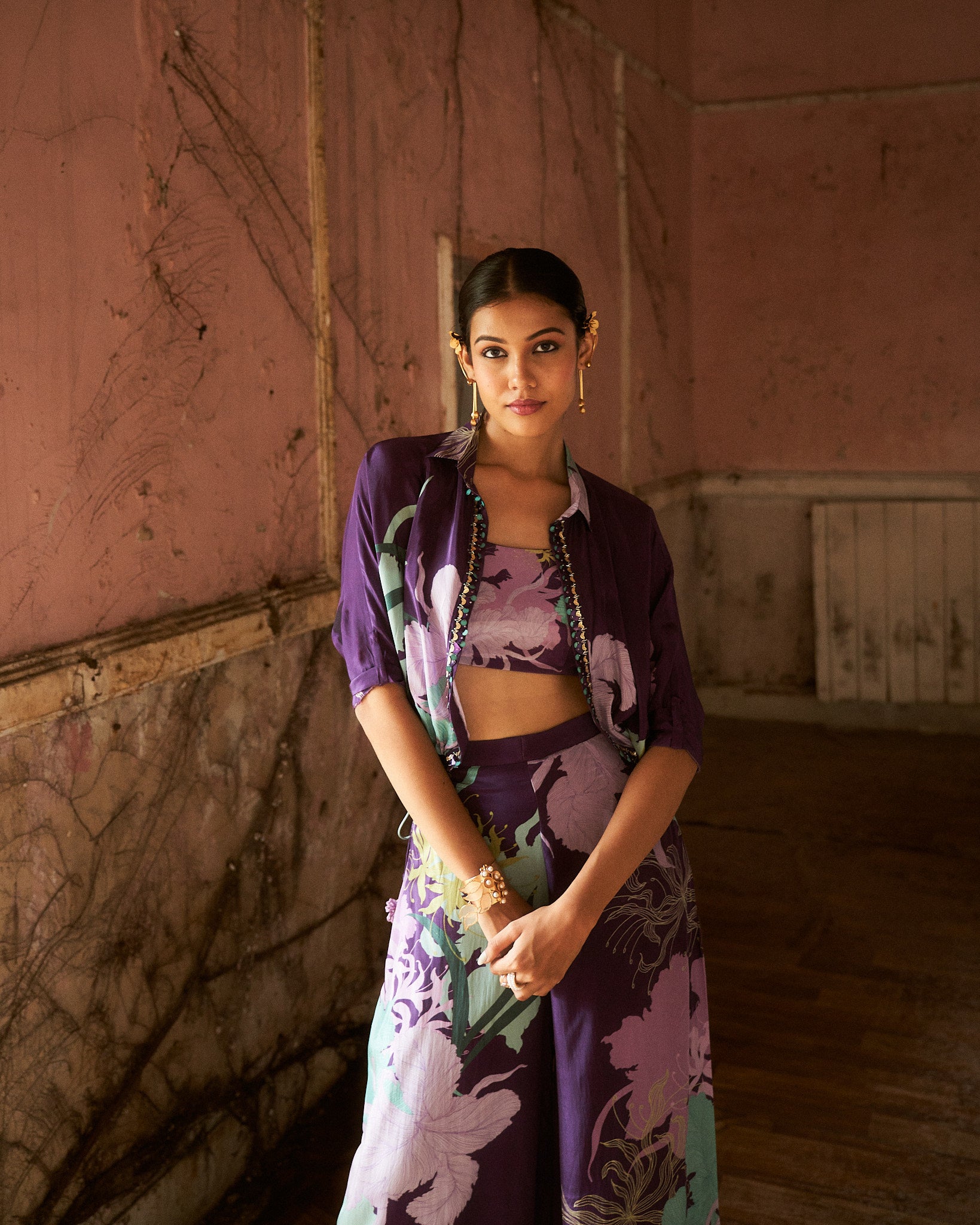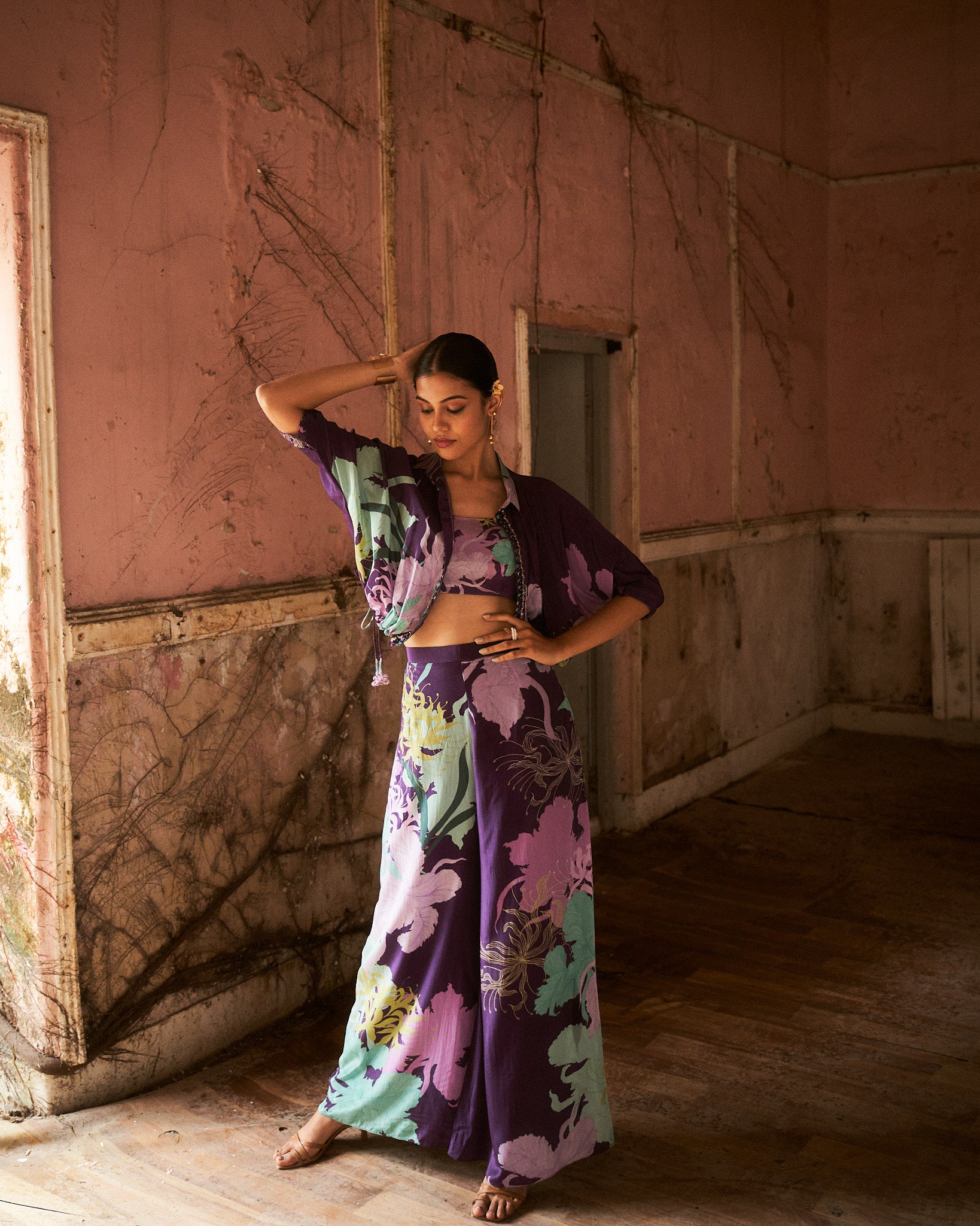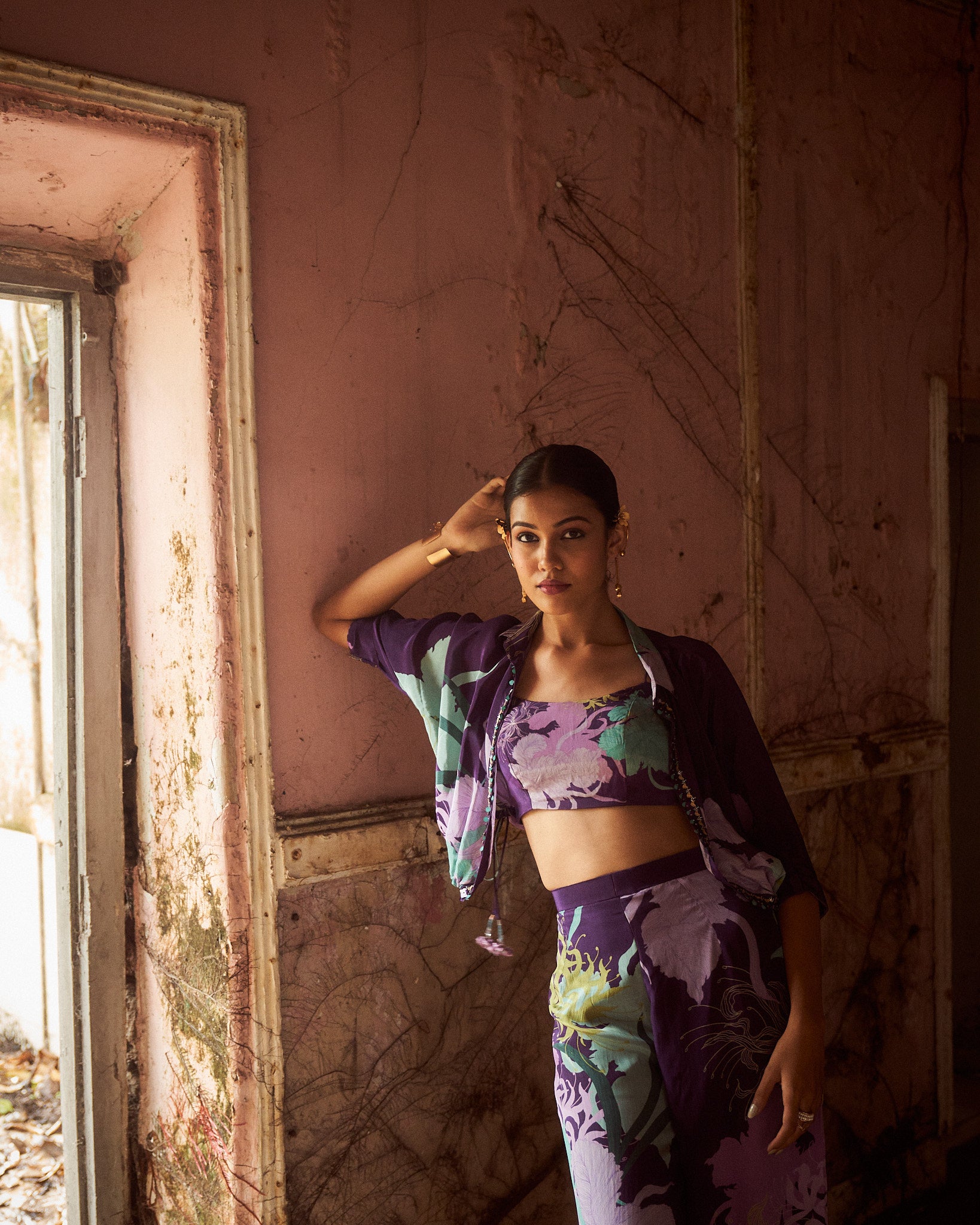 Printed purple jacket set comes with a jacket, crop top and pant embroidery work on the jacket with tassels.