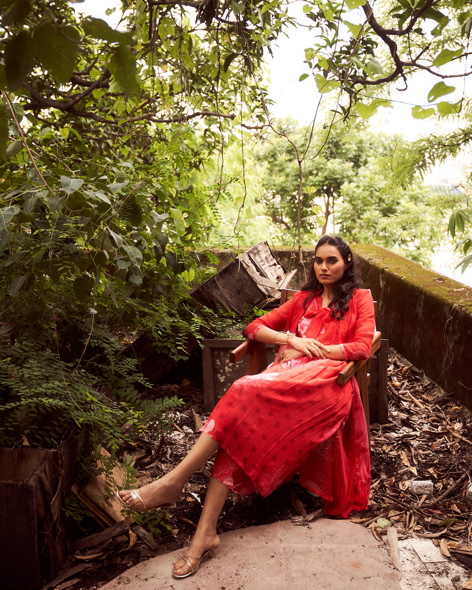Printed red jumpsuit comes with shrug , tie up embroidery on print
