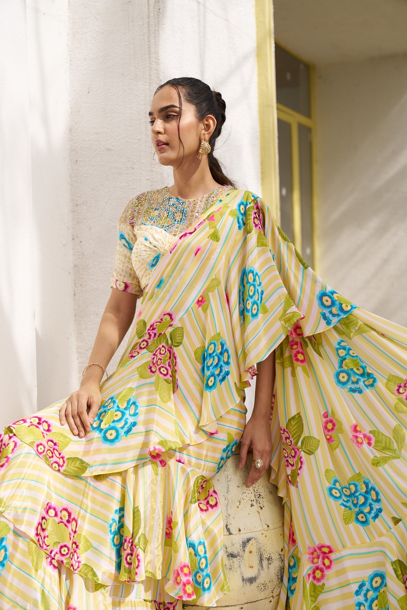 Floral printed and stripes layered skirt with ruffle drape saree with embellished blouse and belt