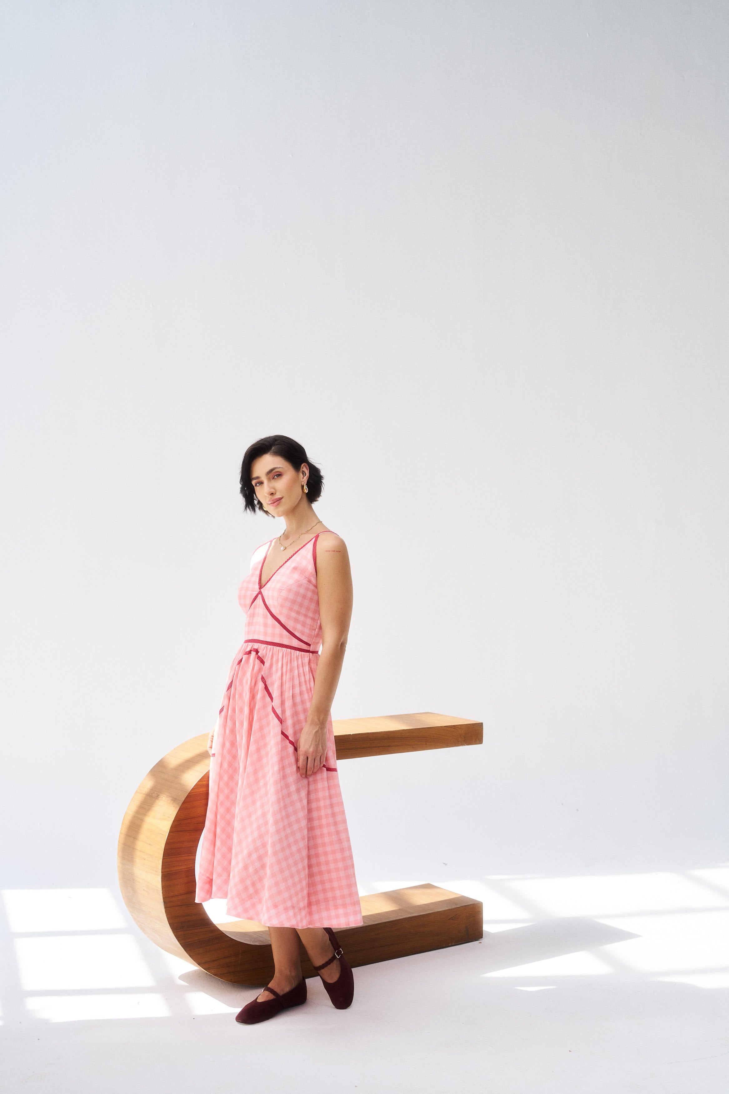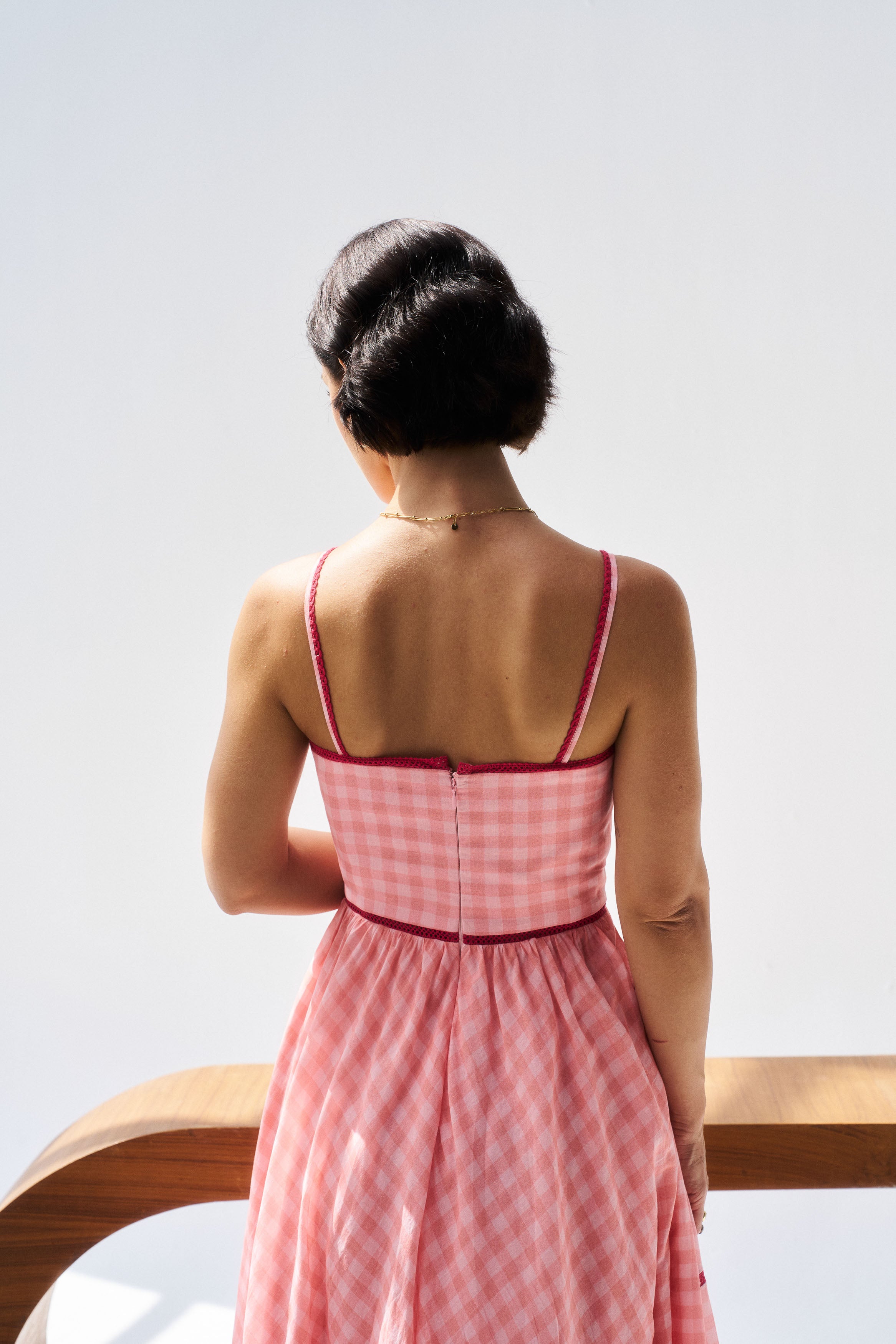 Description: A soft peach mul mul dress radiating relaxed elegance.