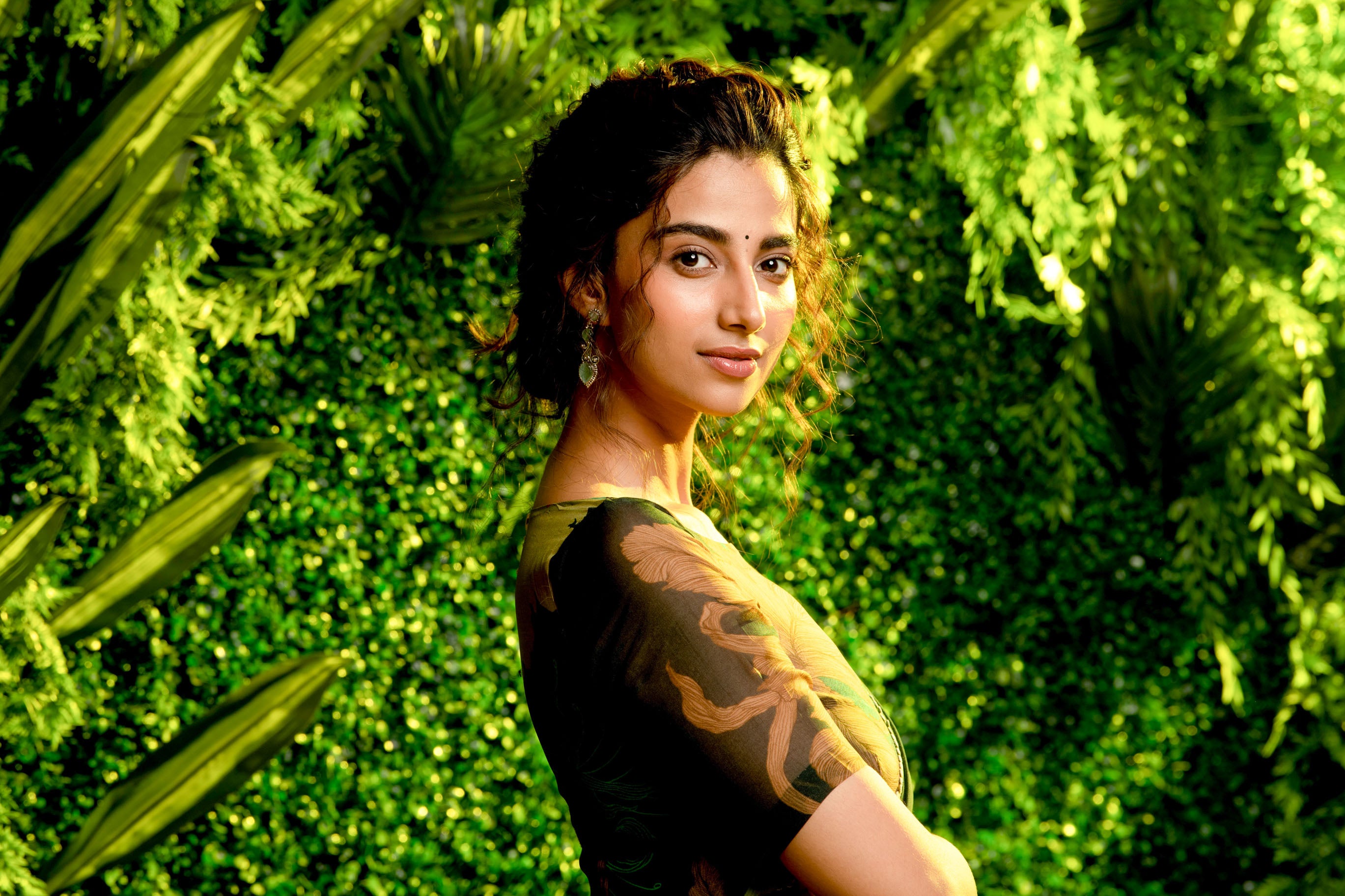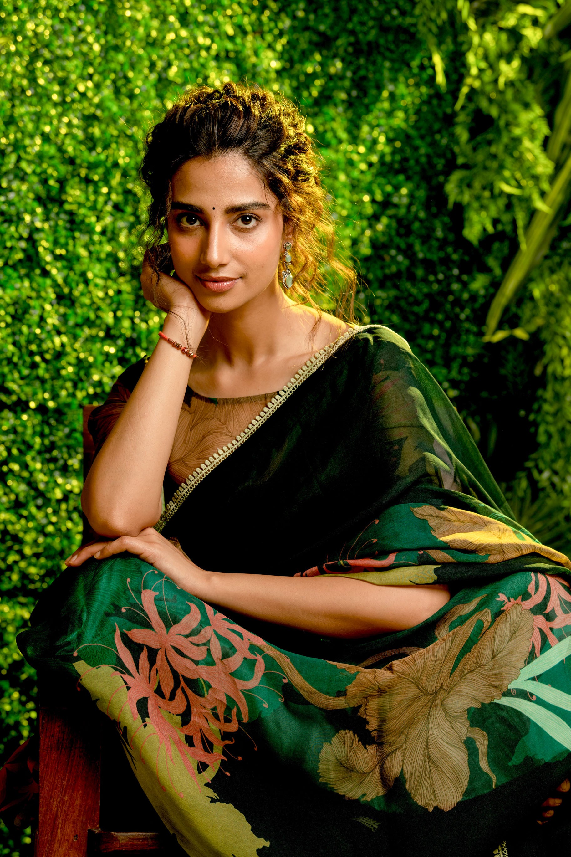 Description: Pine green floral saree with contrast cotton lace paired with high neck blouse