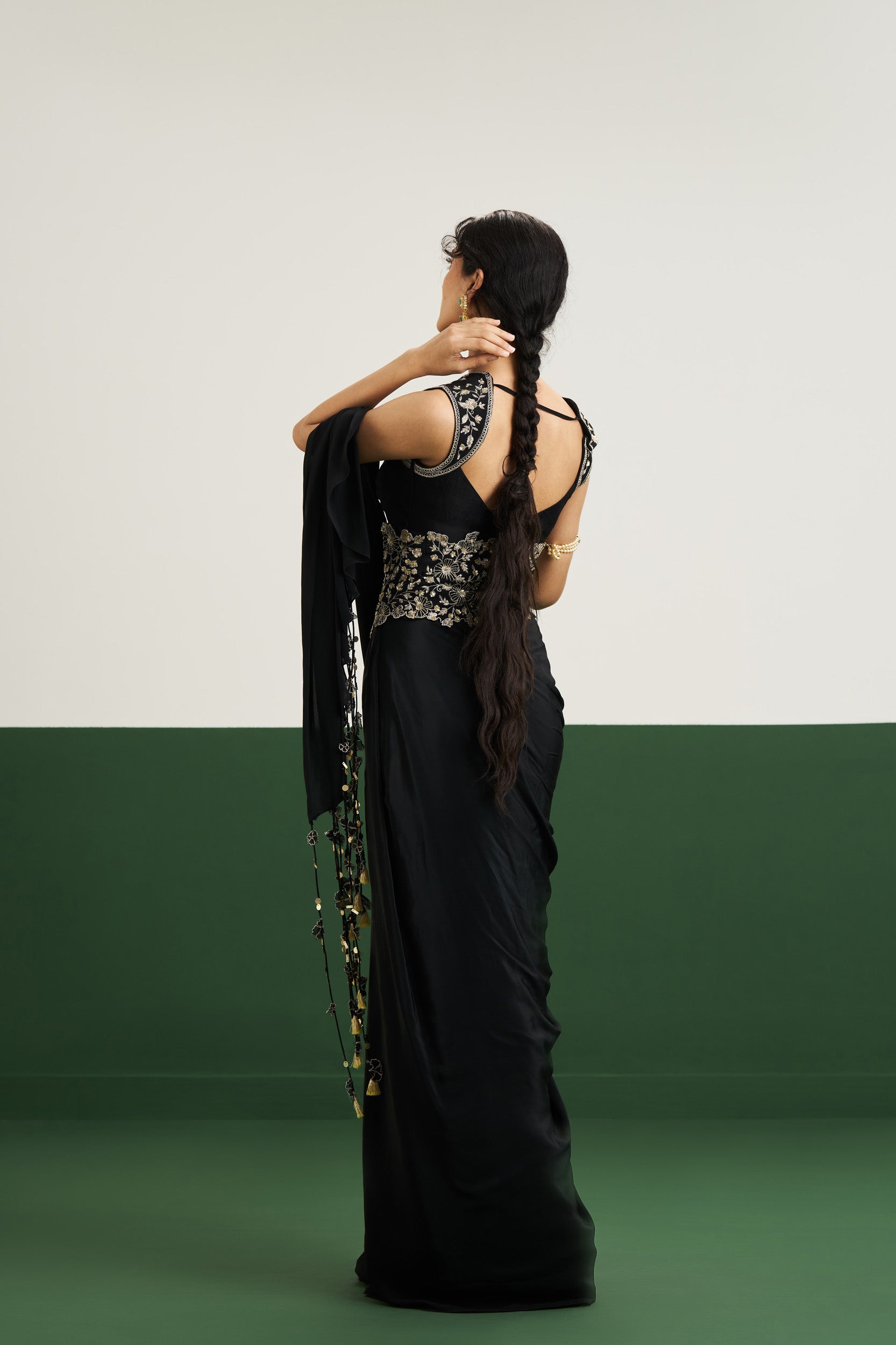 Description: A bold silhouette for the modern muse — the Haily Set features a structured corset and pre-draped black saree, redefining contemporary festive wear.