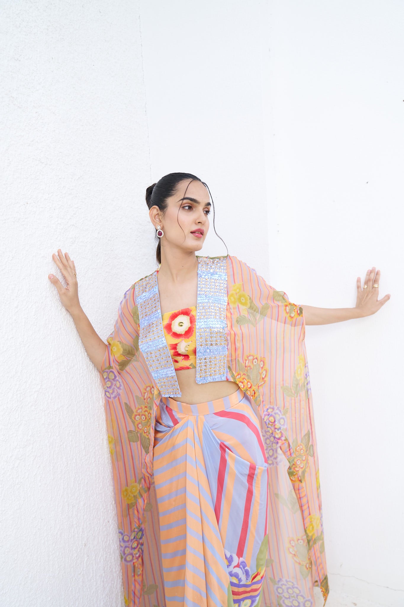 Printed floral and stripes drape skirt with crop top and embellished cape.