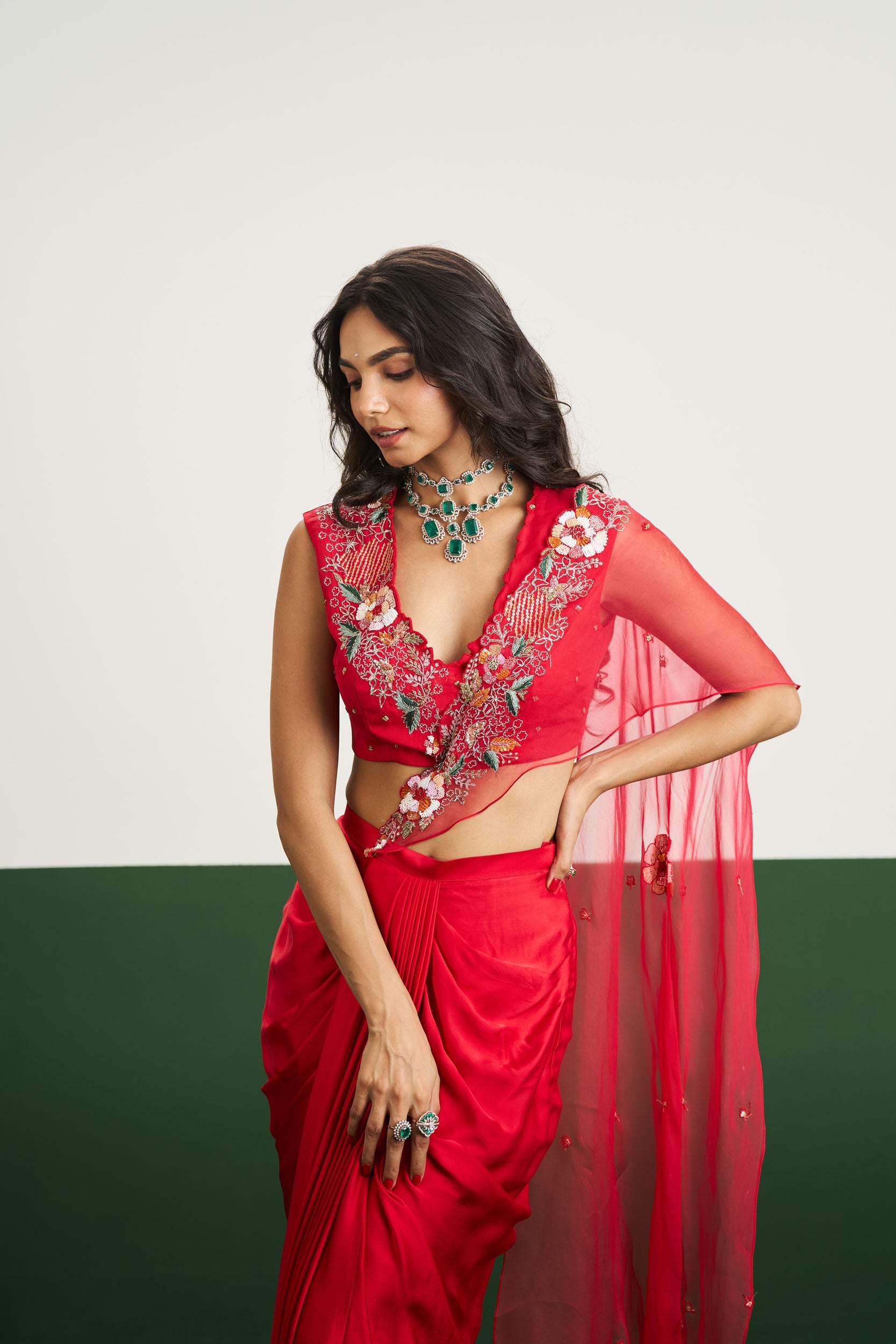 Description: The Isabel Set is a striking fusion of movement and structure — with a draped skirt and fitted blouse in a bold red, it’s made for the spotlight.
