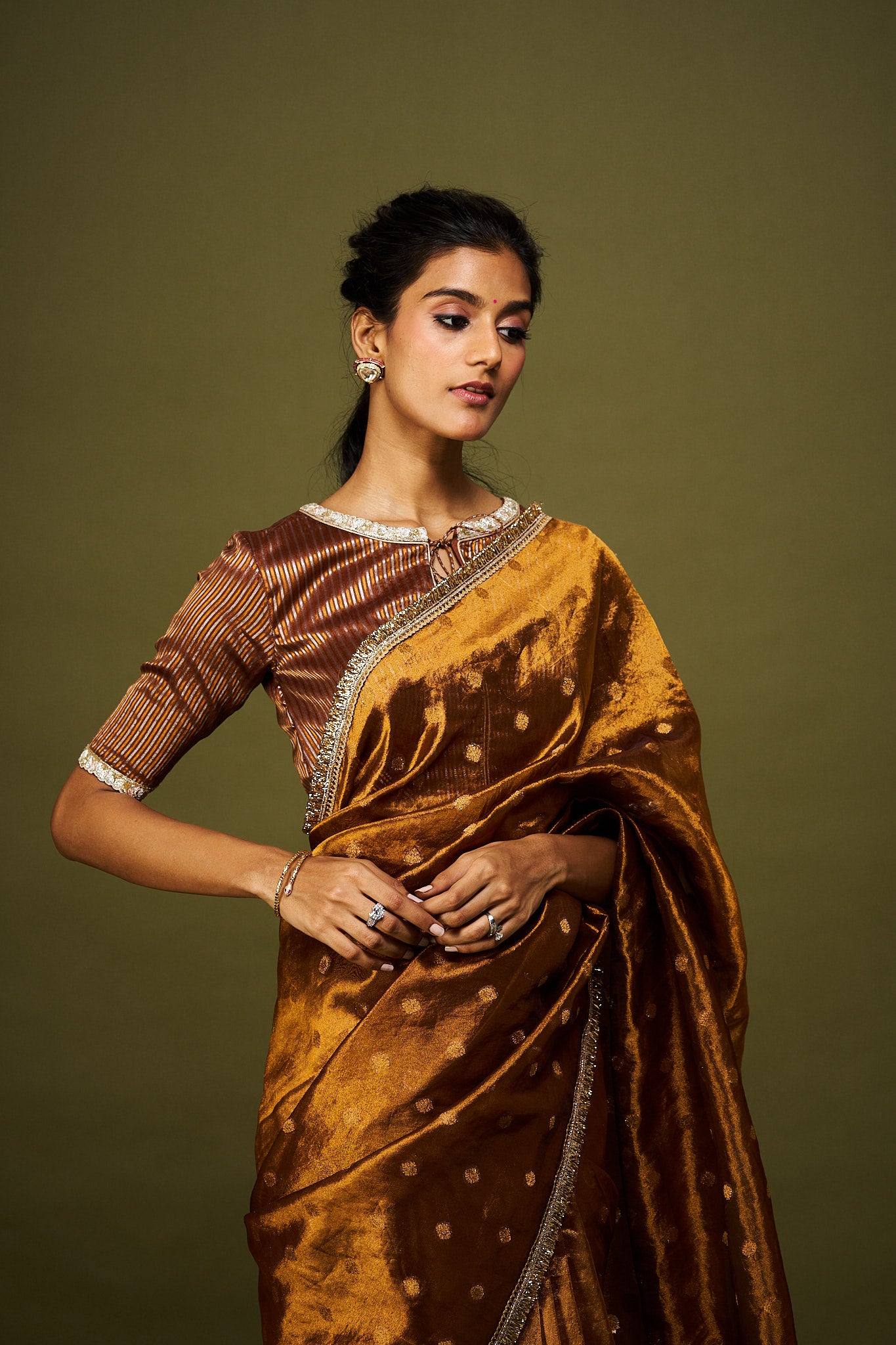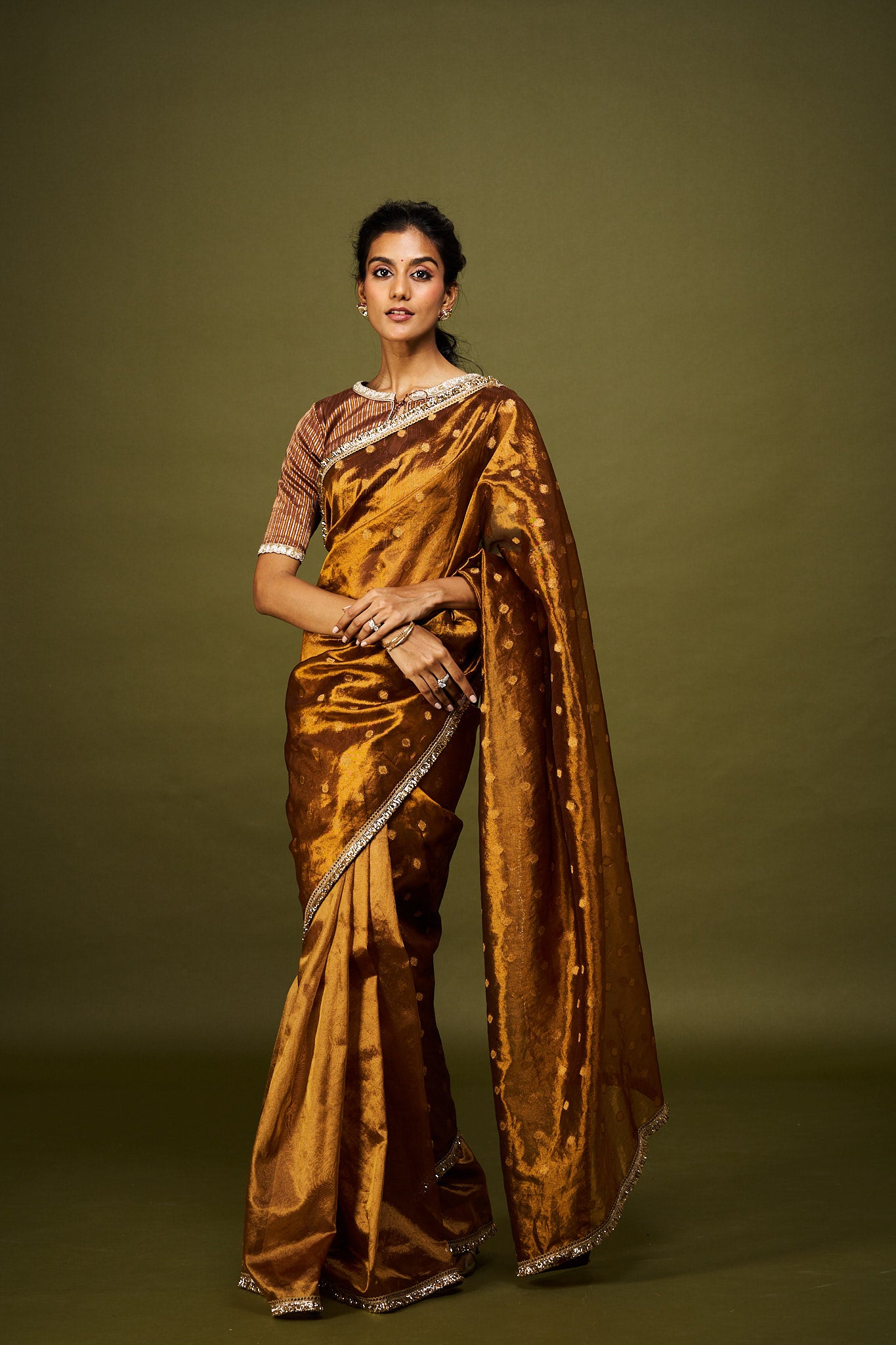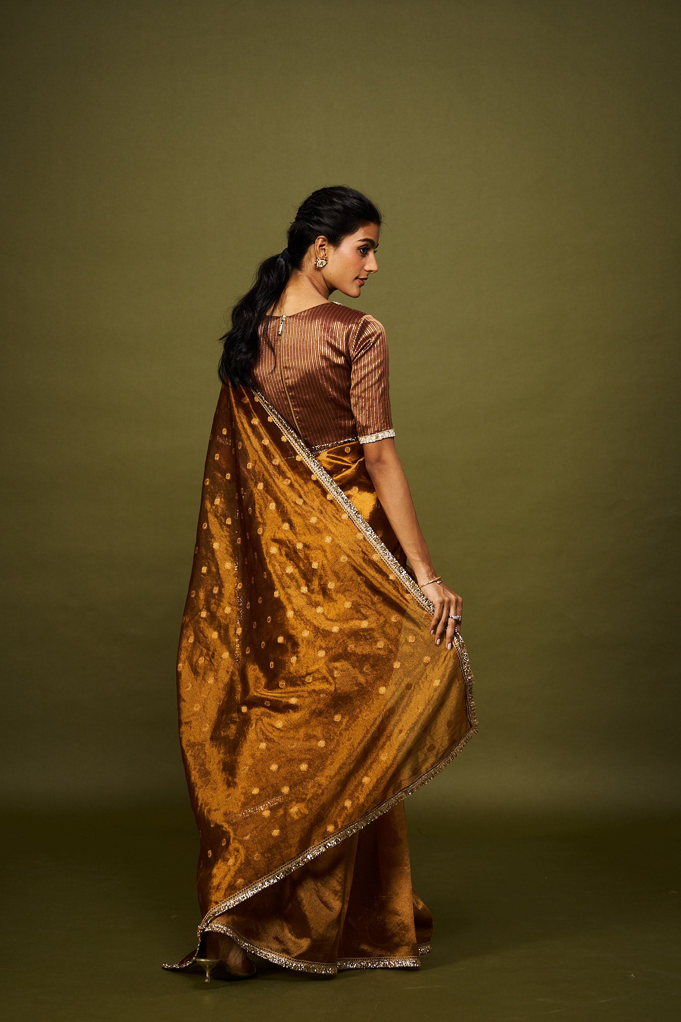 An exquisite chocolate brown tissue saree set from our Moh 4.0 collection, crafted with elegance and modern charm. Perfect for festive and wedding occasions.