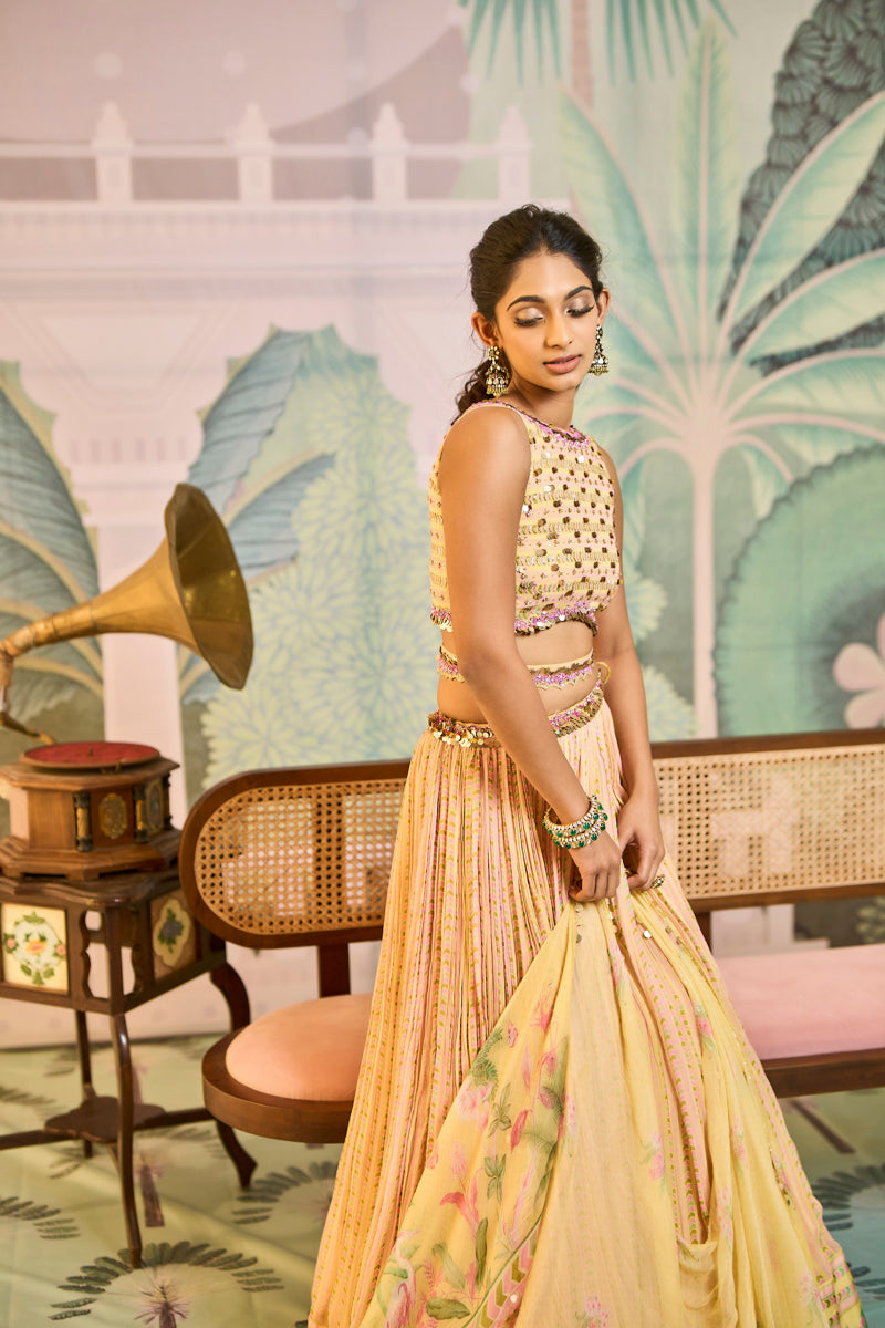 If escaping into a fantasy sounds like a good idea, then this Urmi lehenga set is exactly what you need. The three-piece ensemble - a crop top, pants and a translucent Dupatta.