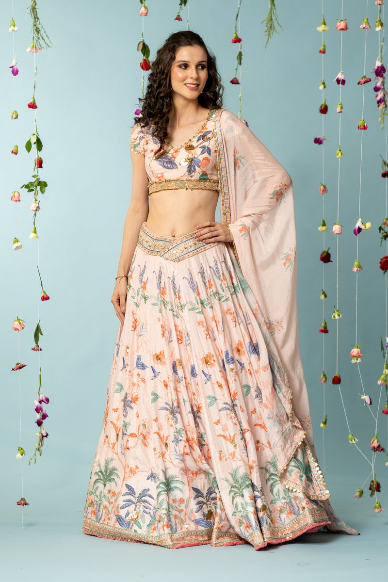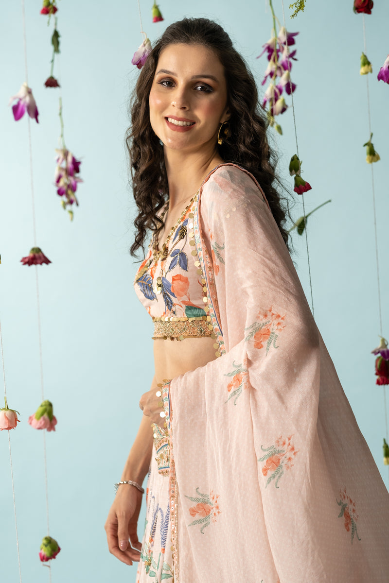 If escaping into a fantasy sounds like a good idea, then this Leona lehenga set is exactly what you need. The three-piece ensemble - a crop top, pants and a translucent Dupatta.