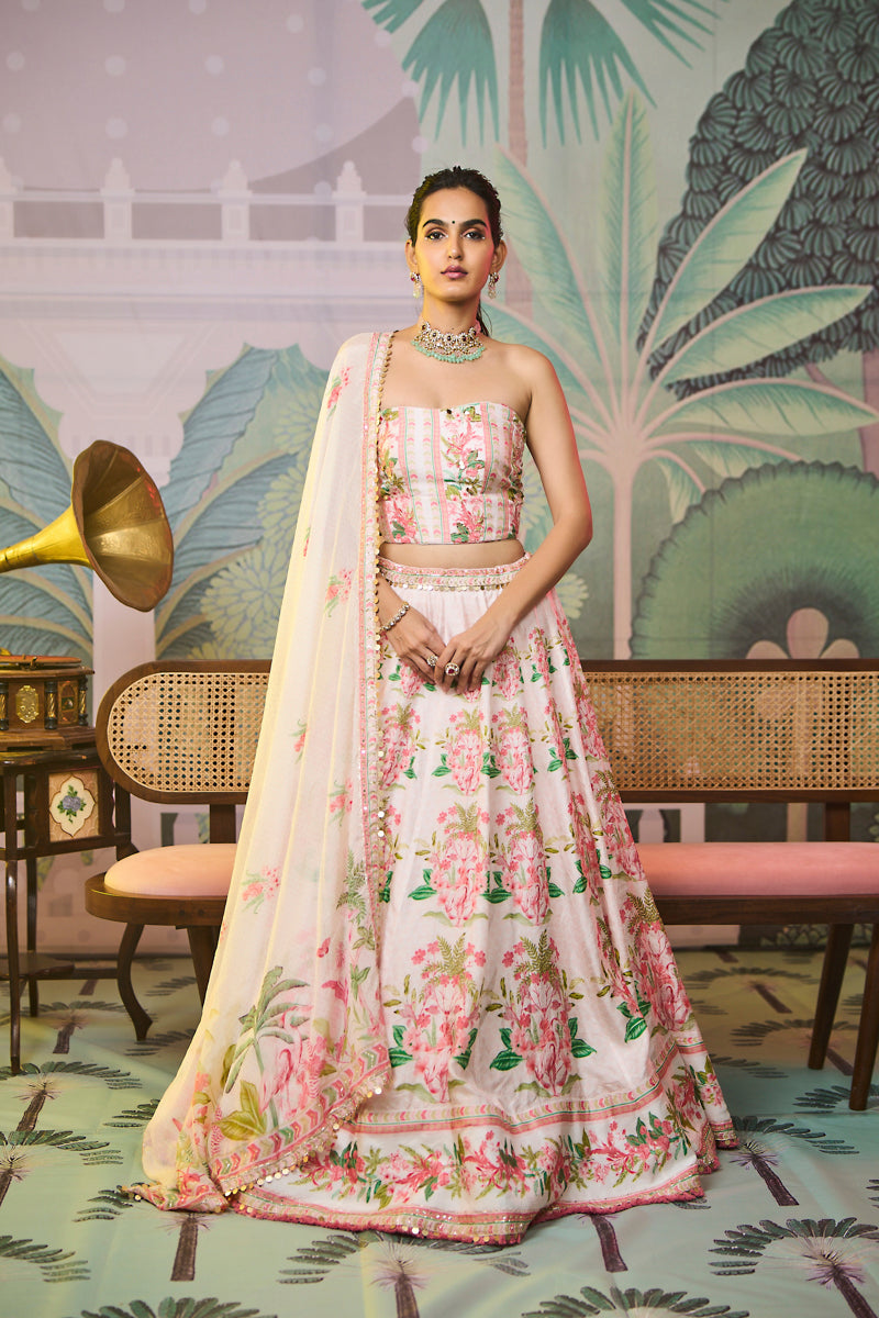 If escaping into a fantasy sounds like a good idea, then this Leona lehenga set is exactly what you need. The three-piece ensemble - a crop top, pants and a translucent Dupatta.