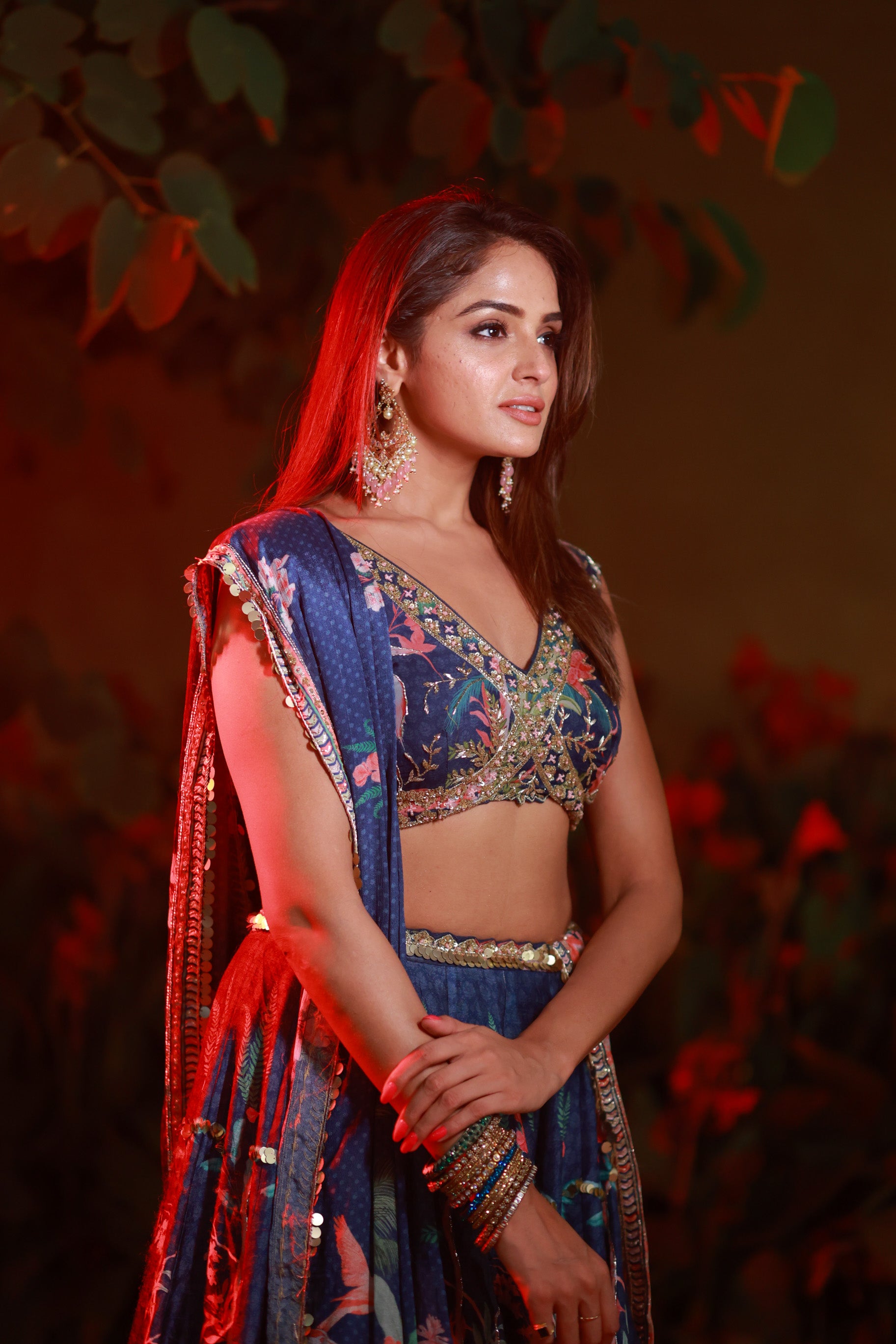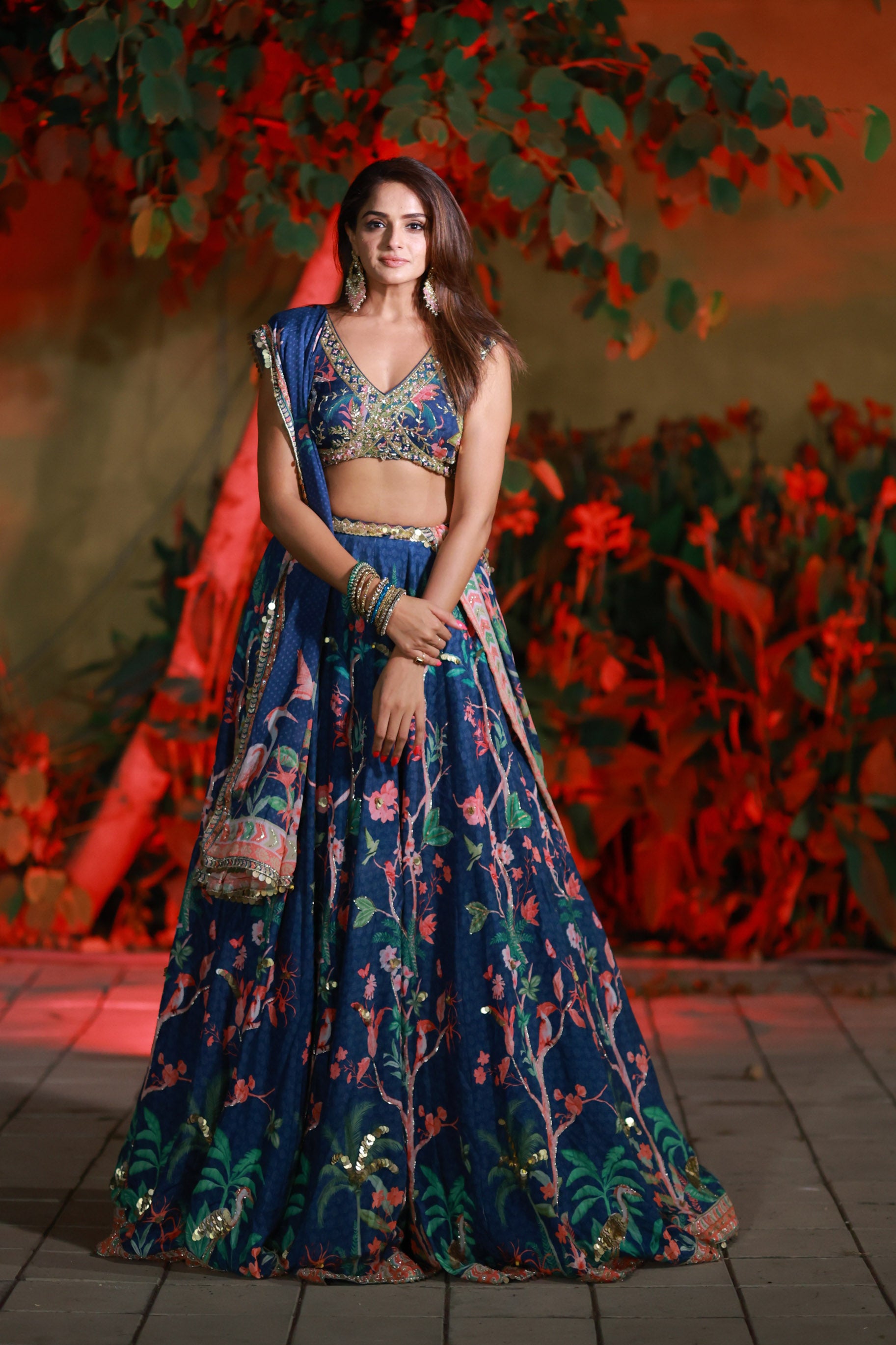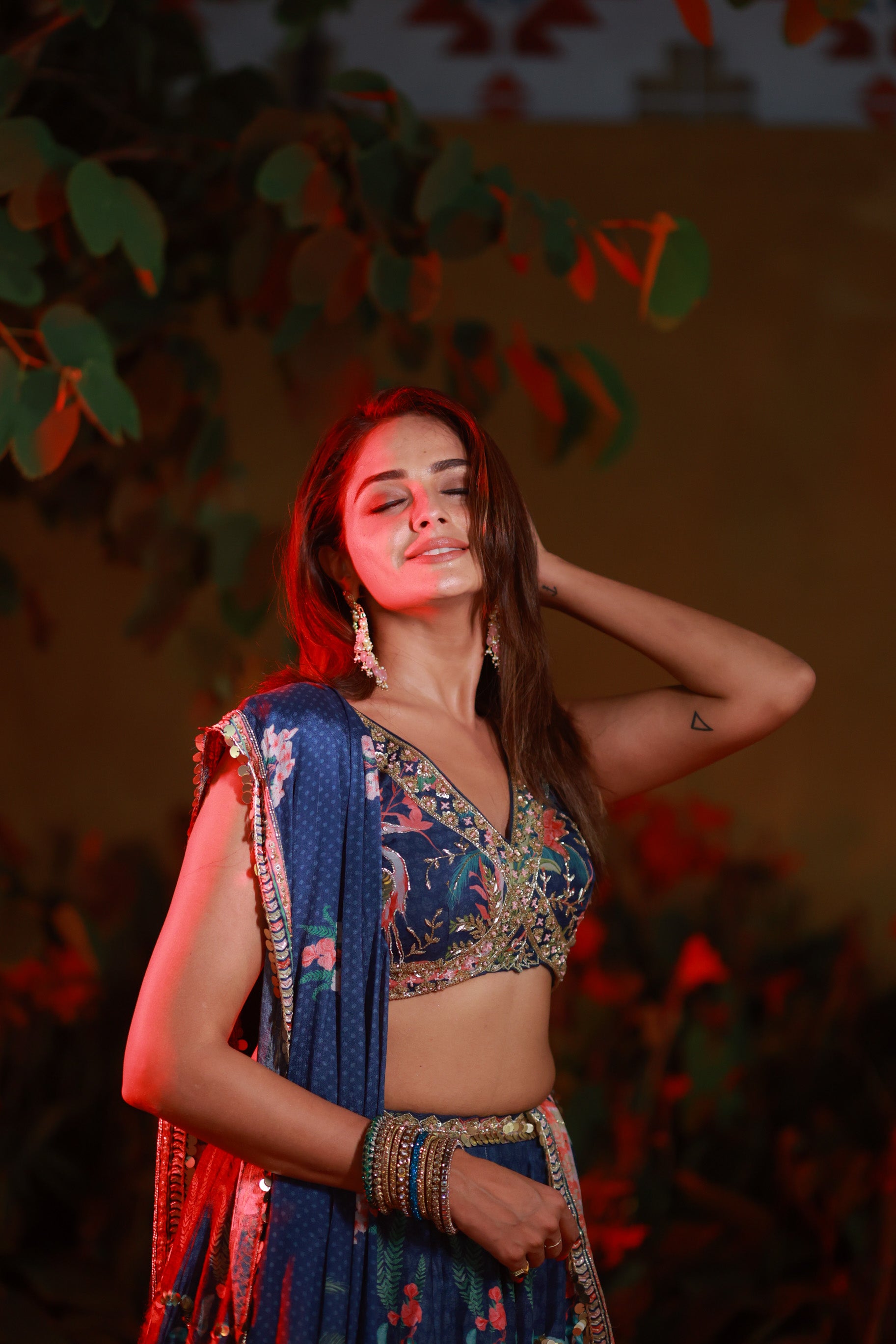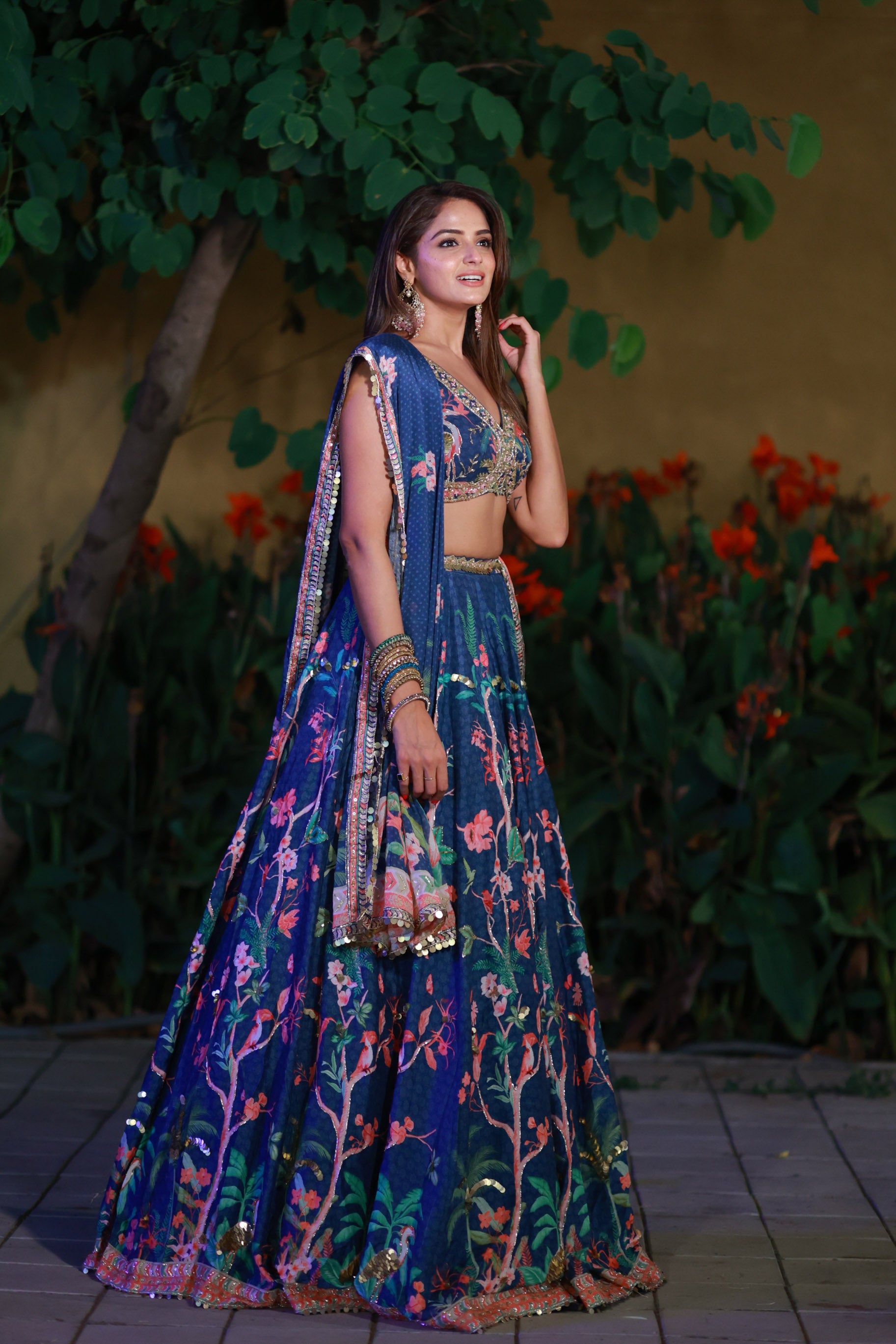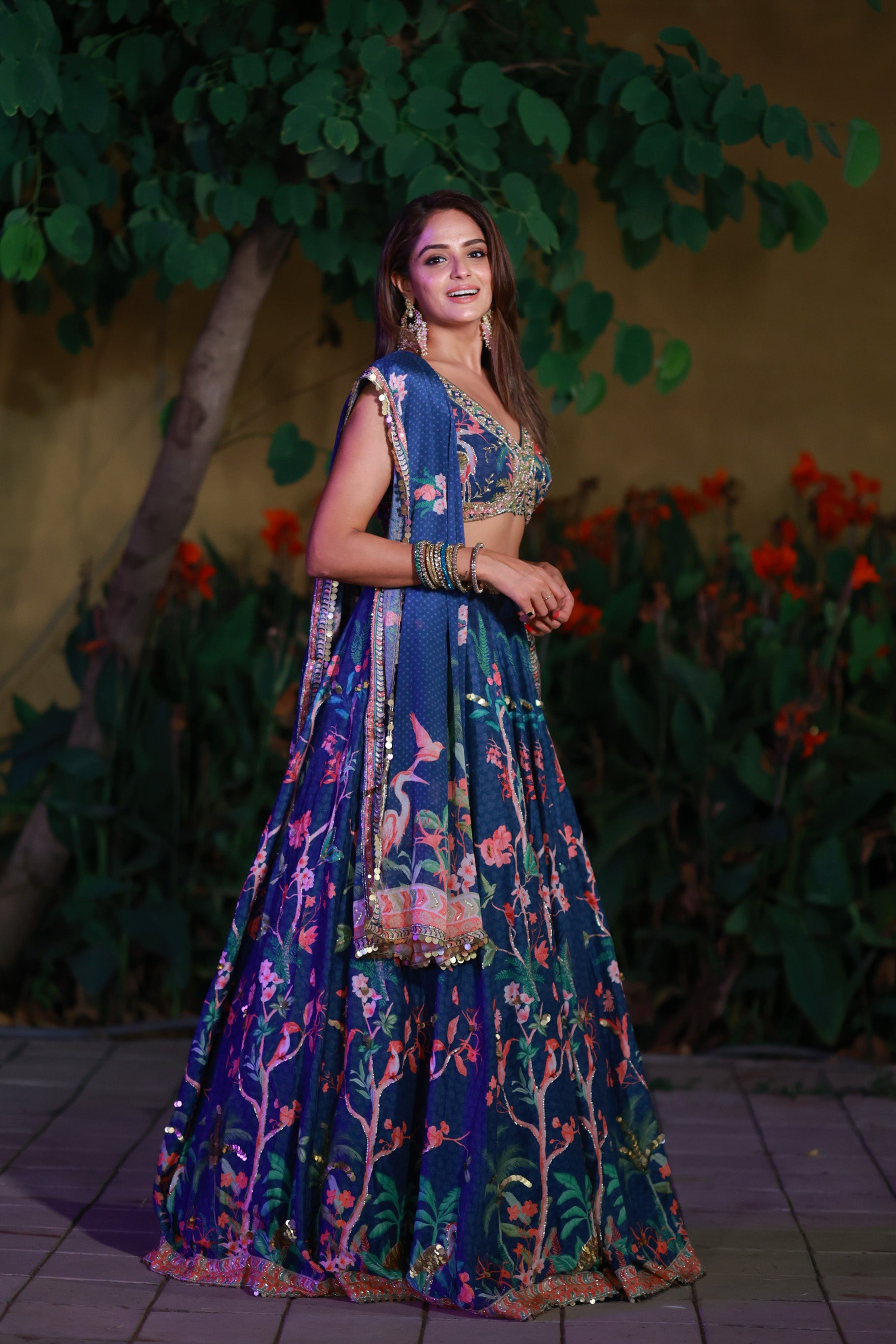If escaping into a fantasy sounds like a good idea, then this Leona lehenga set is exactly what you need. The three-piece ensemble - a crop top, pants and a translucent Dupatta.