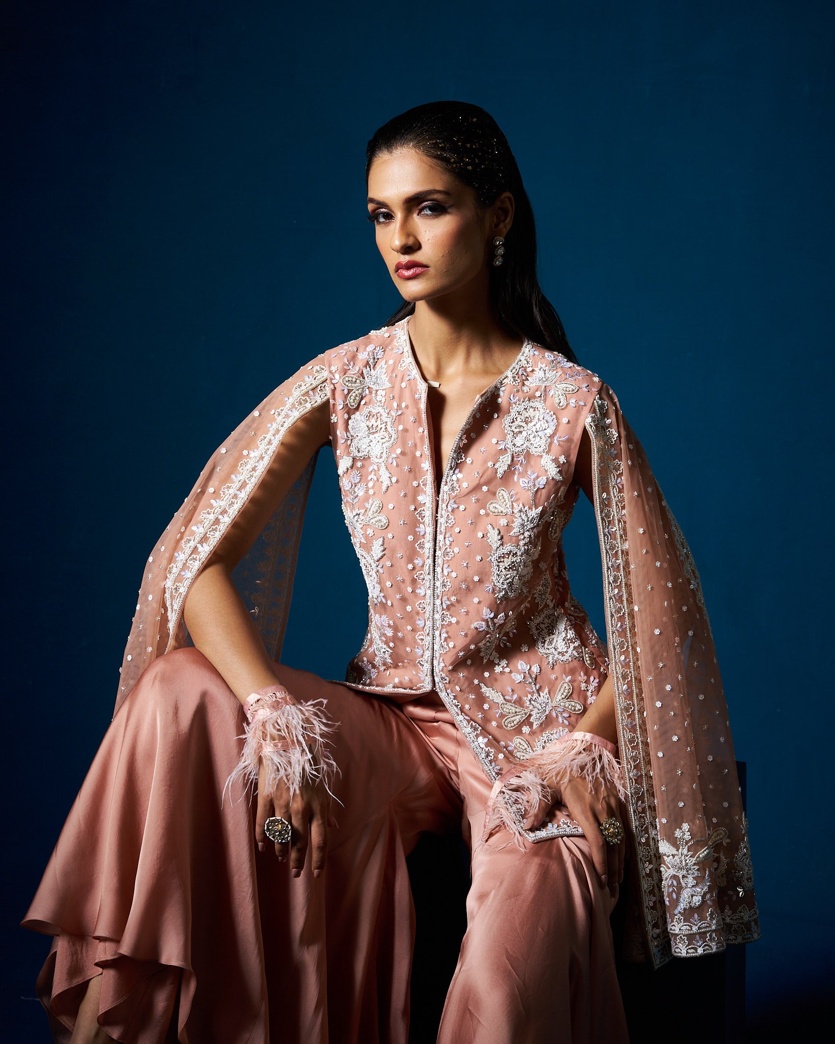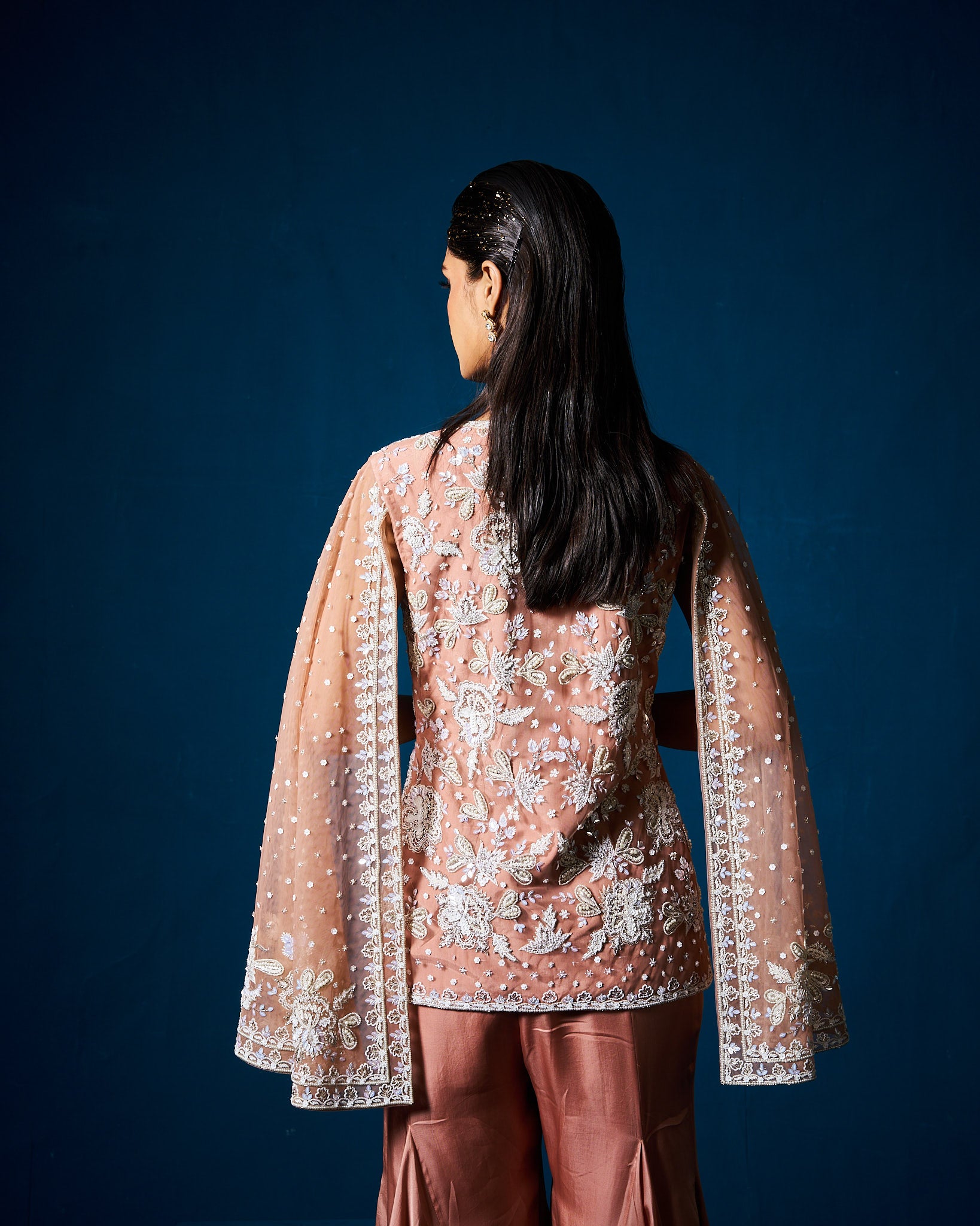 Description: This mocha beige jacket set comes with plane sharara pant and heavy pearl and cutdana work net jacket.