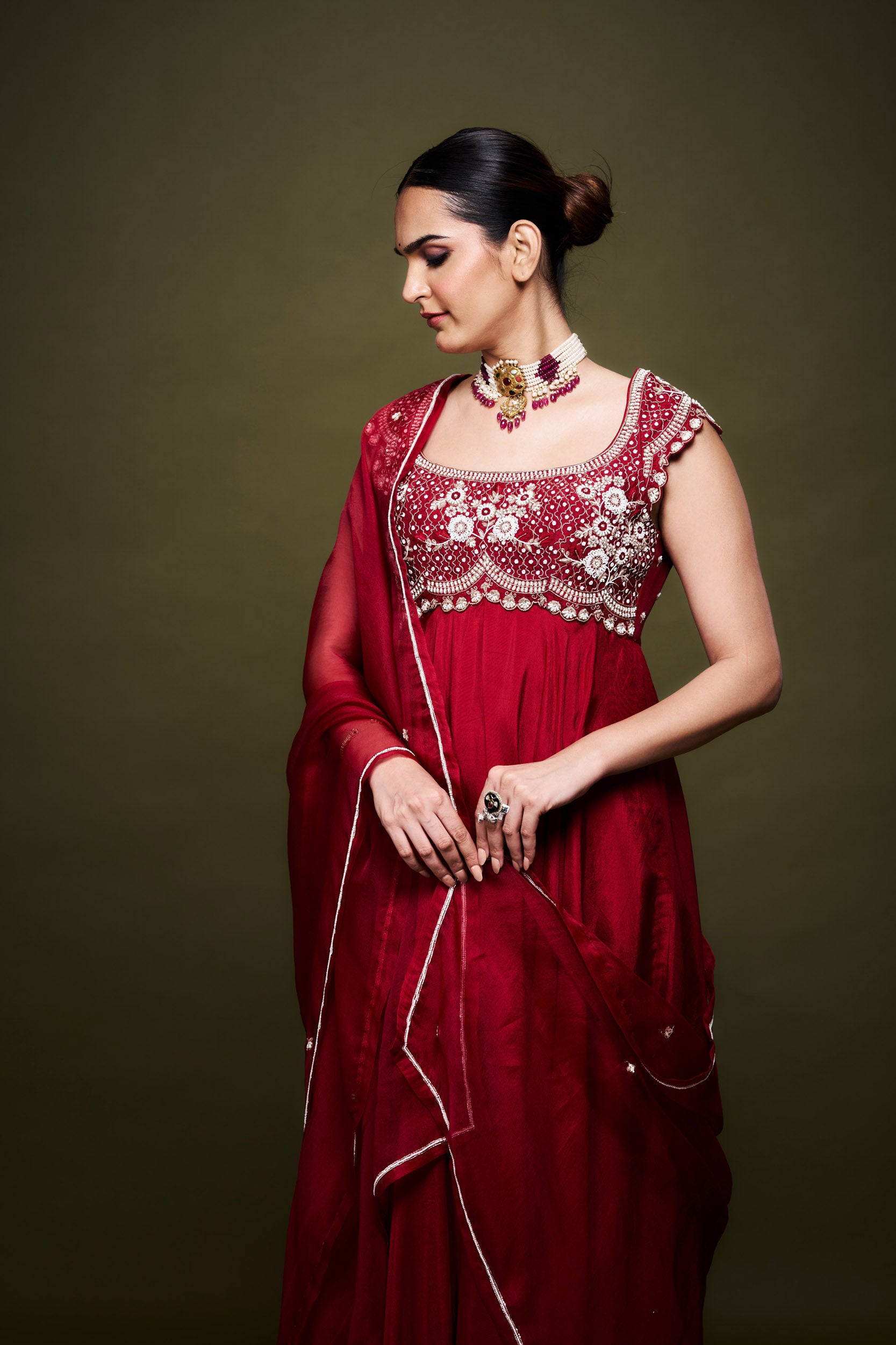 Description: This is a Cherry Red dress with heavy pearl & zardozi hand embroidered work & dupatta with pearl & sequins work.
