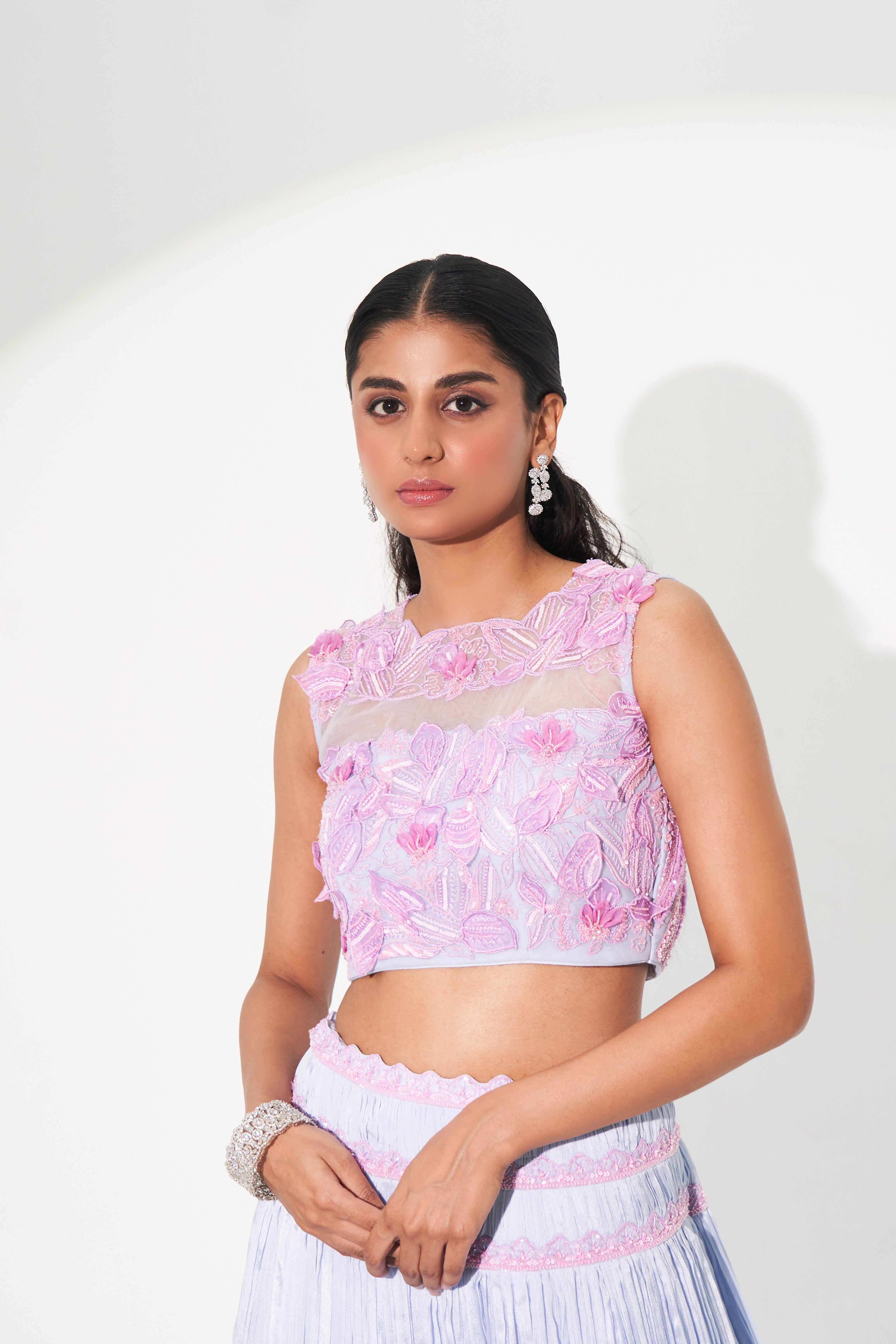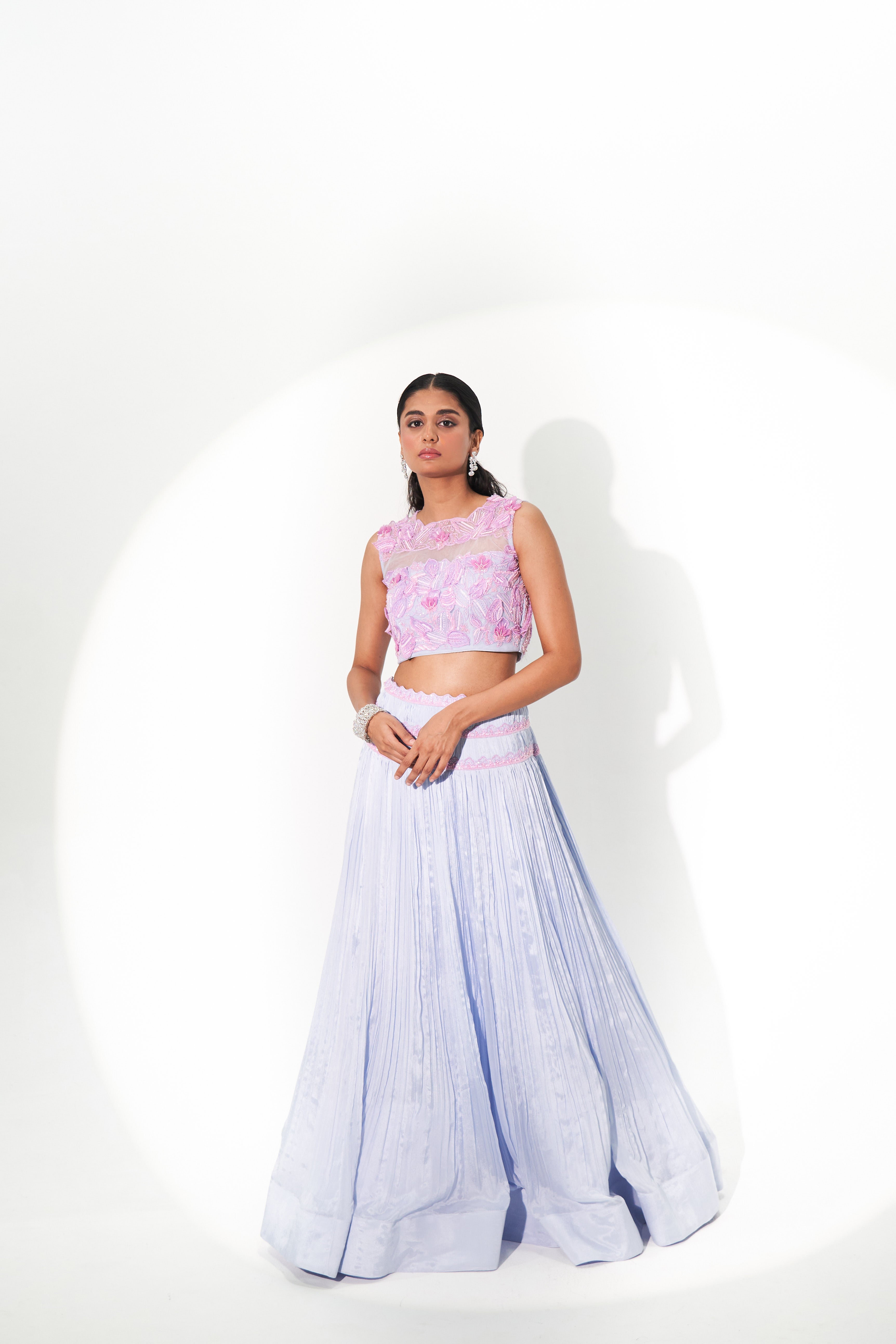 Description: Pale blue lehanga set comes with a lehanga and blouse with sleeveless and closed neckline. Embroidery: pink colour cutwork, crystal and beaded emboidery. Fabric: chiffon
