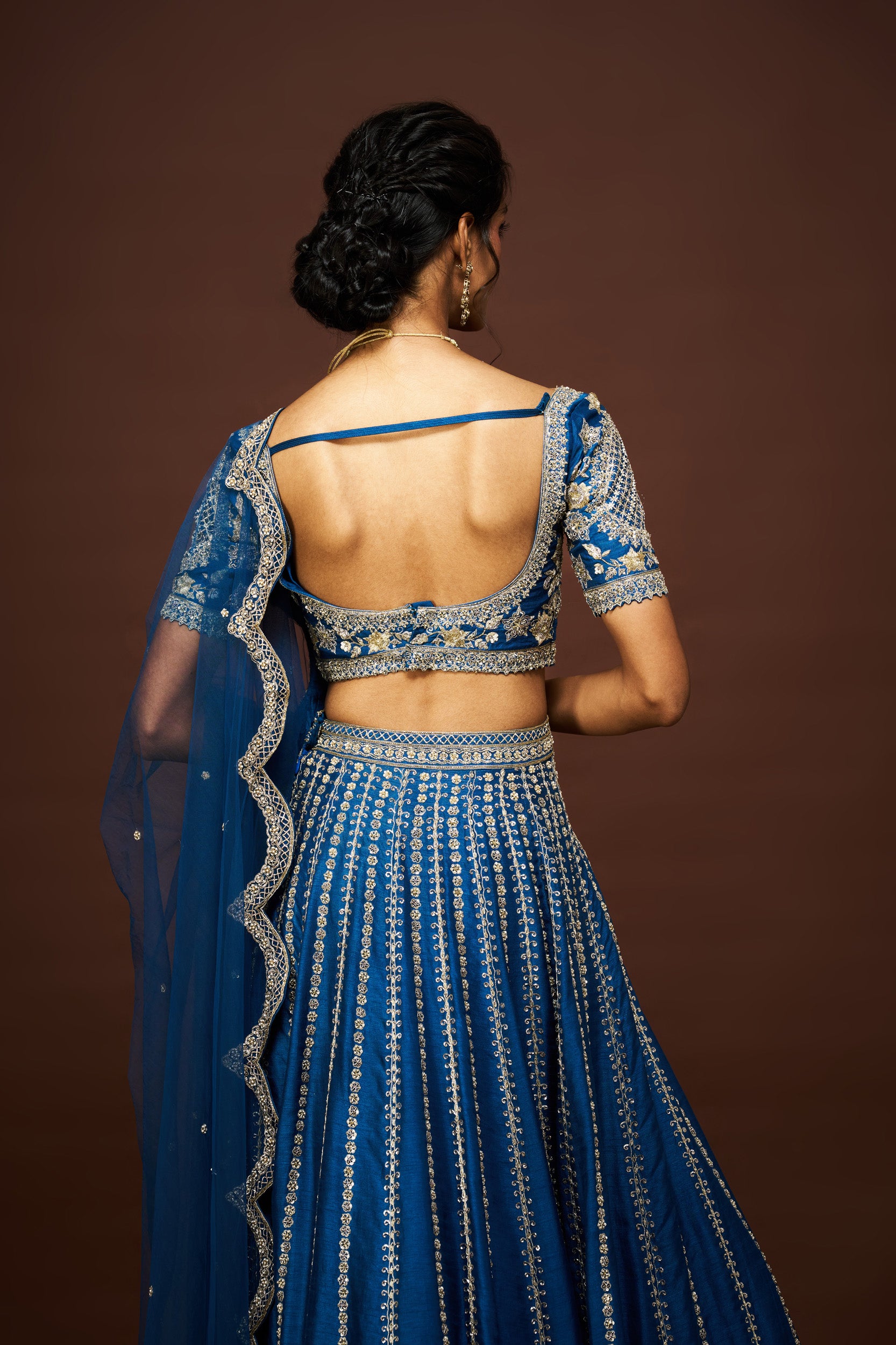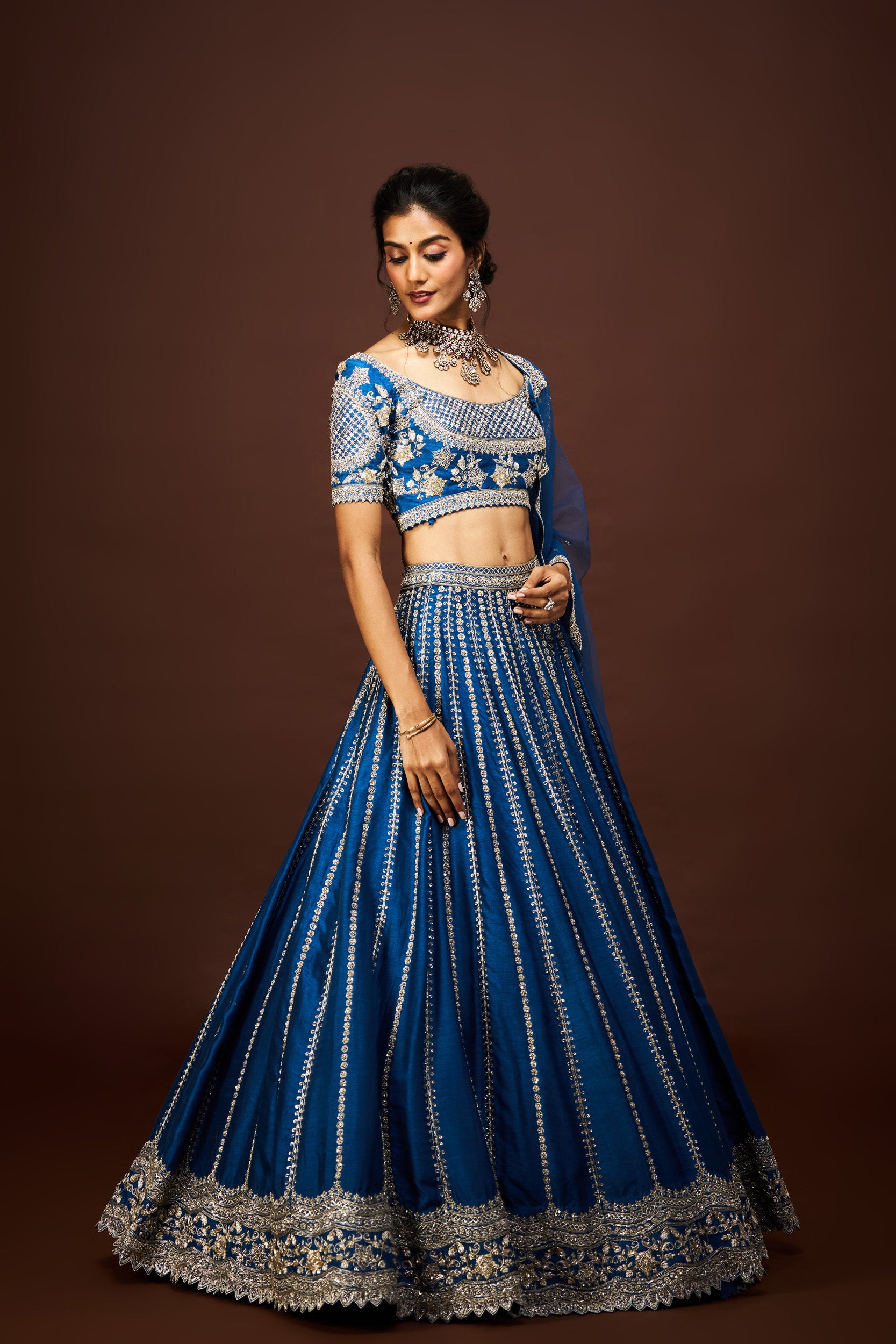 Description: Inspired by the elegance of peacocks, this lehenga shines in peacock blue with rich textures, making it a timeless festive statement.