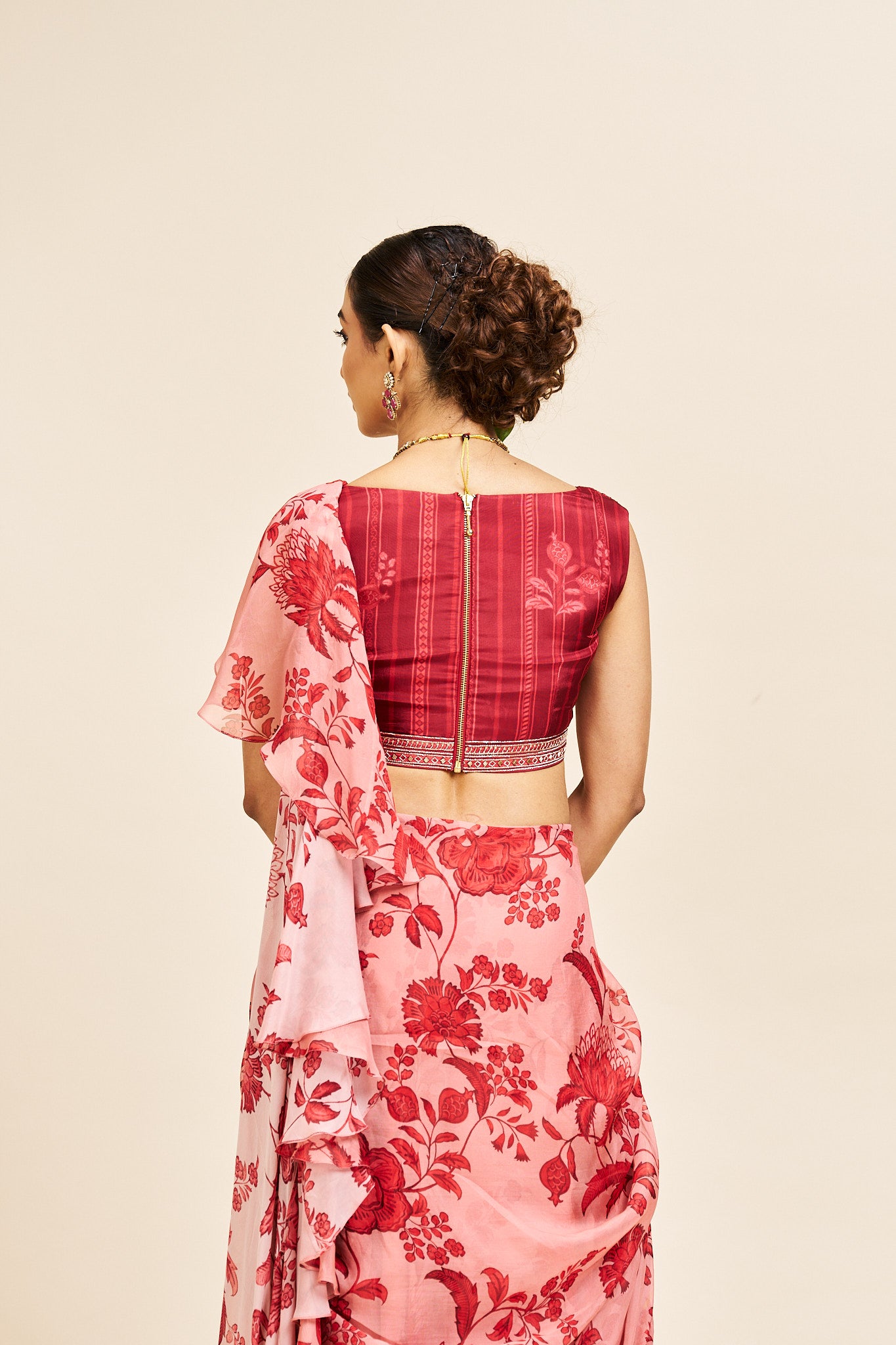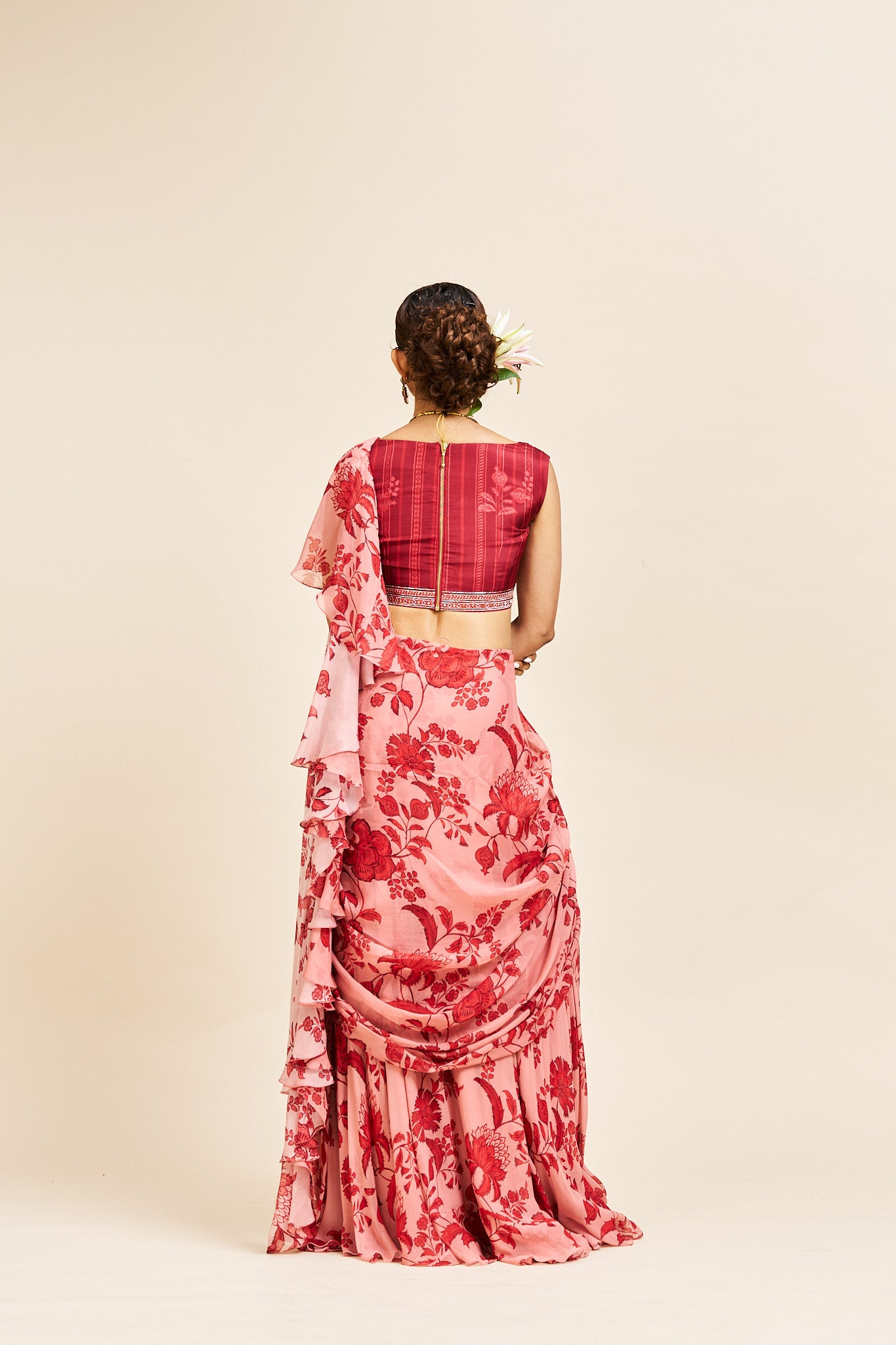 Description: Bold red drape saree set designed for a sleek, modern silhouette.
