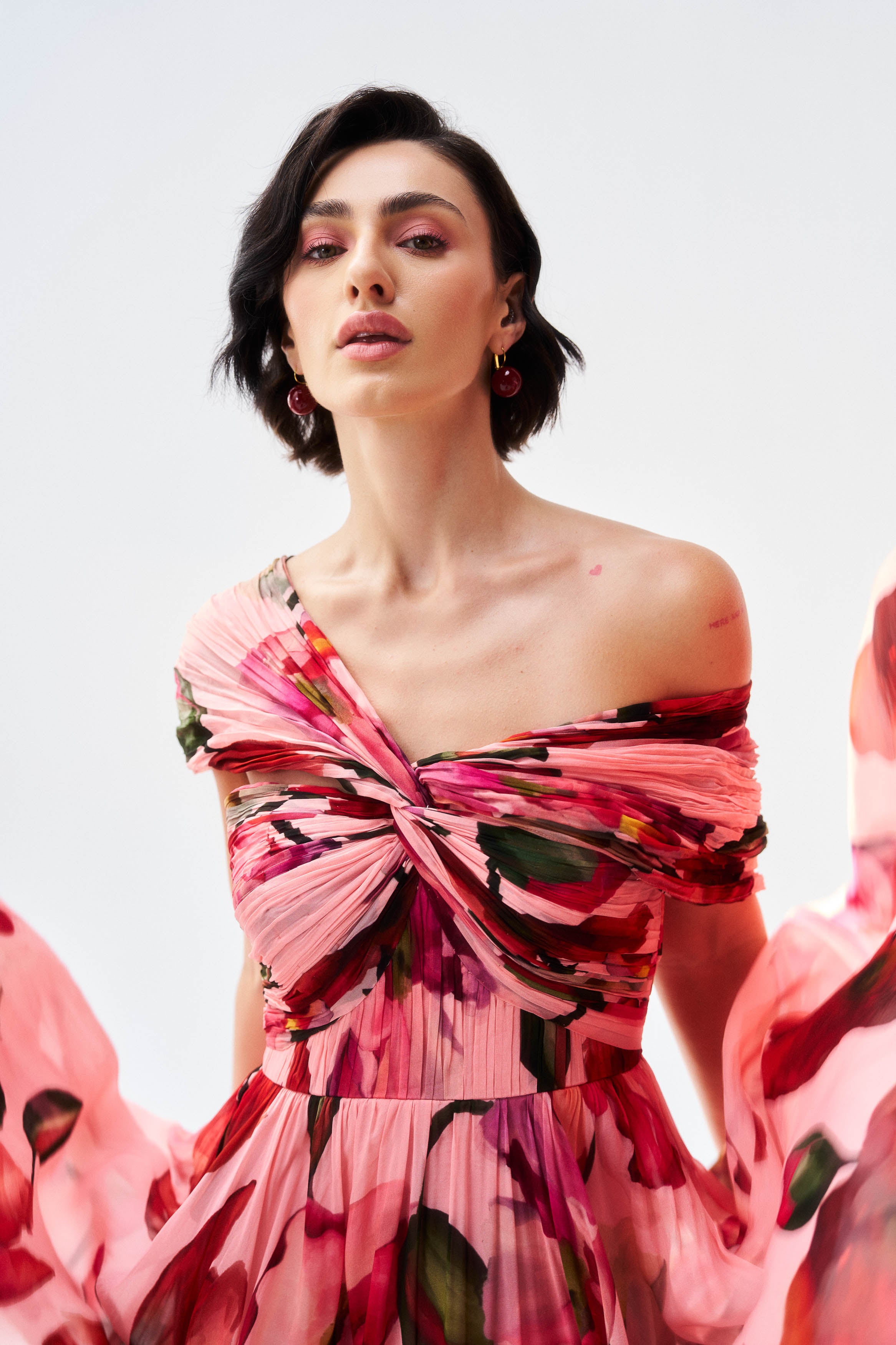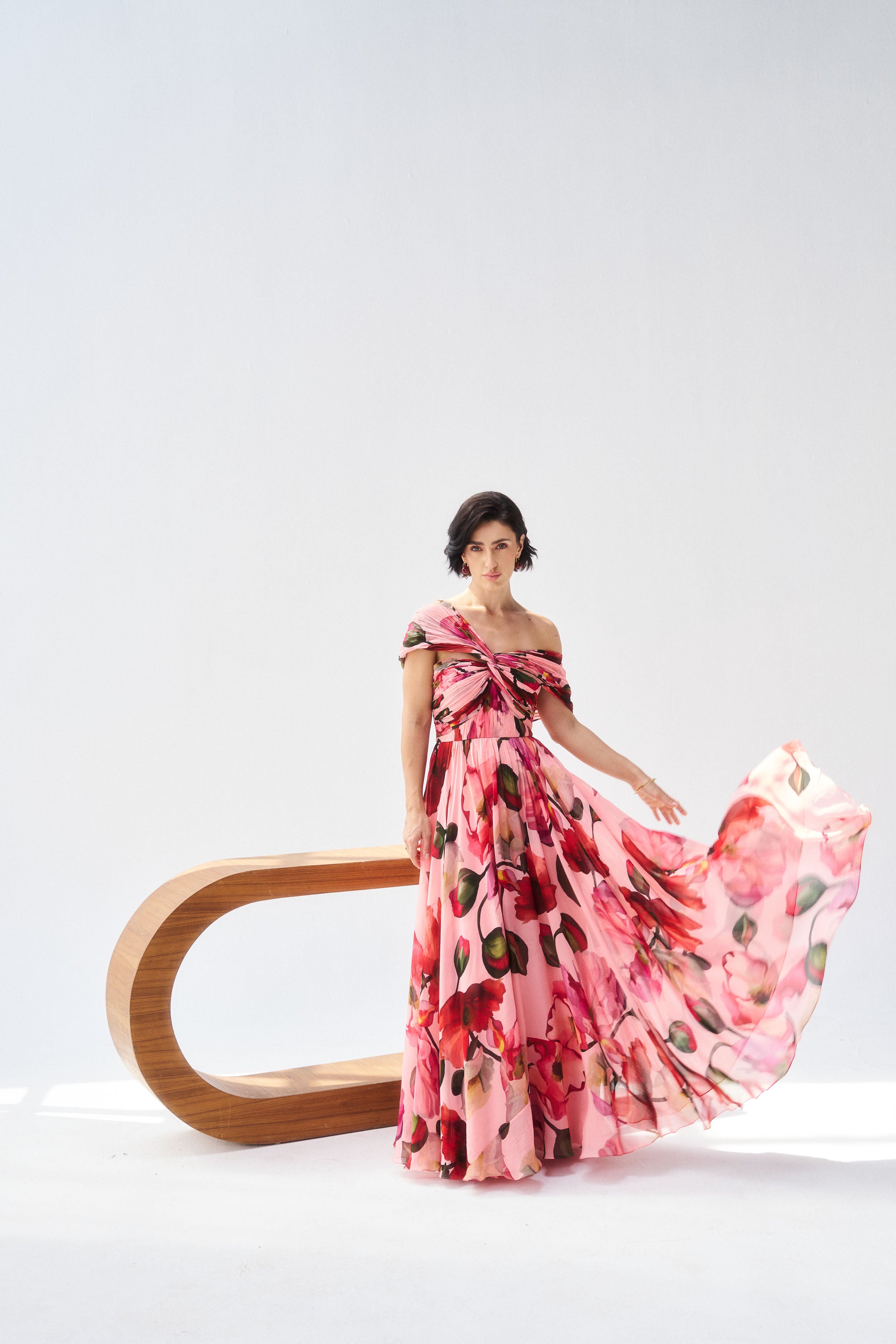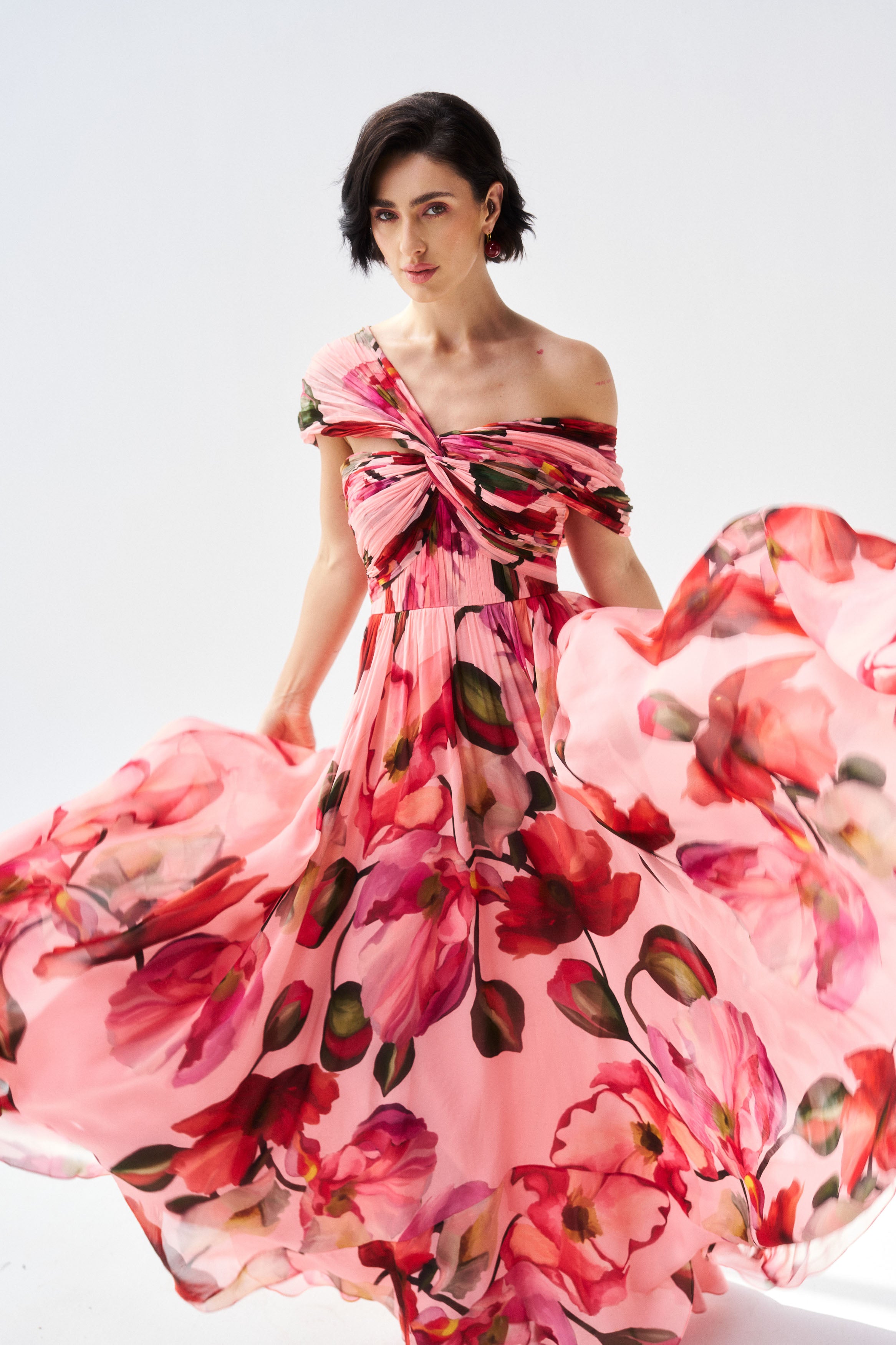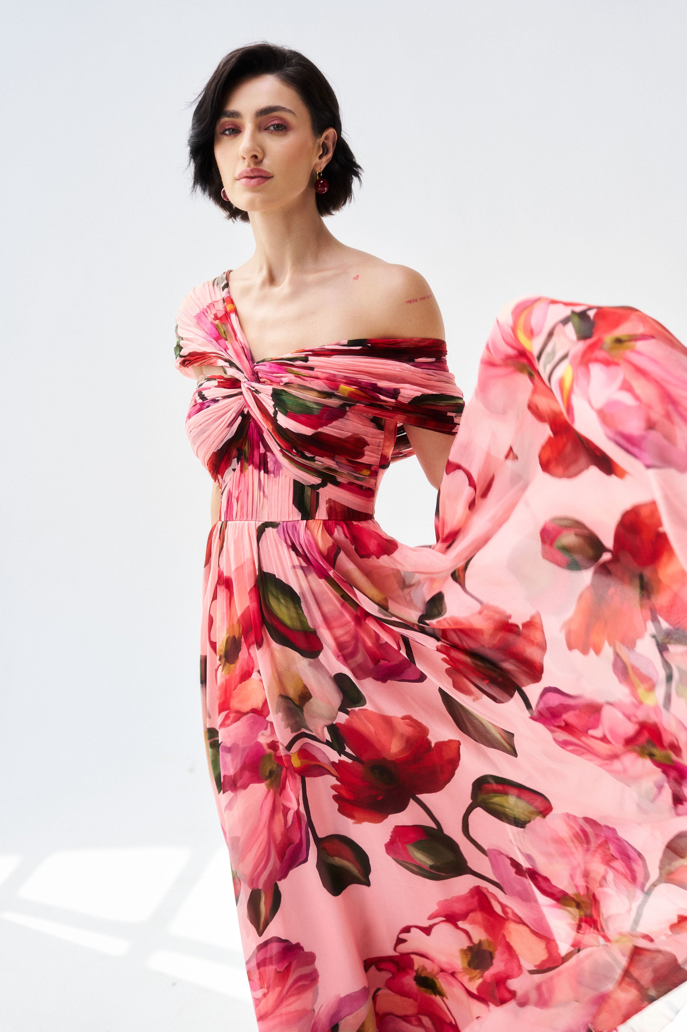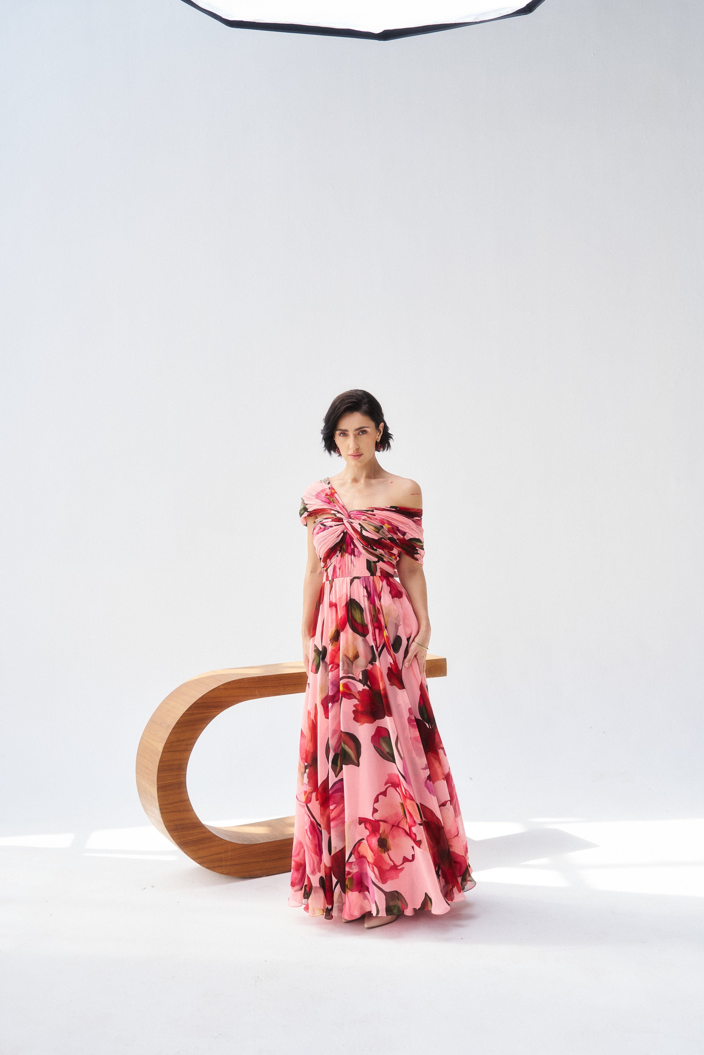 Description: A luminous peach mul mul dress crafted for soft festive glamour.