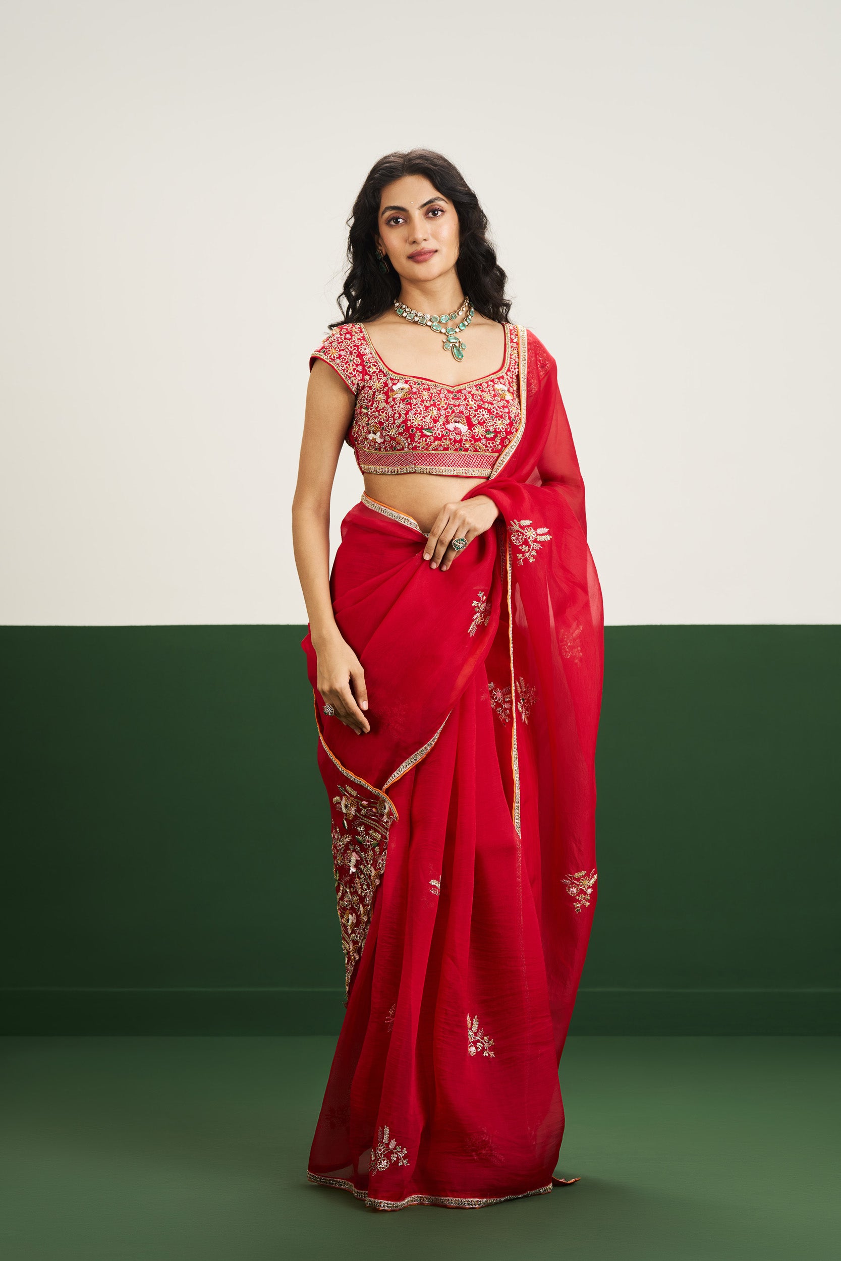Description: The Naina Saree Set in classic red embodies timeless beauty with its sleek drape and minimal detailing — perfect for traditional events.