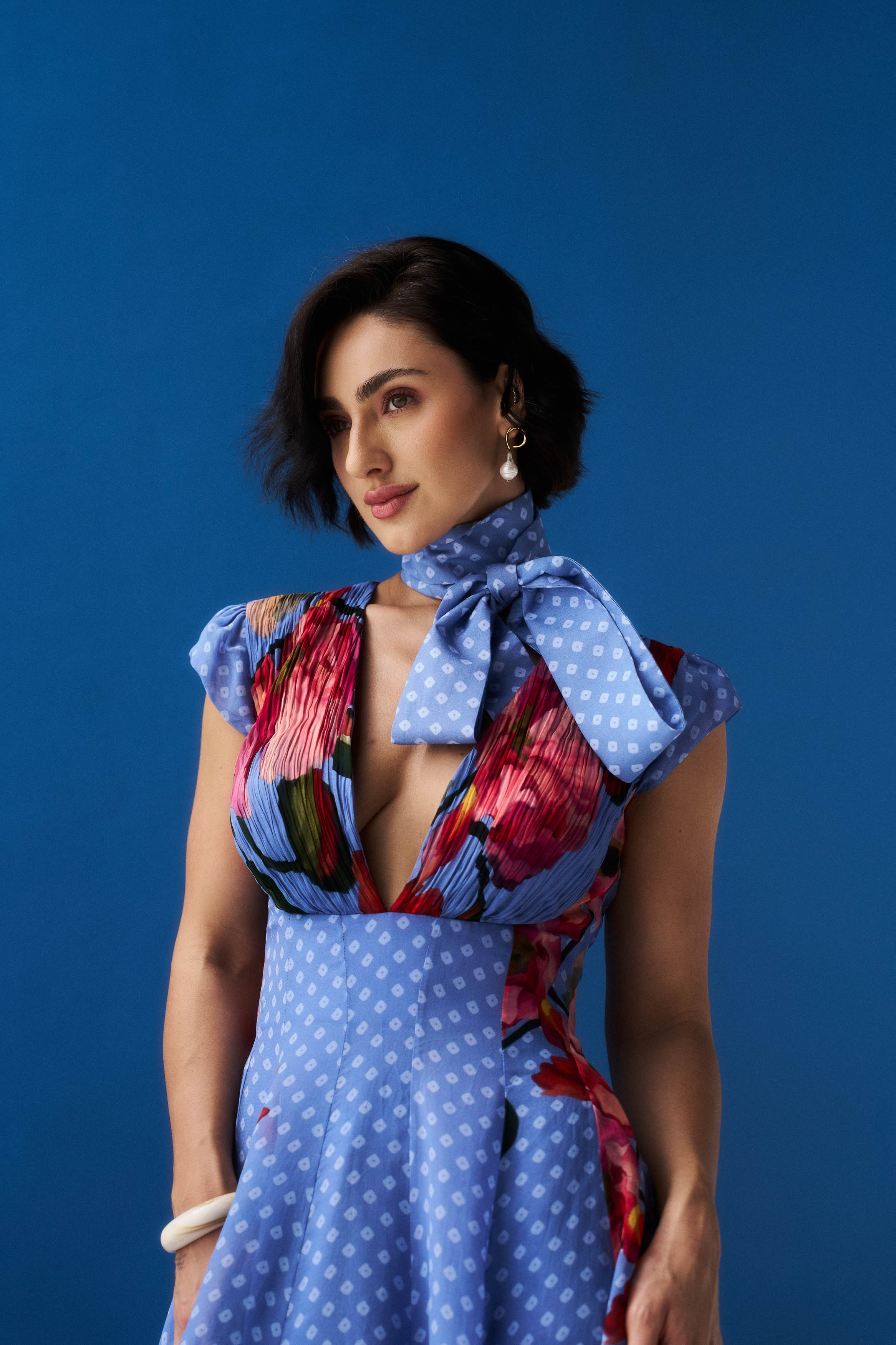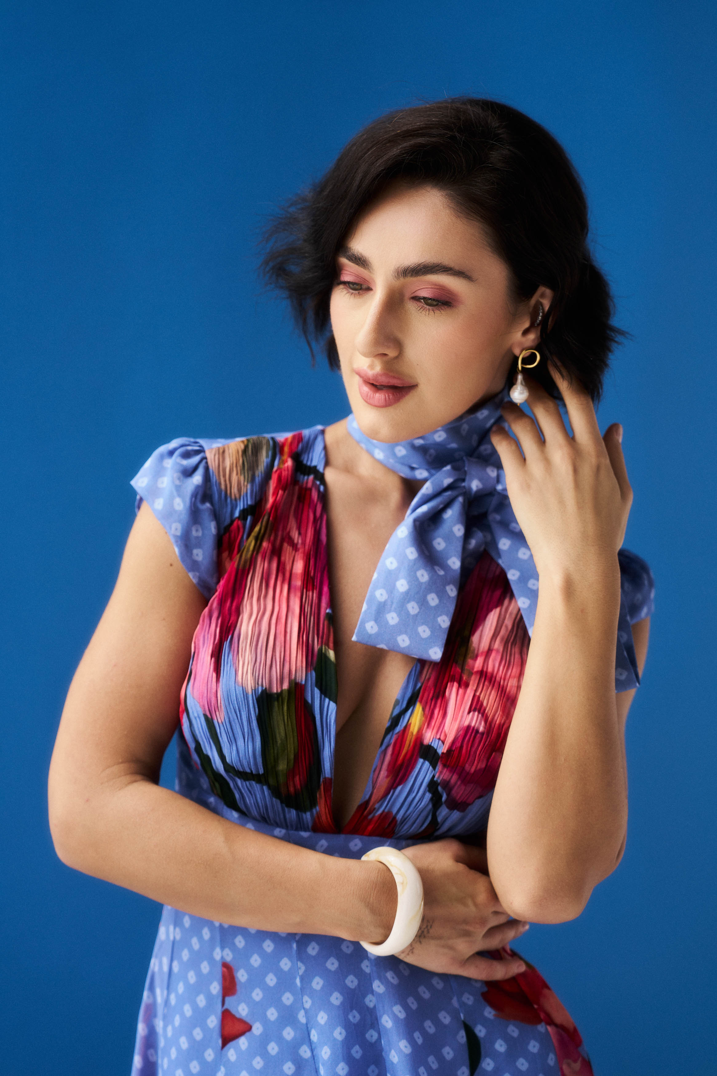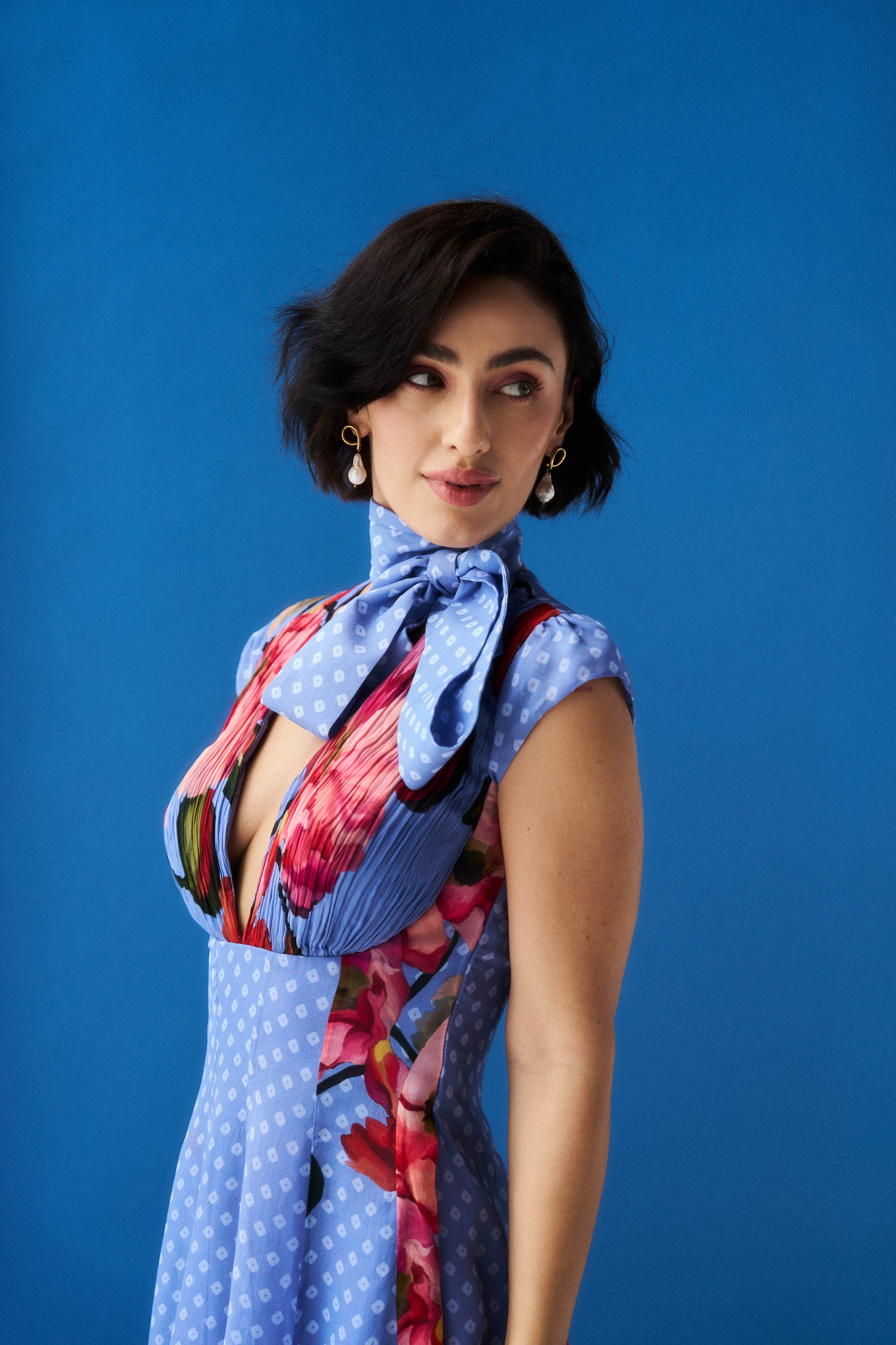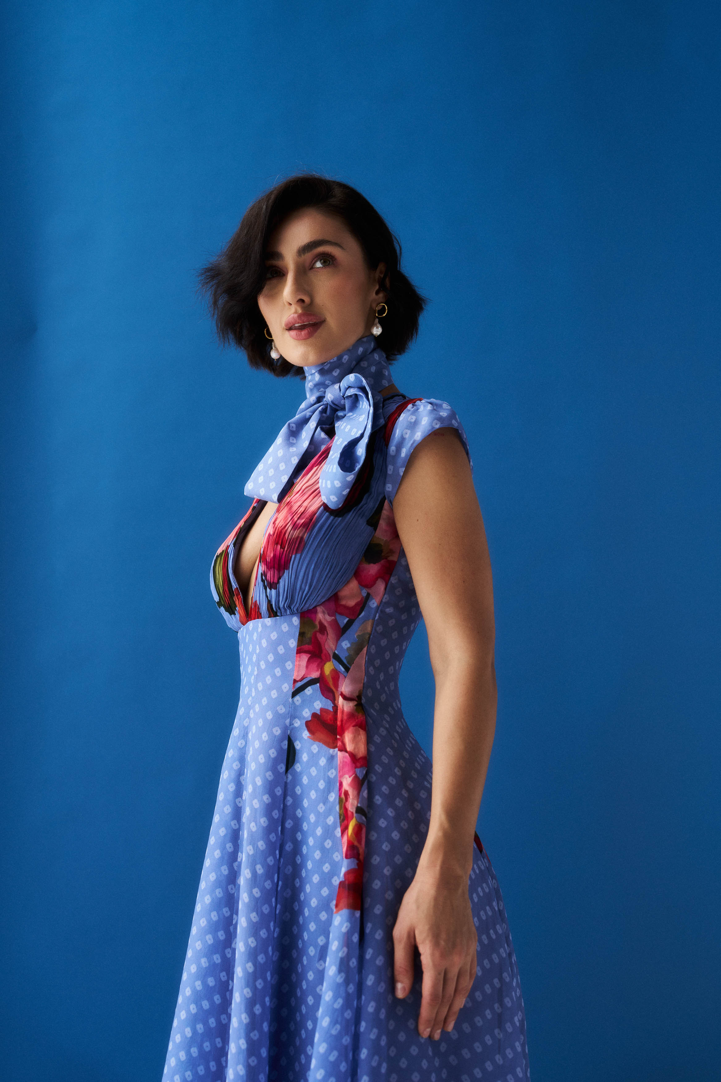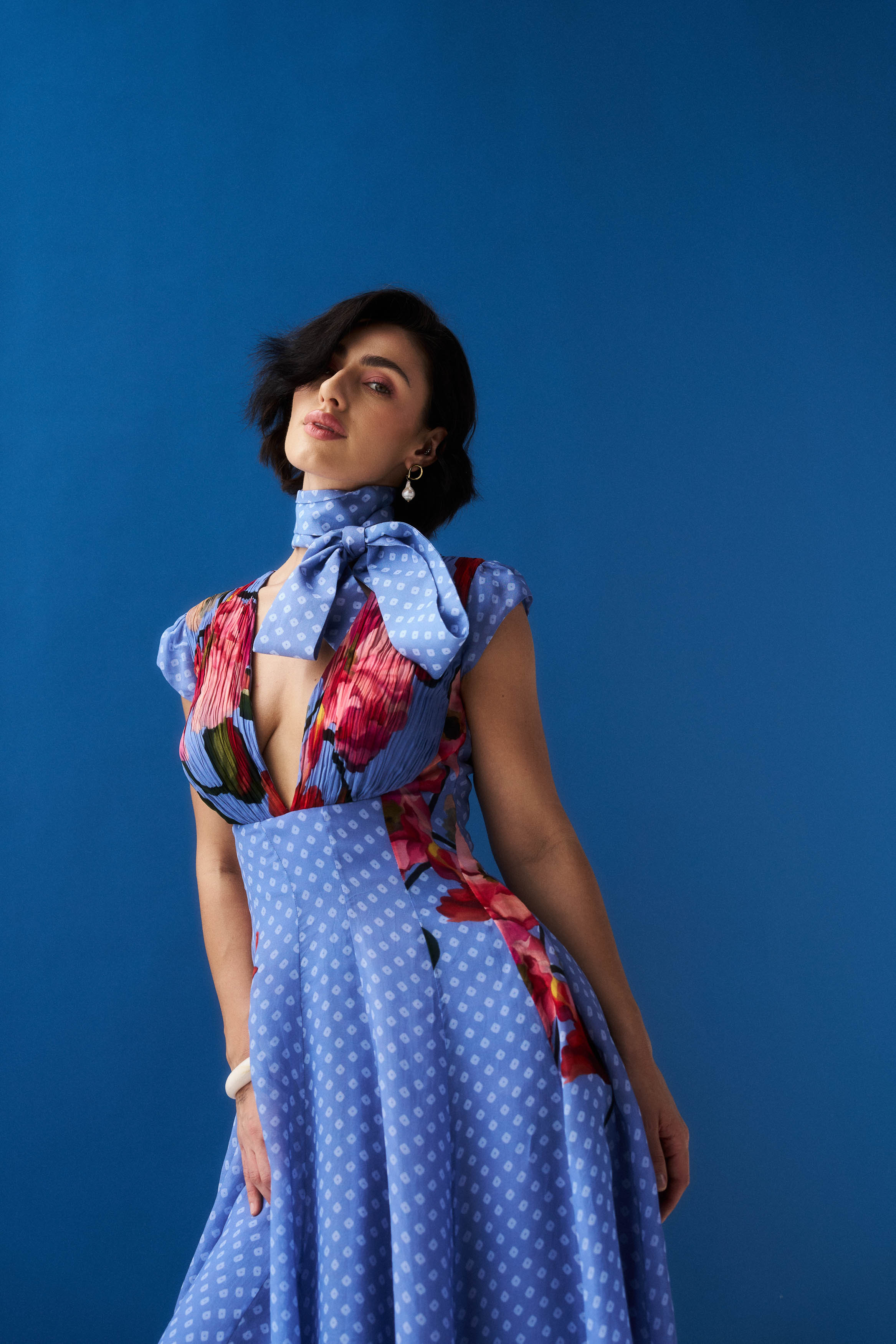 Description: A flowing fern blue organza silhouette crafted for modern glamour.