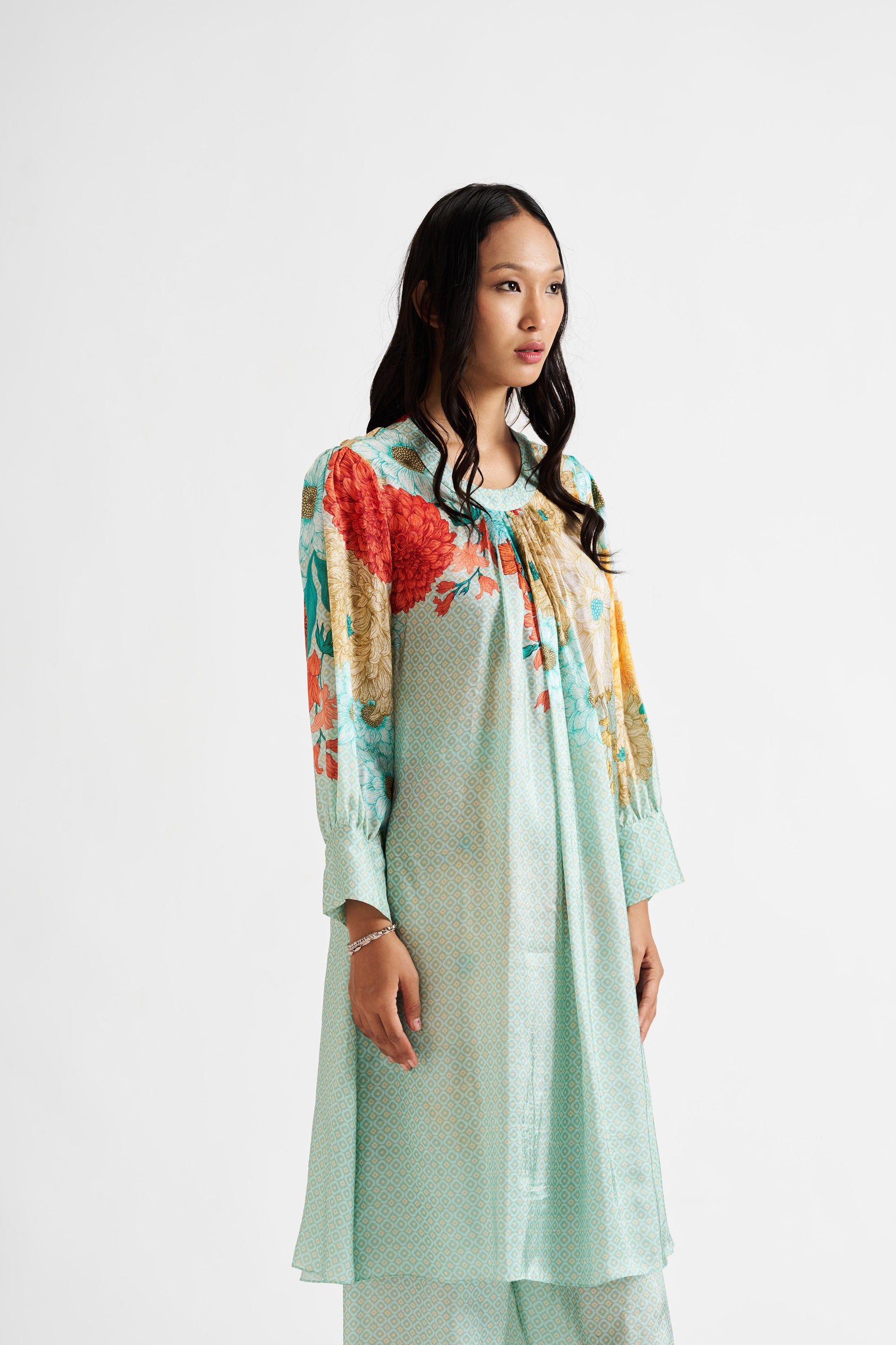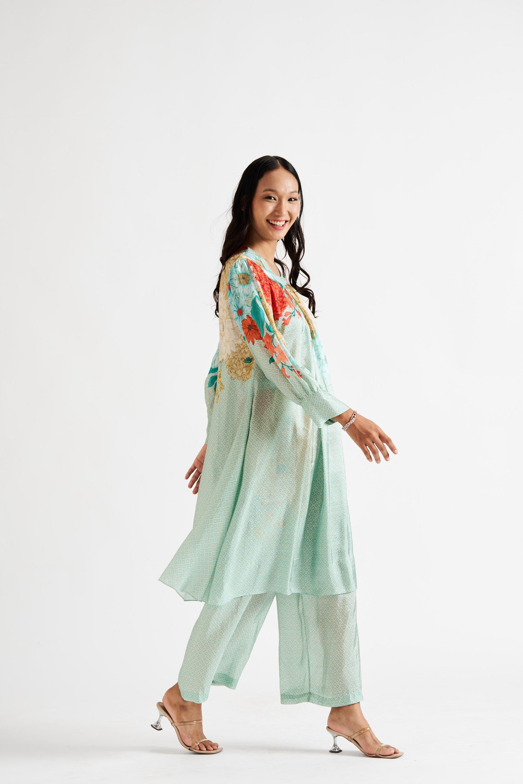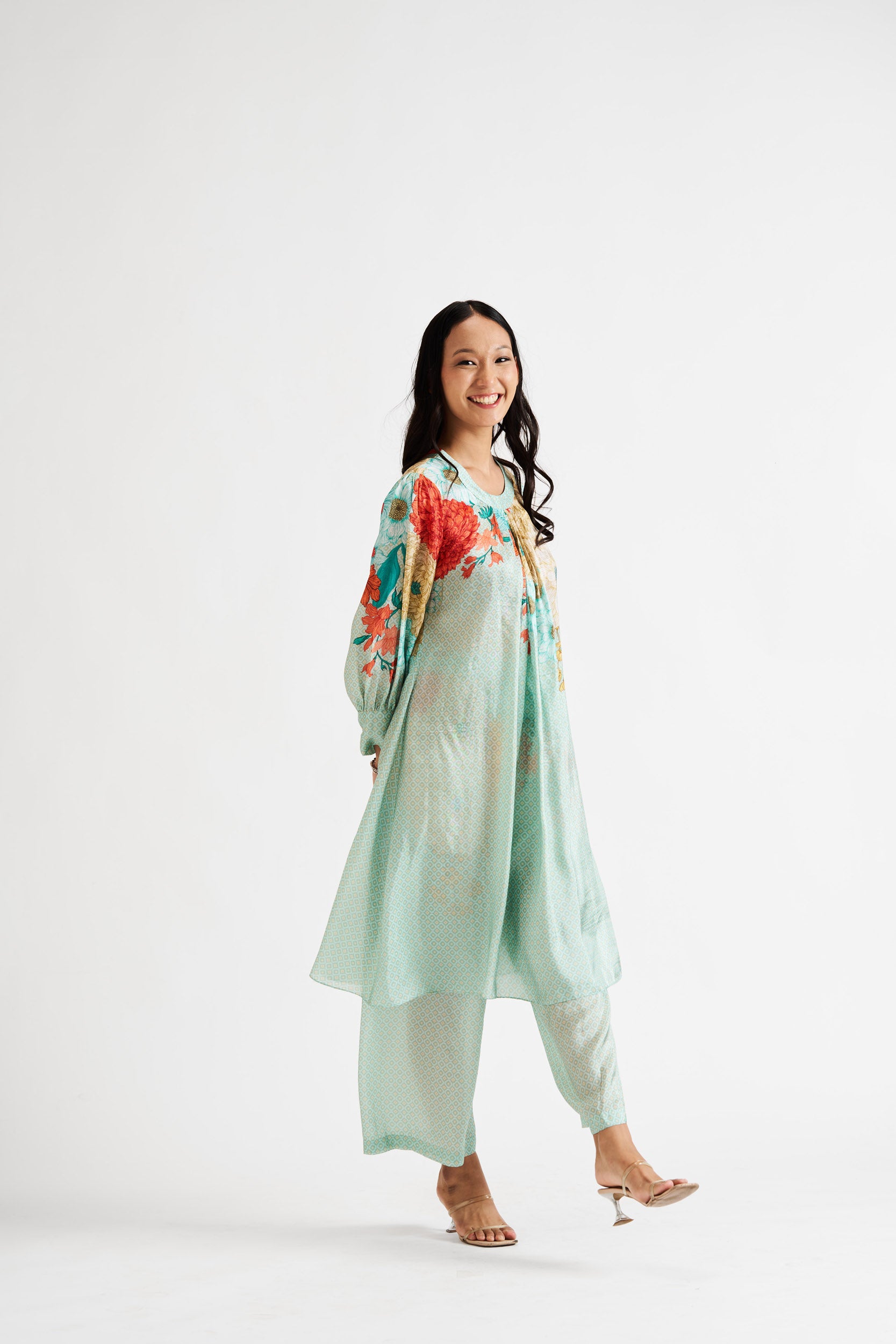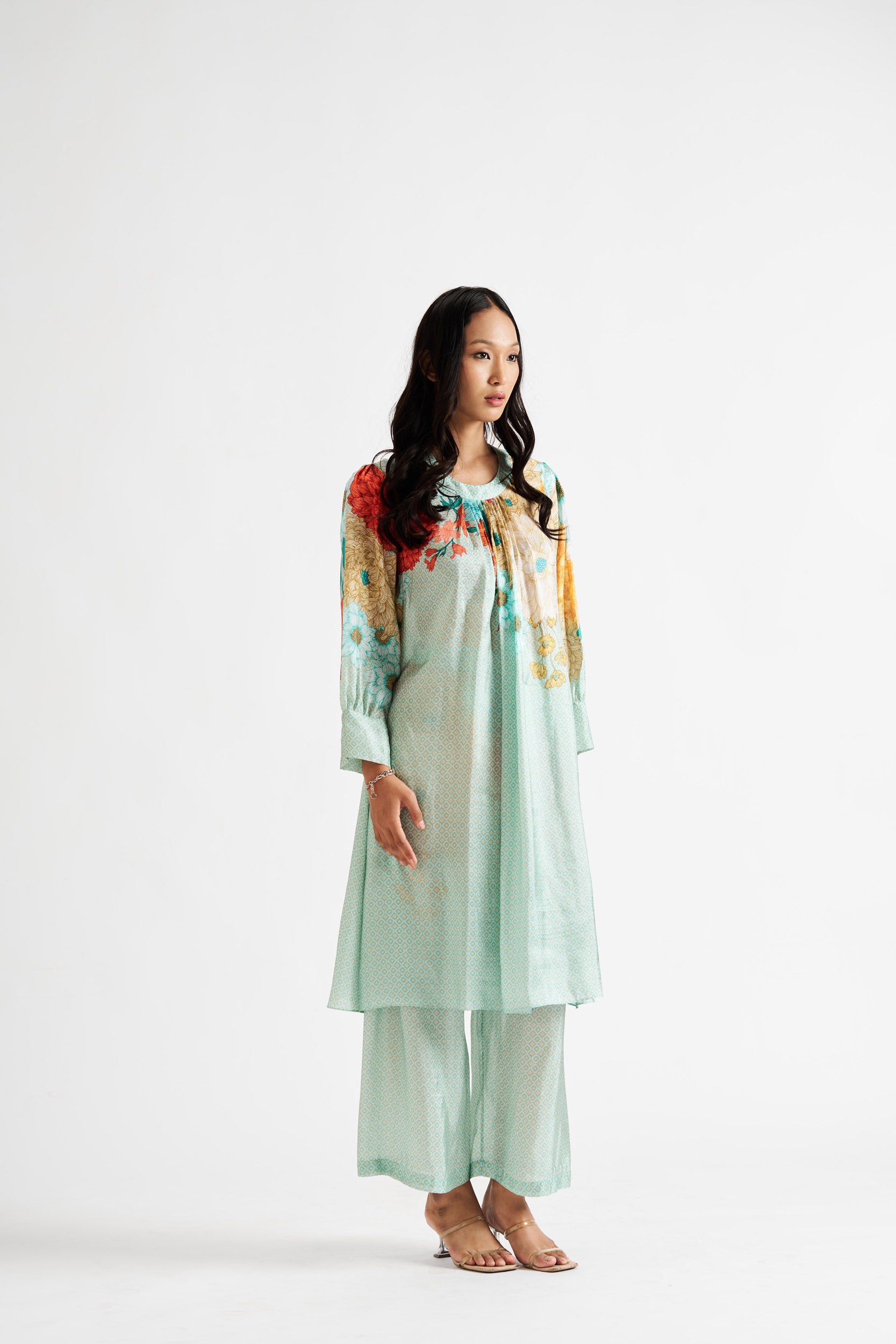Description: A serene light green kurta set with delicate knife pleats for a structured yet flowy look.