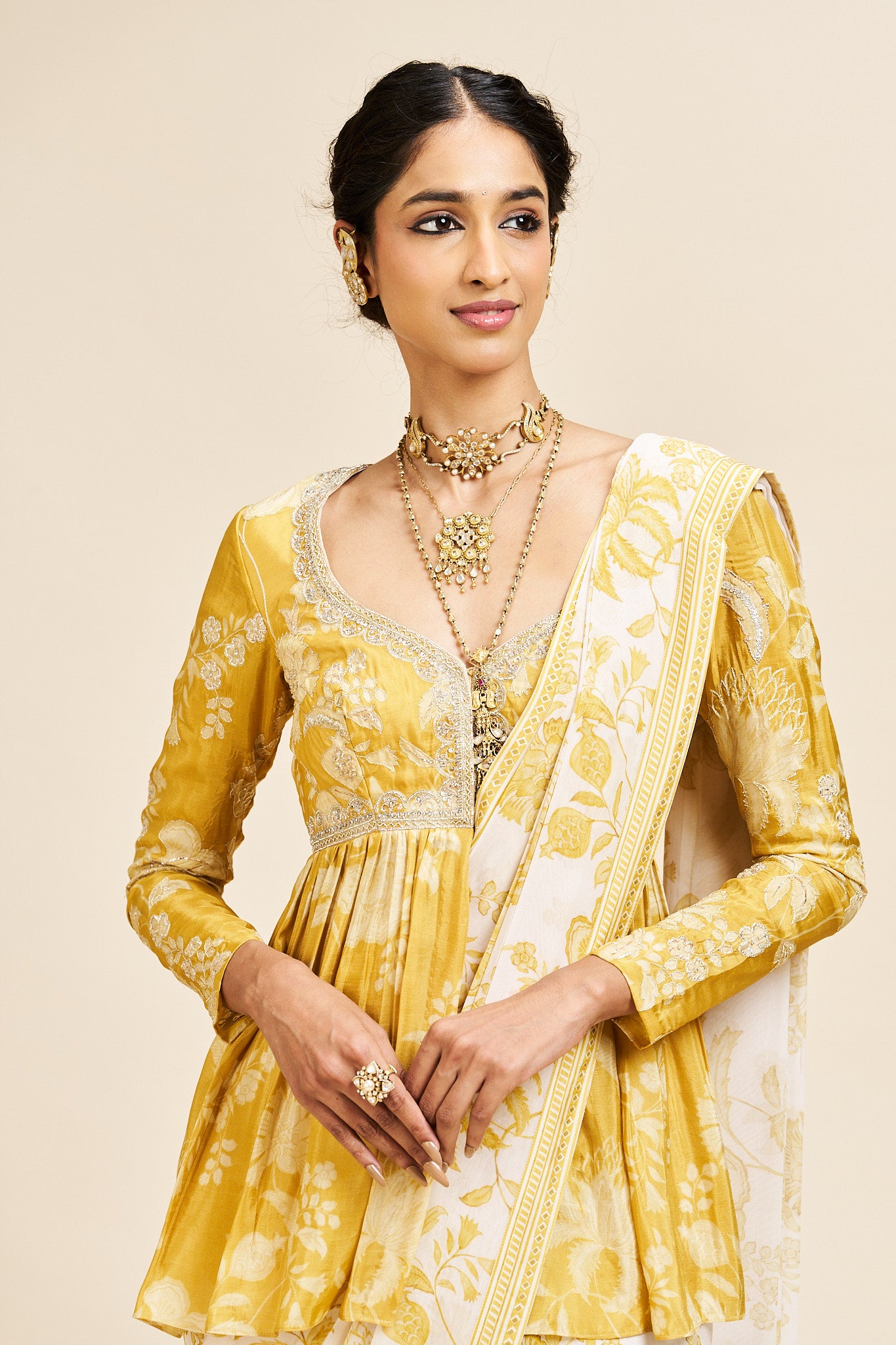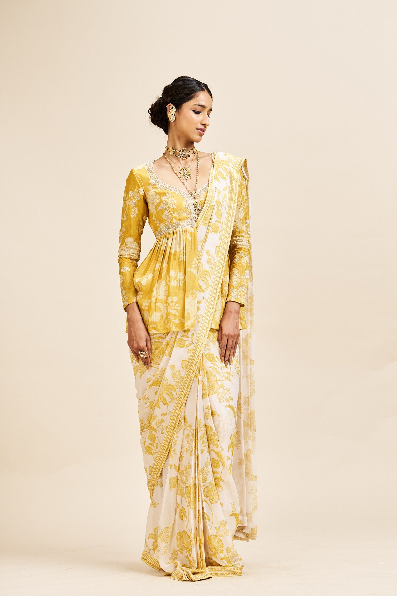 Description: Fluid yellow drape saree set crafted for effortless contemporary elegance.