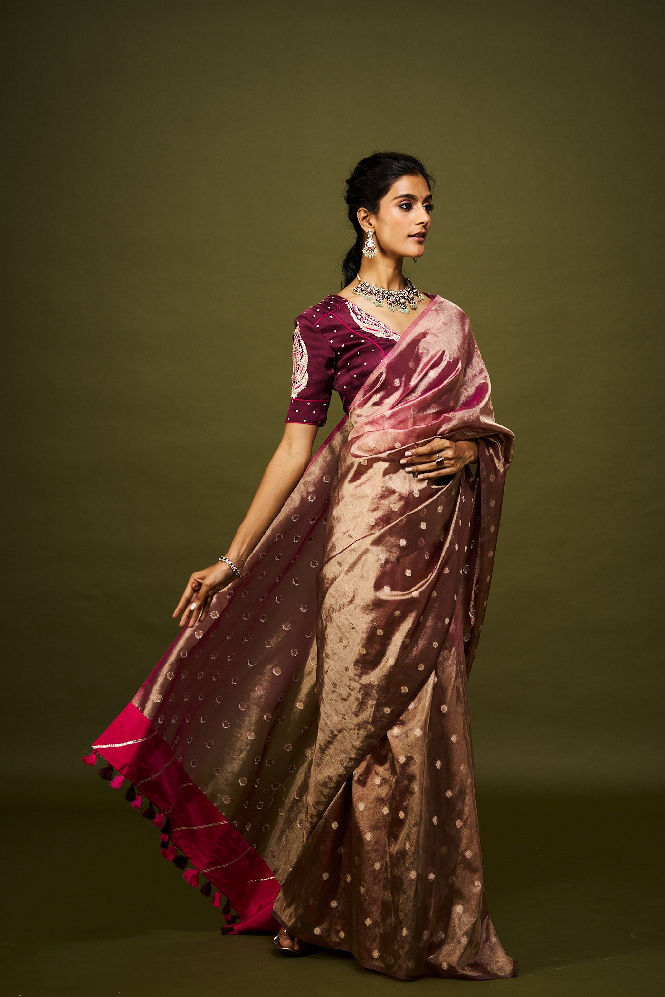 An exquisite wine & pink ombre tissue saree set from our Moh 4.0 collection, crafted with elegance and modern charm. Perfect for festive and wedding occasions.