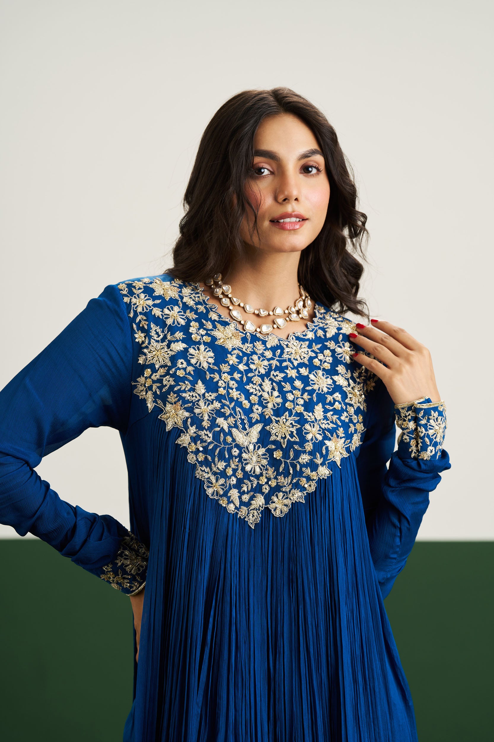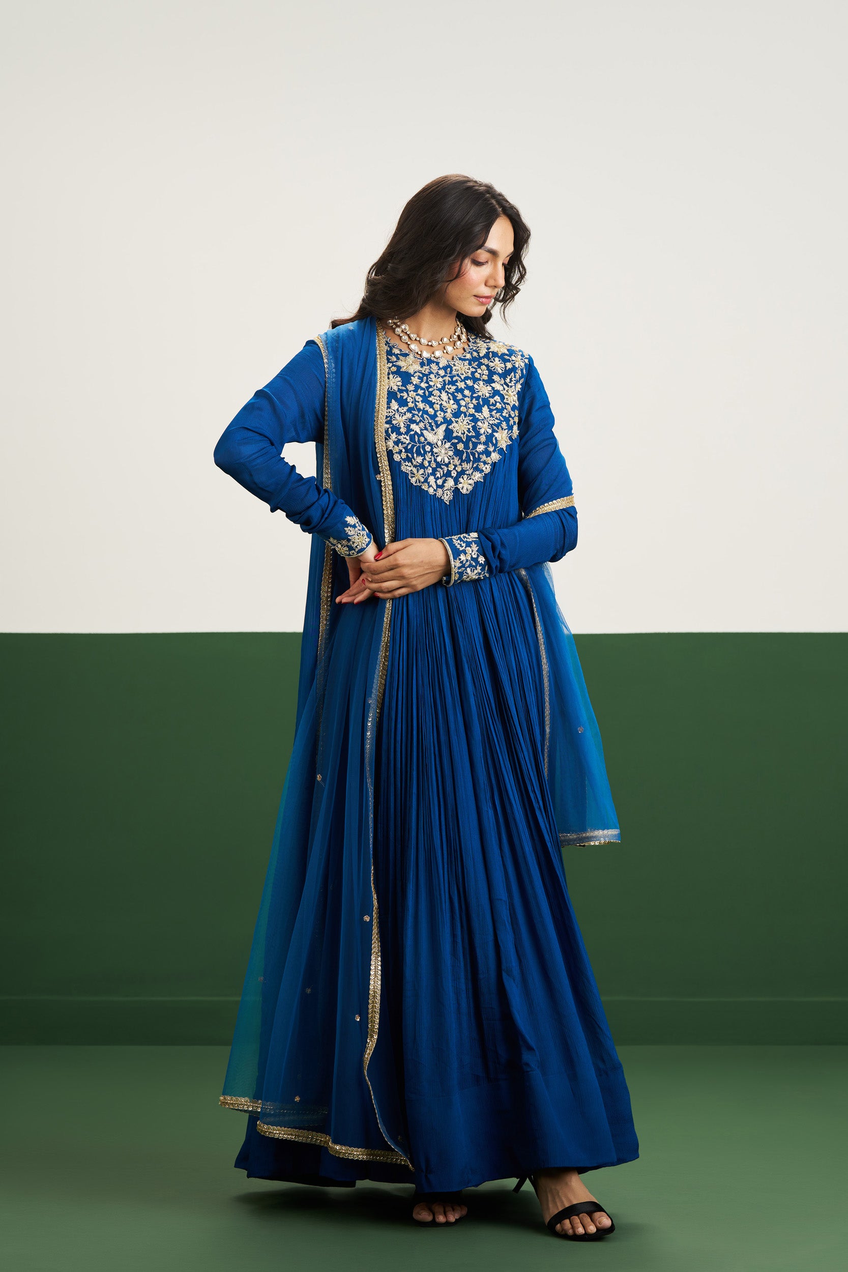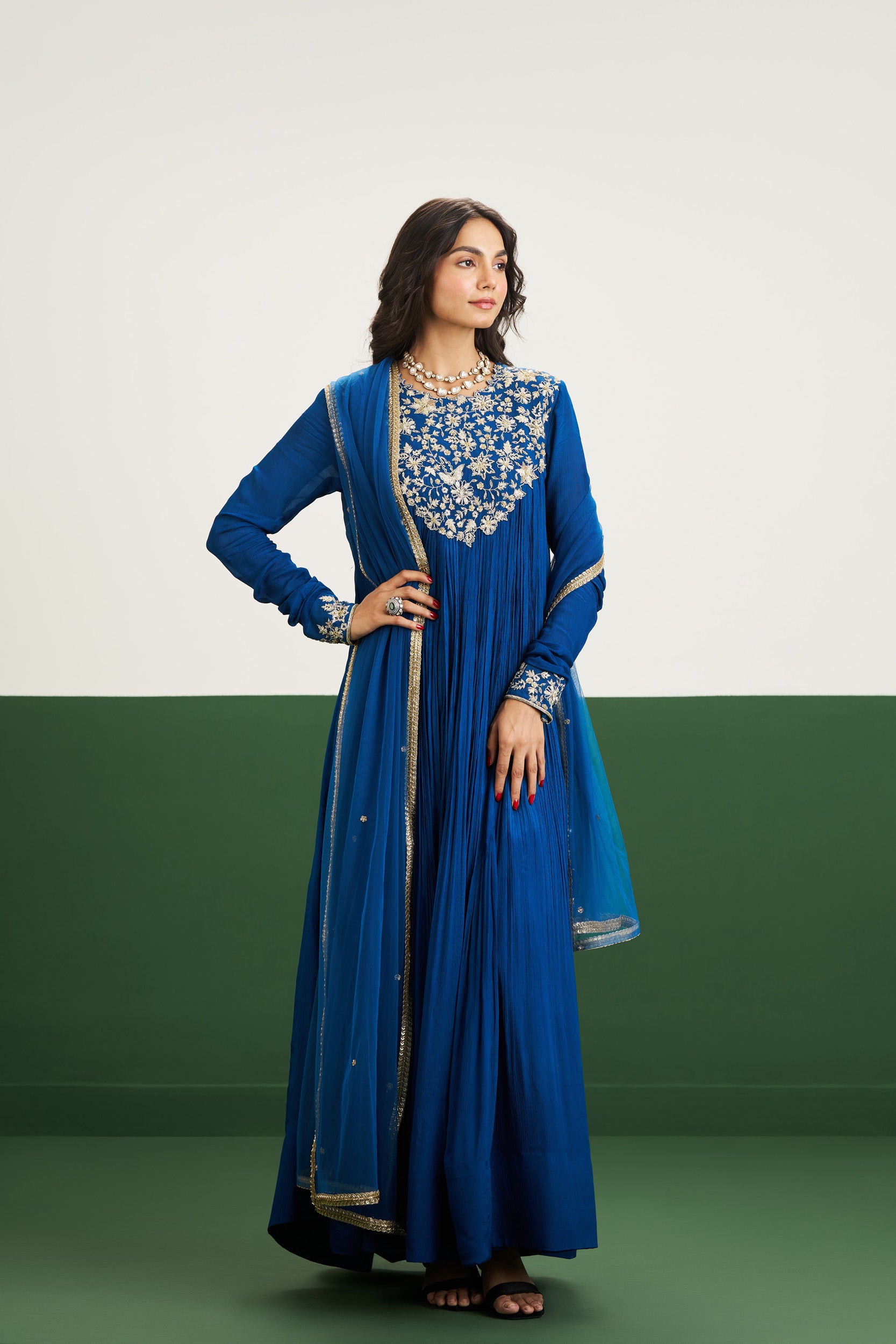 Description: Reimagined in regal peacock blue, the Rachel Dress is elegant and fluid. Paired with a sheer dupatta, it’s made for those who love rich hues and graceful silhouettes.
