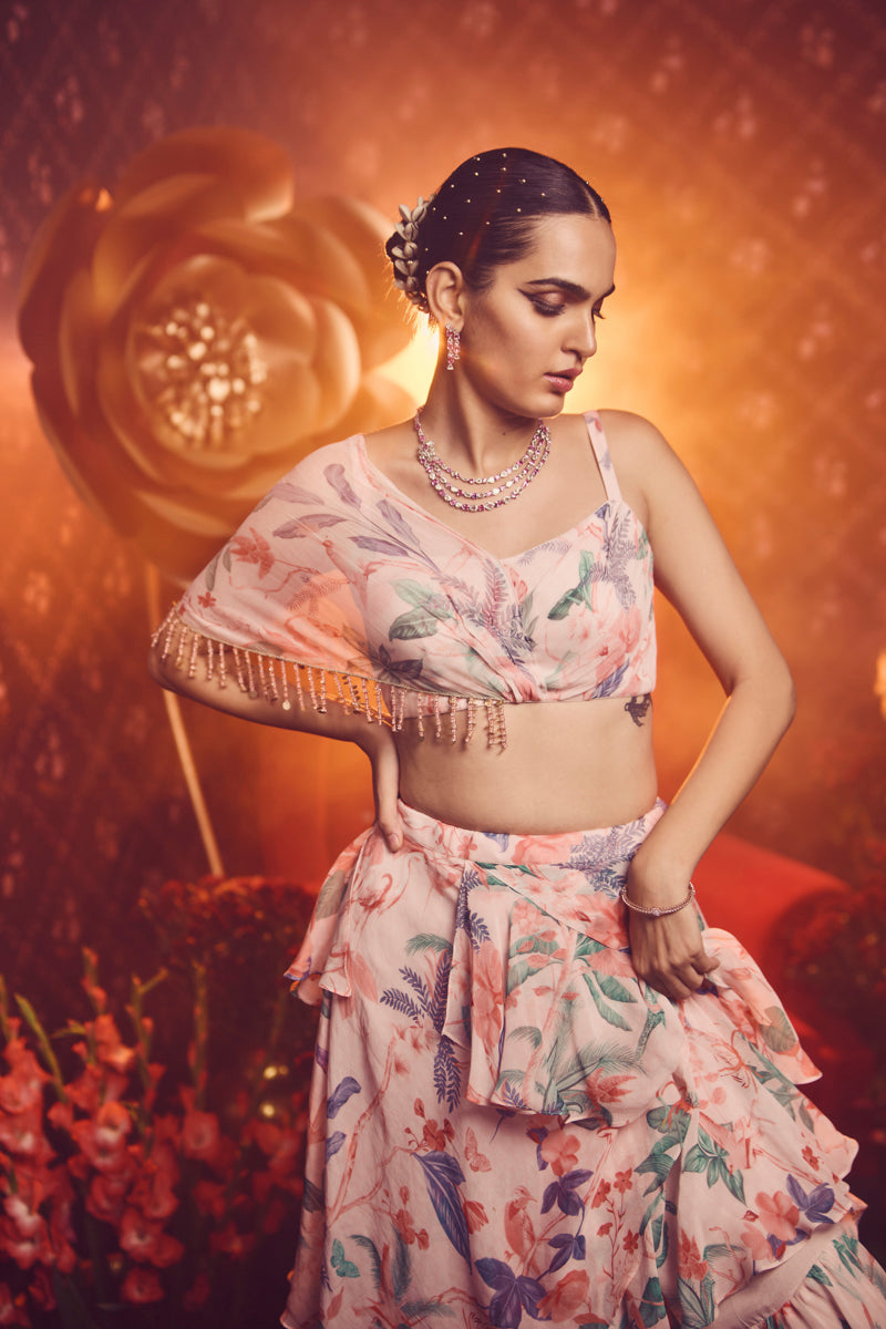This pre-draped saree comes with sleeved blouse and hand embroidered details. The subtle flow in this ensemble will keep those compliments flowing.