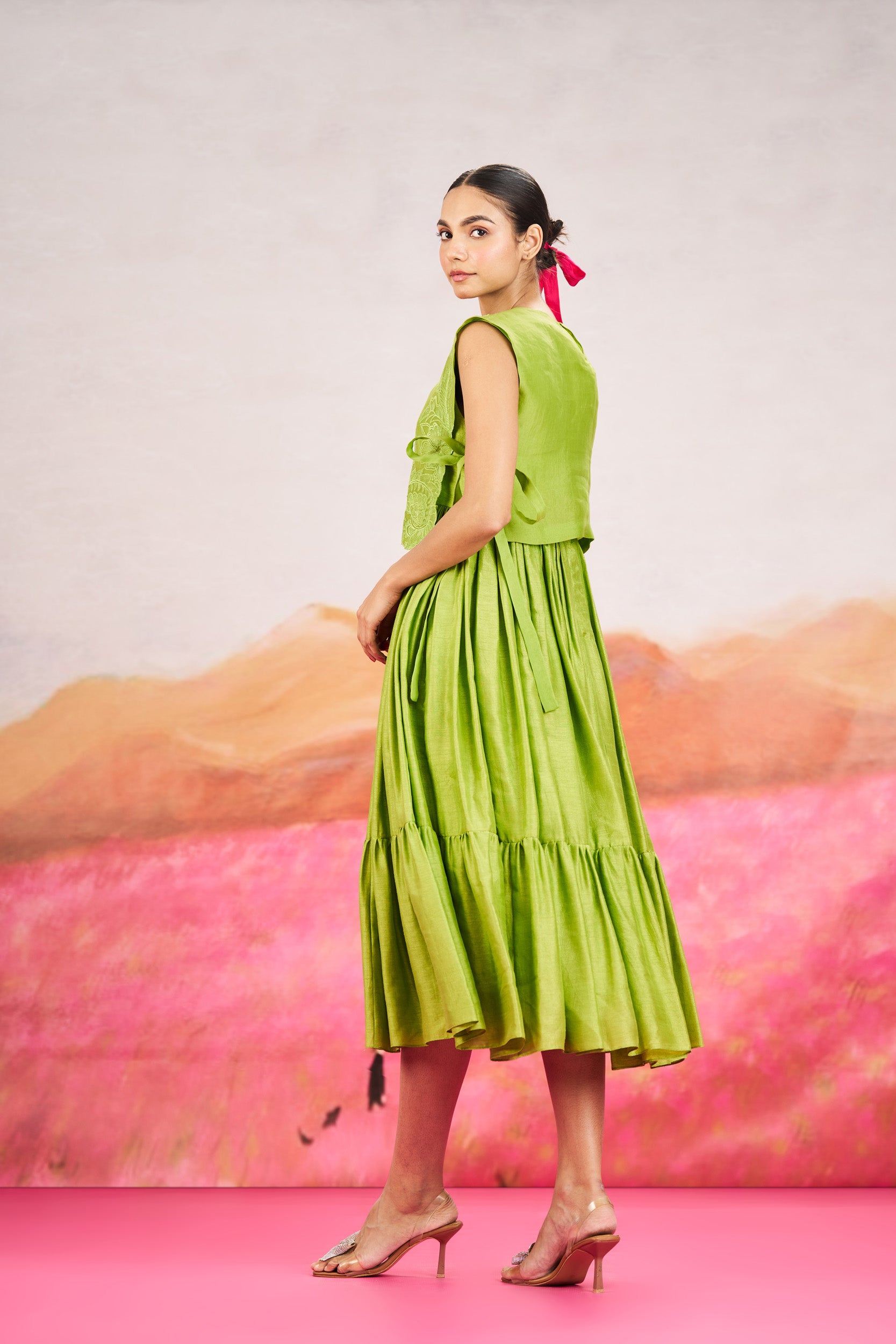 Description: A green fitted dress paired with a flowy short cape, offering a balanced silhouette.