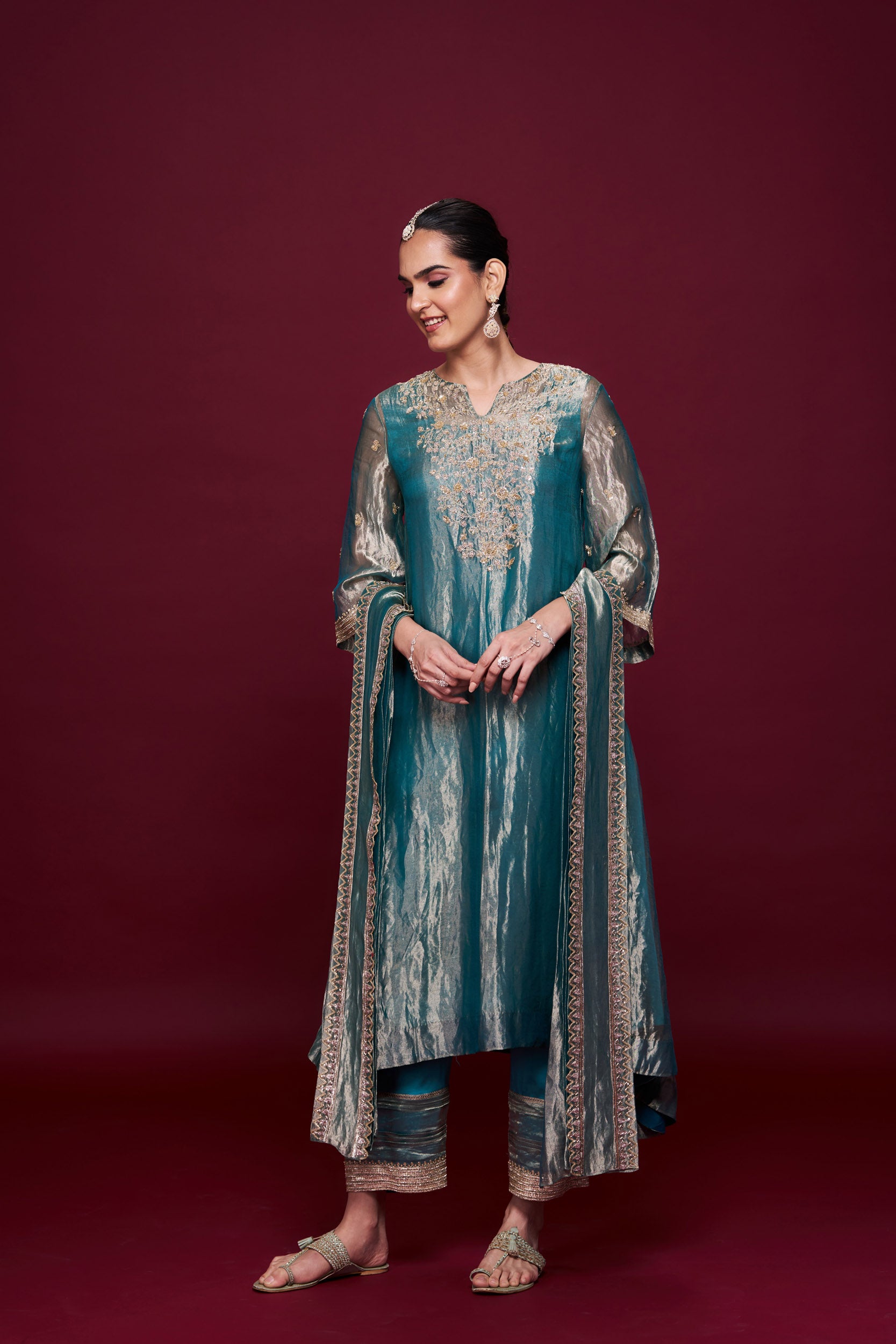 Description: This is a Emerald green silver tissue dress with heavy cutdana & sequins hand embroidered work.