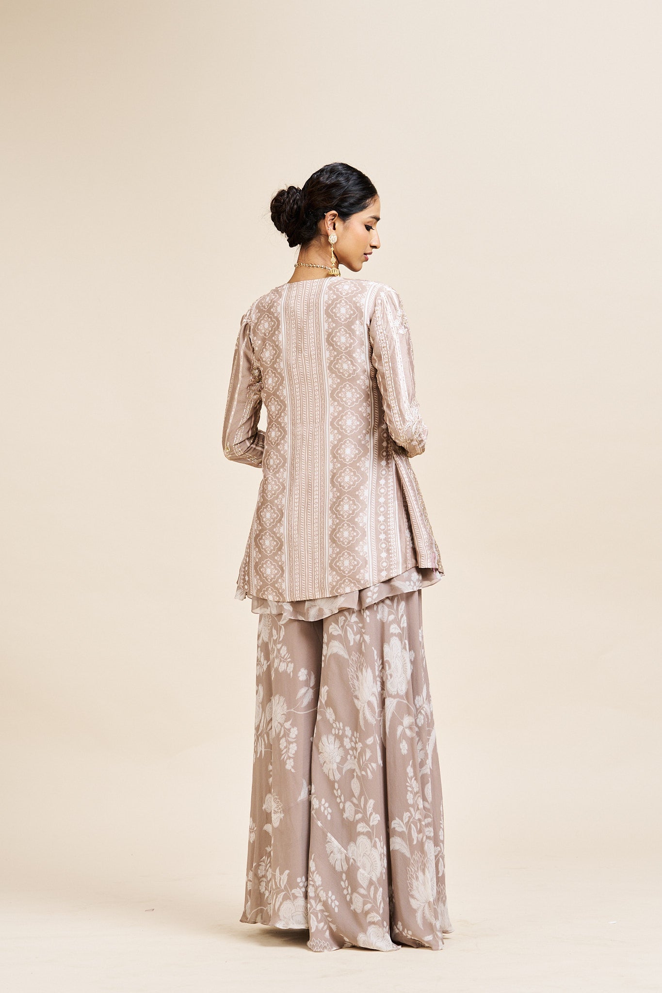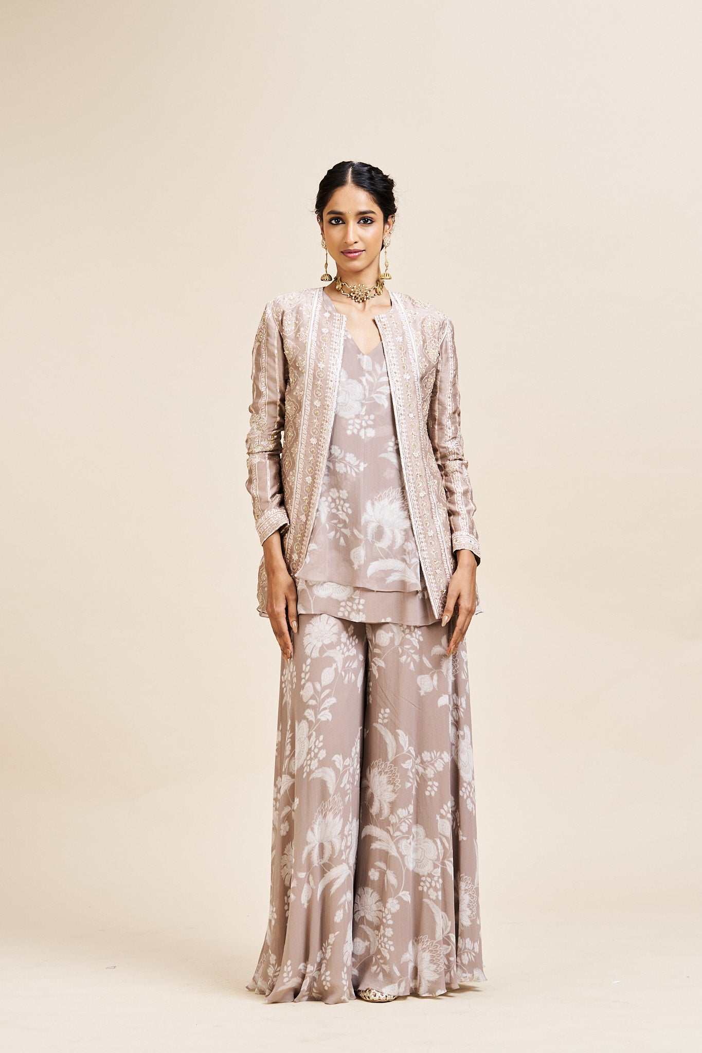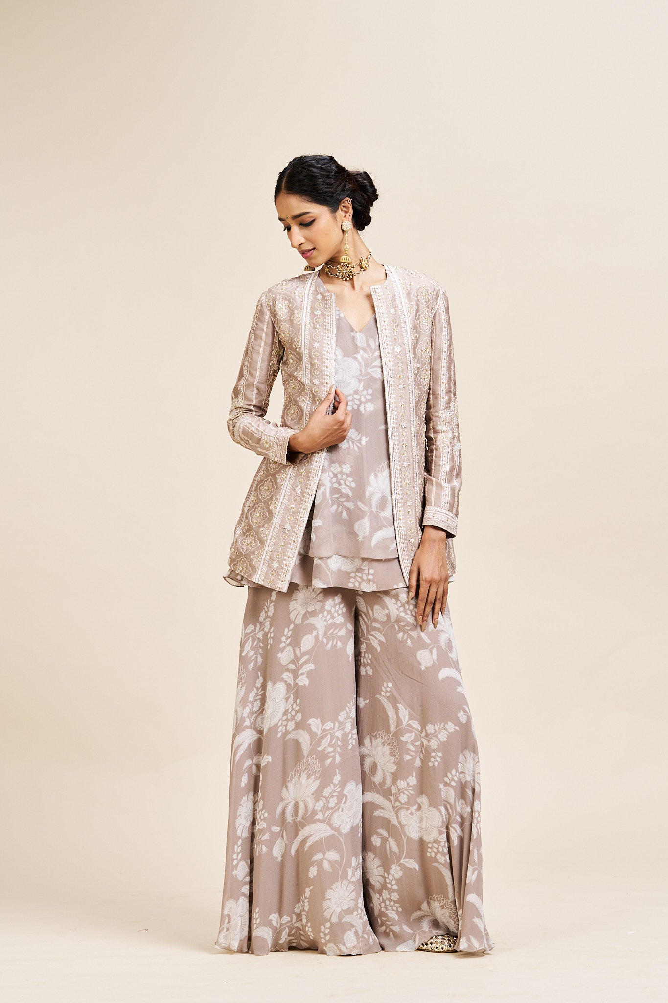 Description: Versatile three-piece beige set ideal for graceful festive dressing.