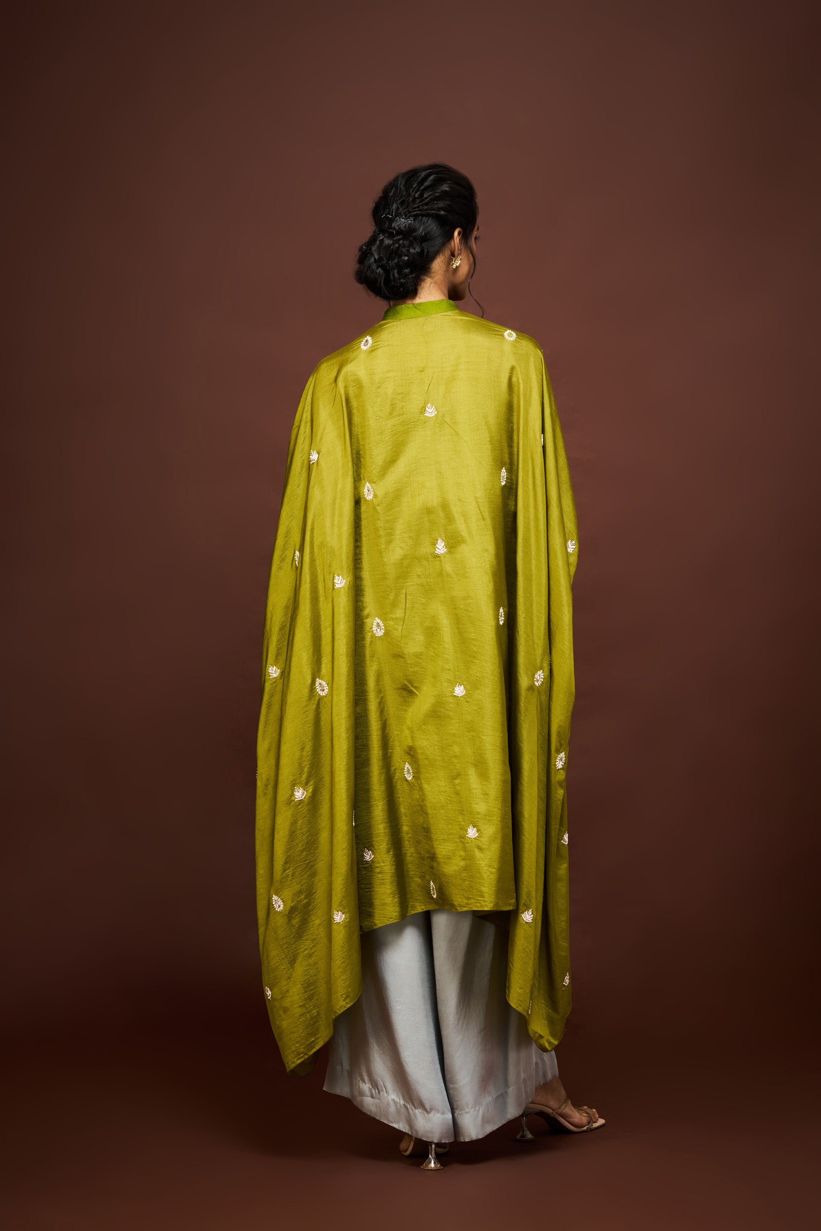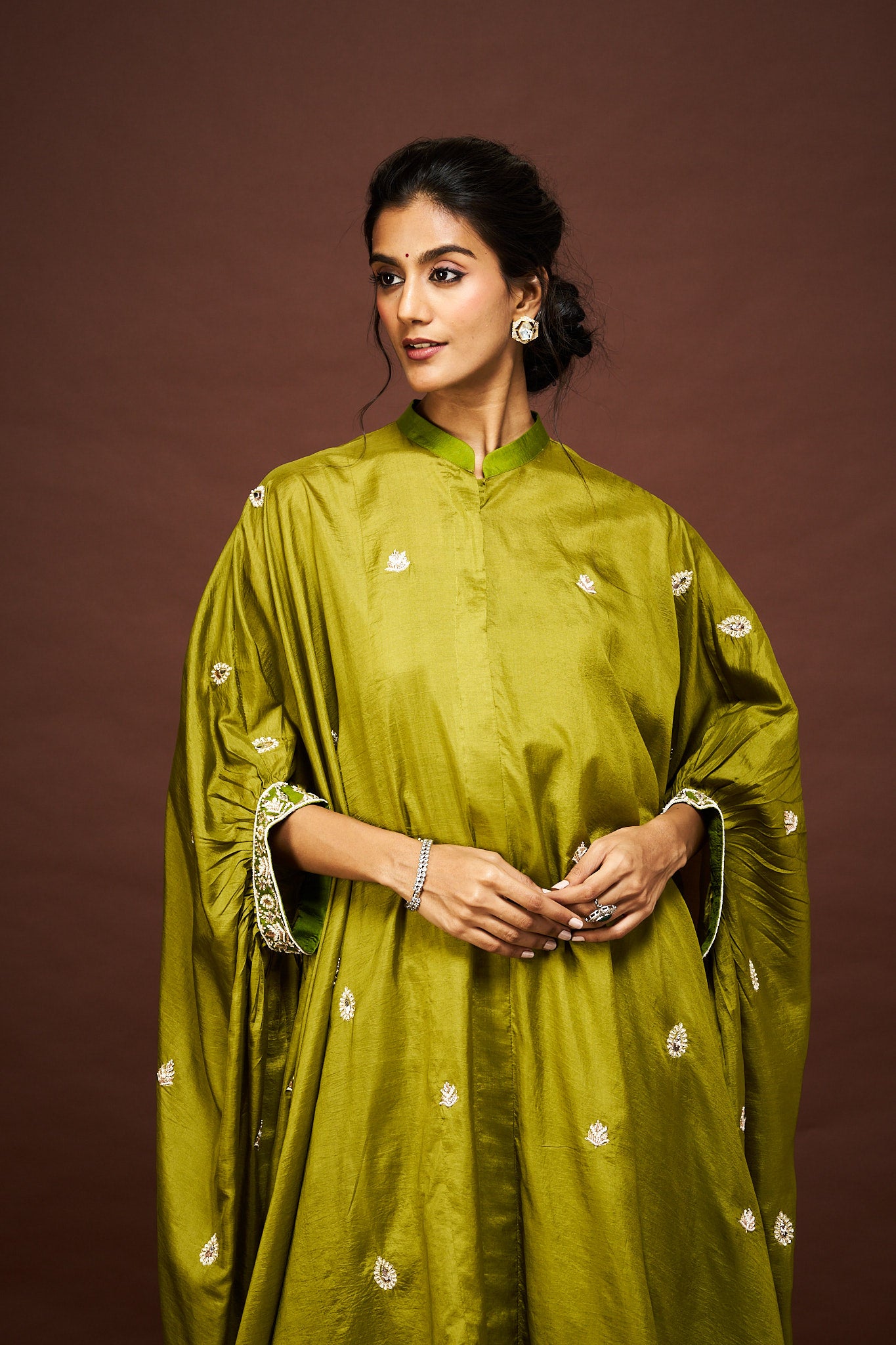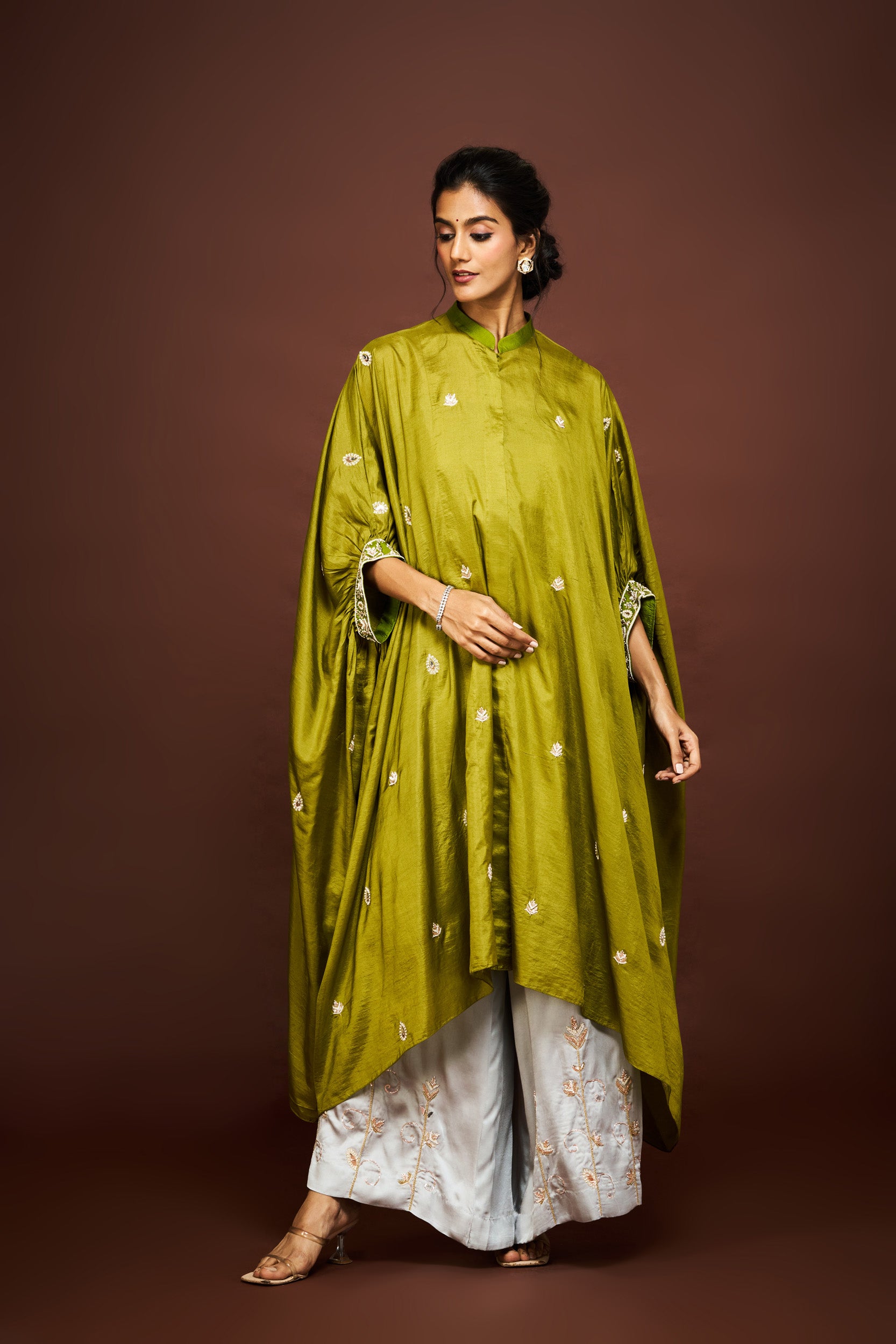 Description: A unique kaftan set blending grey and green shades. Flowing silhouette with contemporary festive vibes.