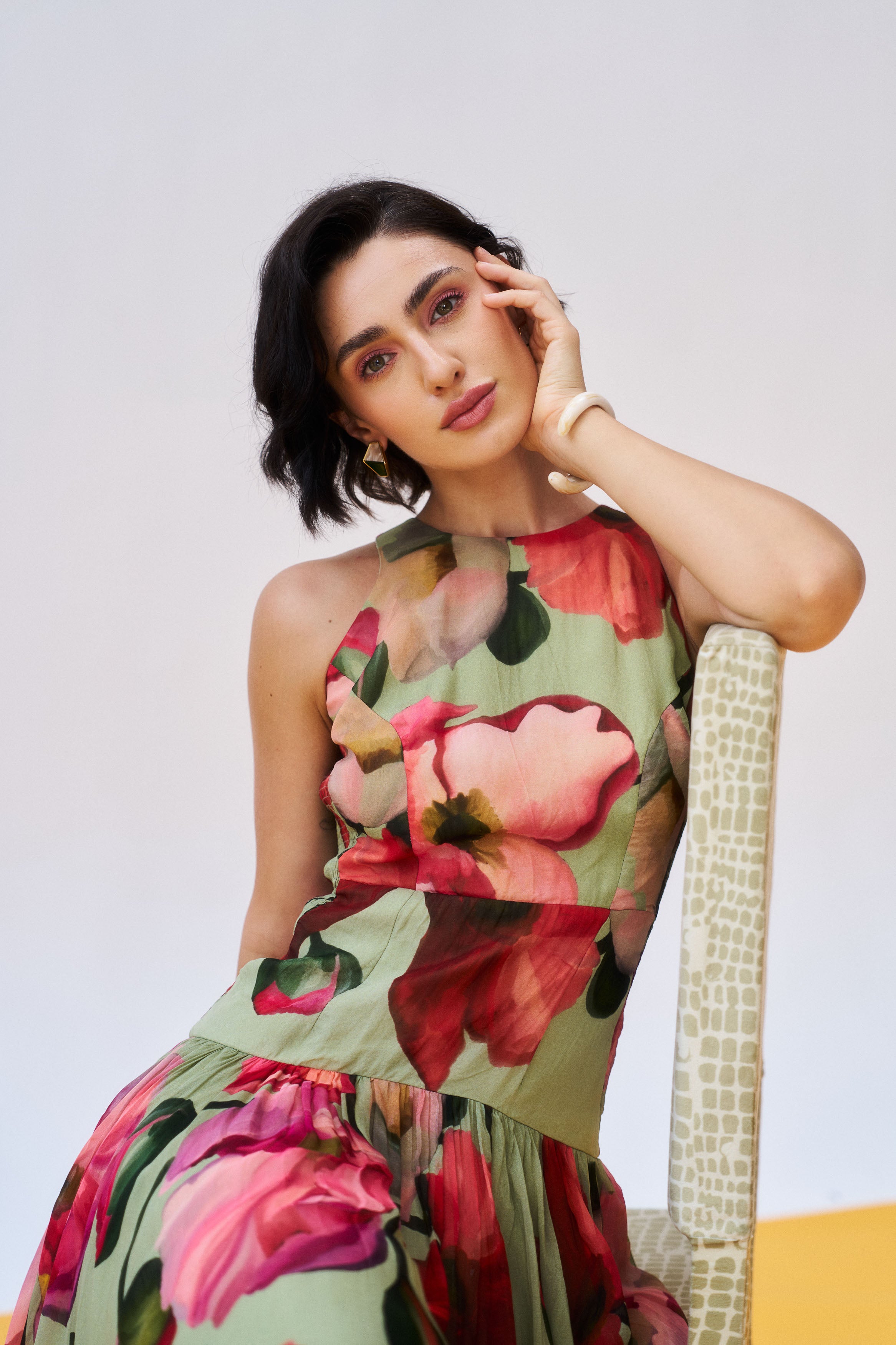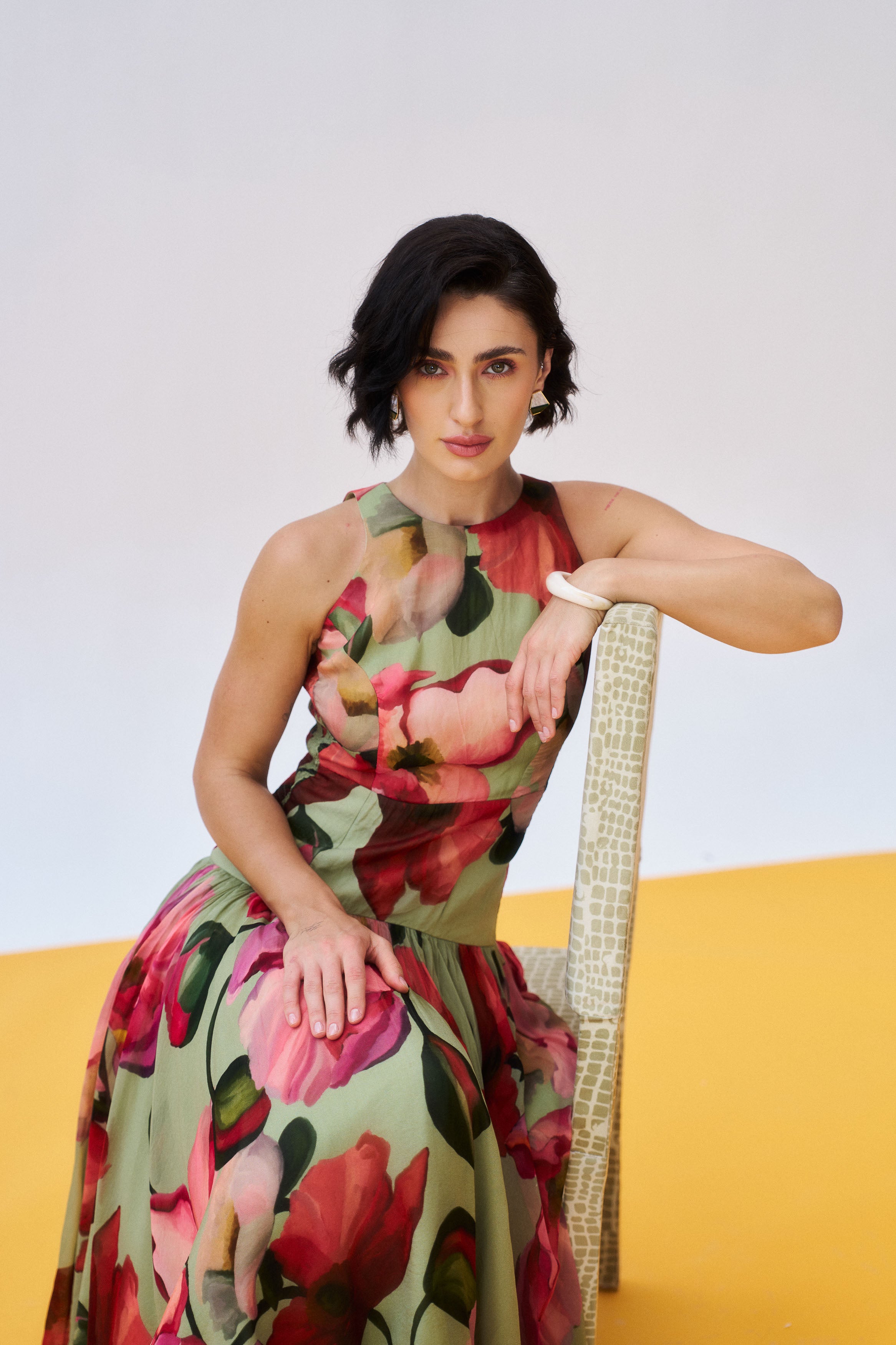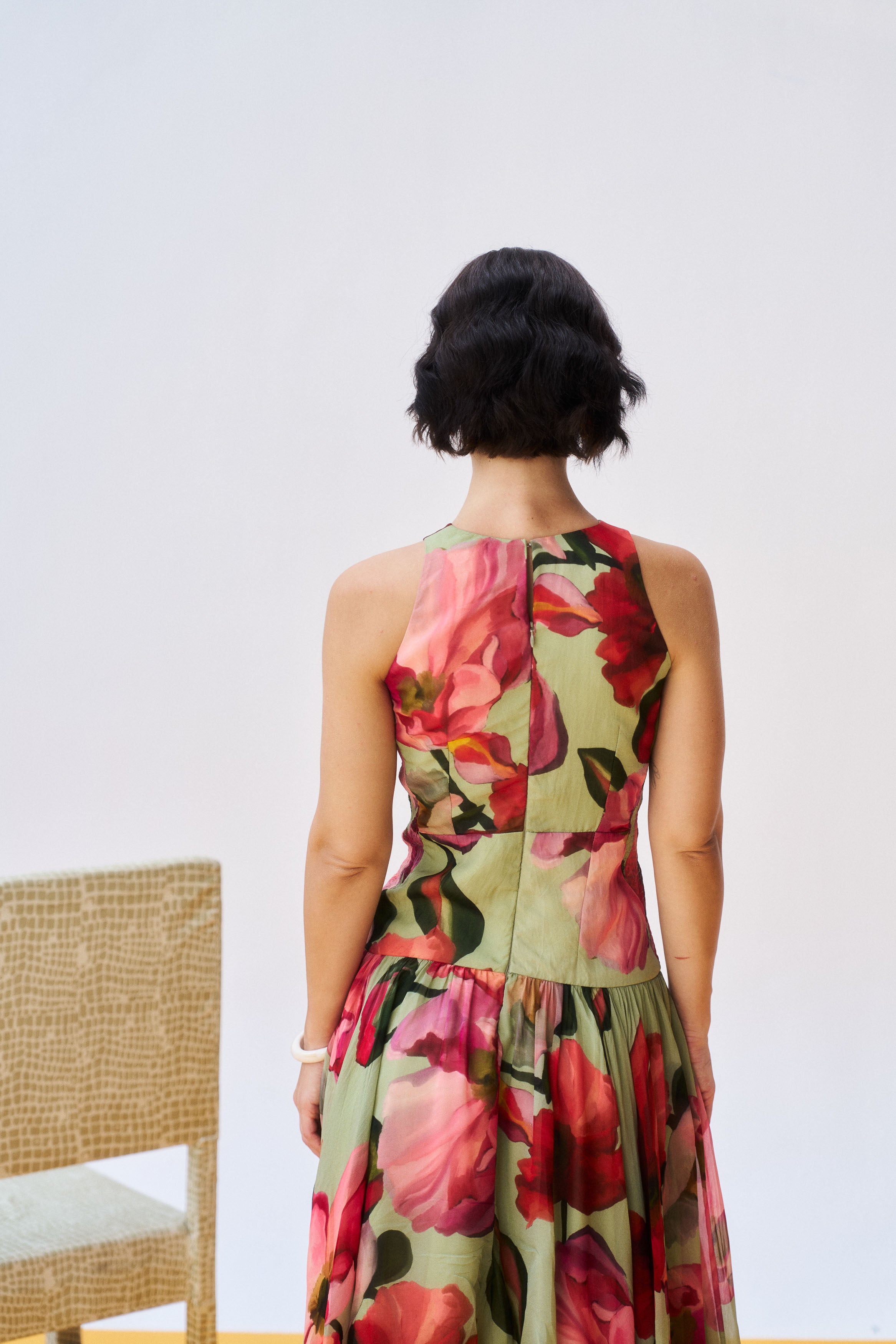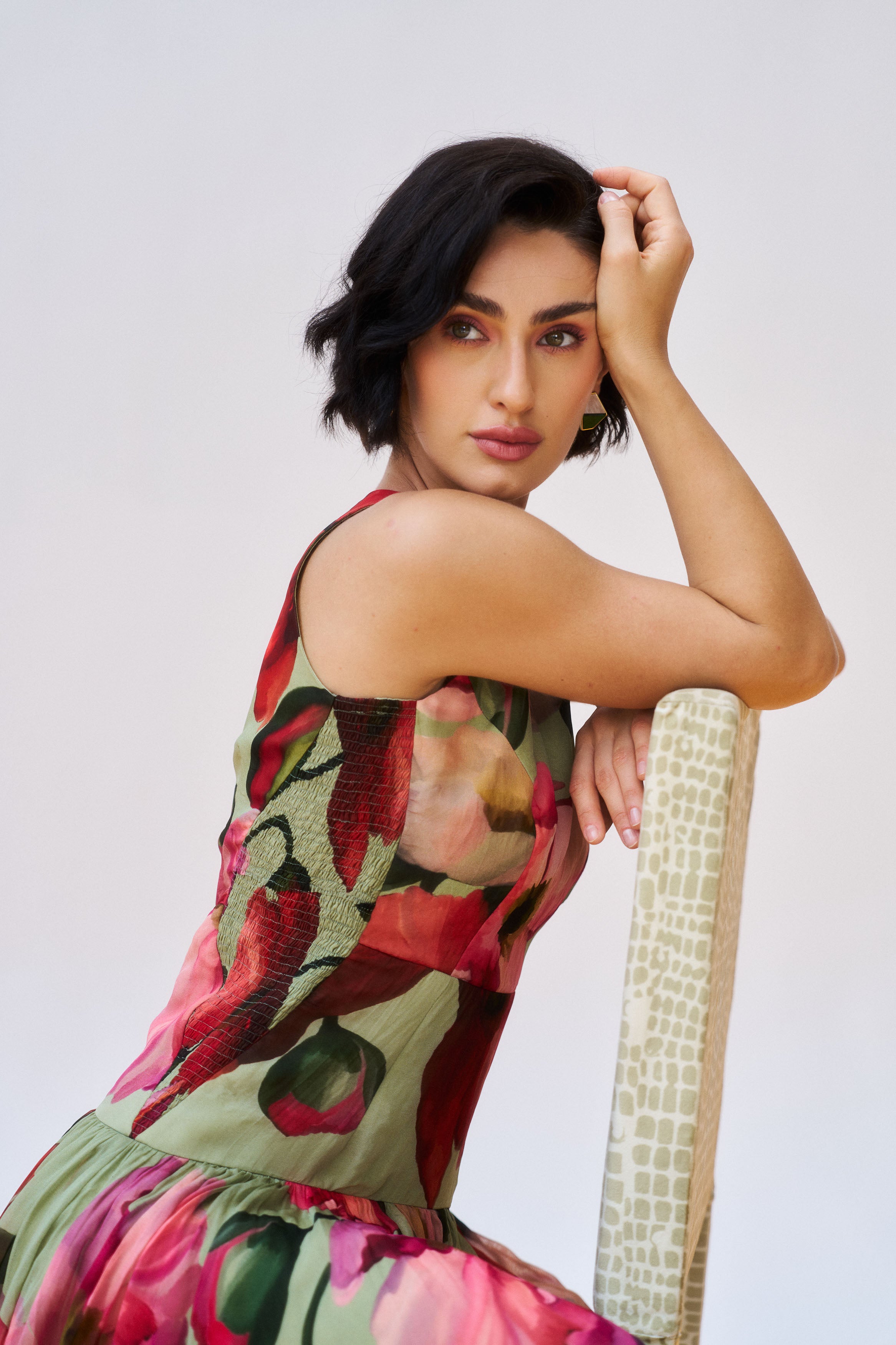 Description: A graceful moss green organza silhouette exuding refined glamour.