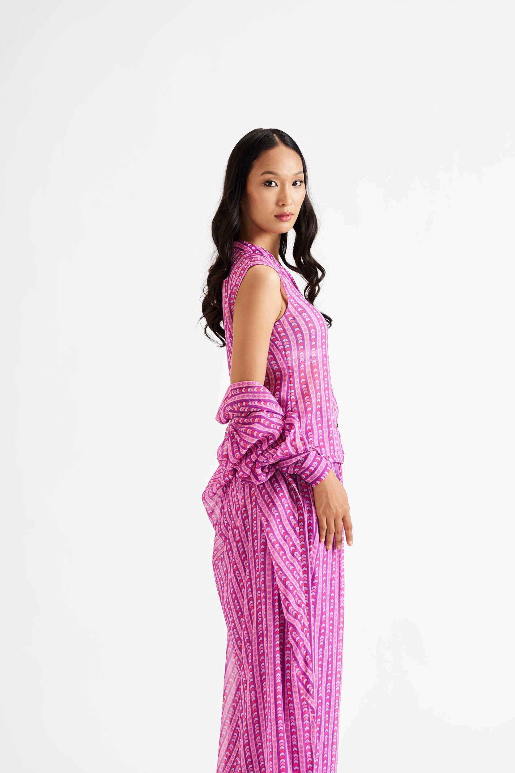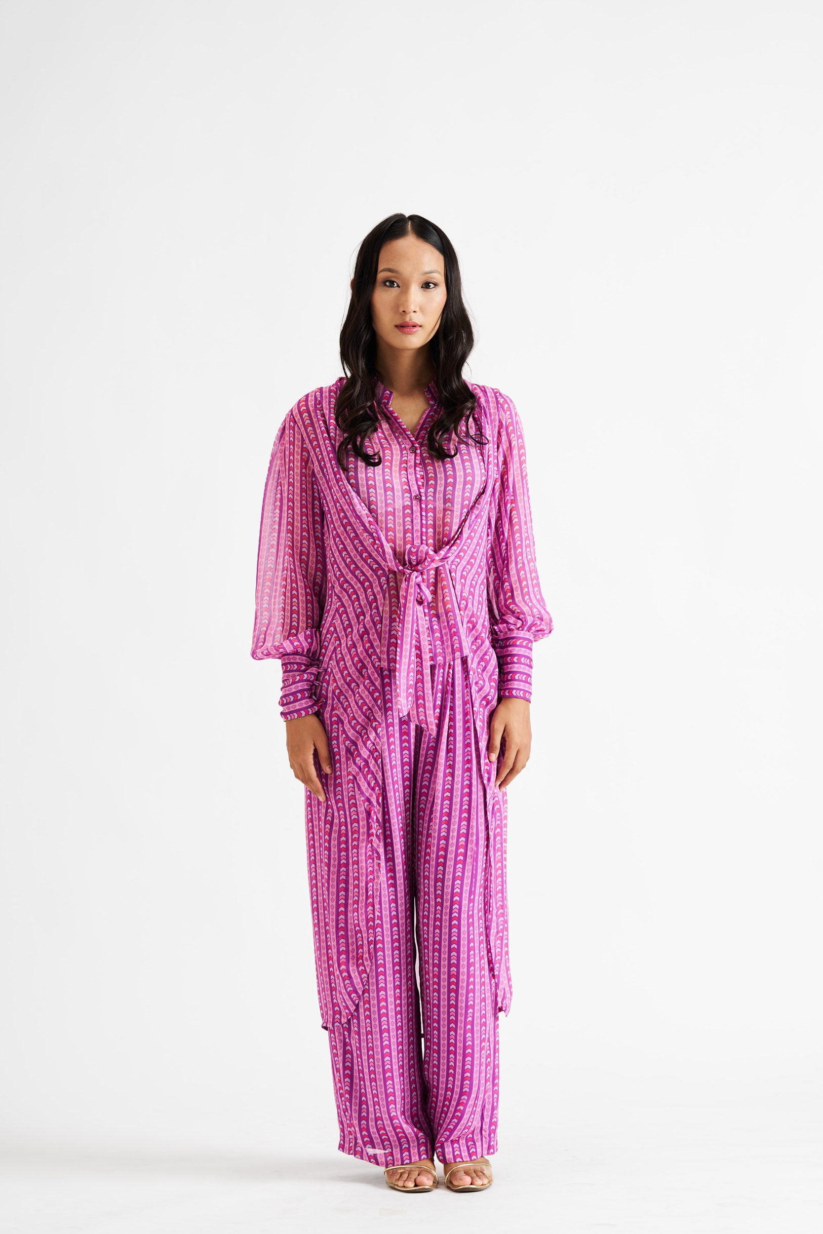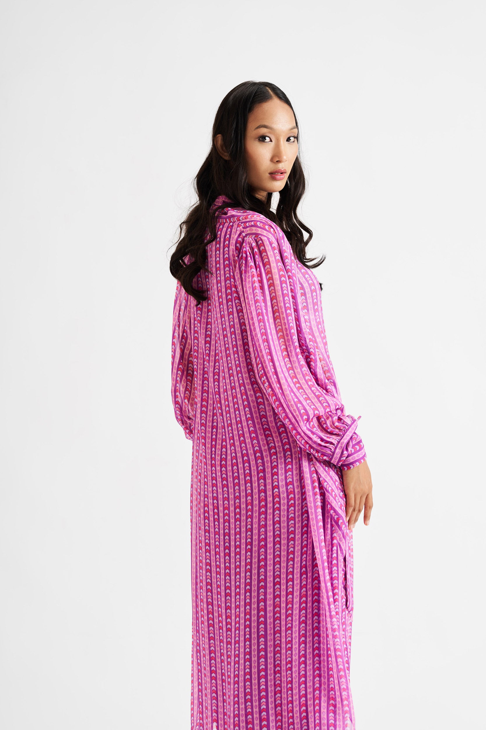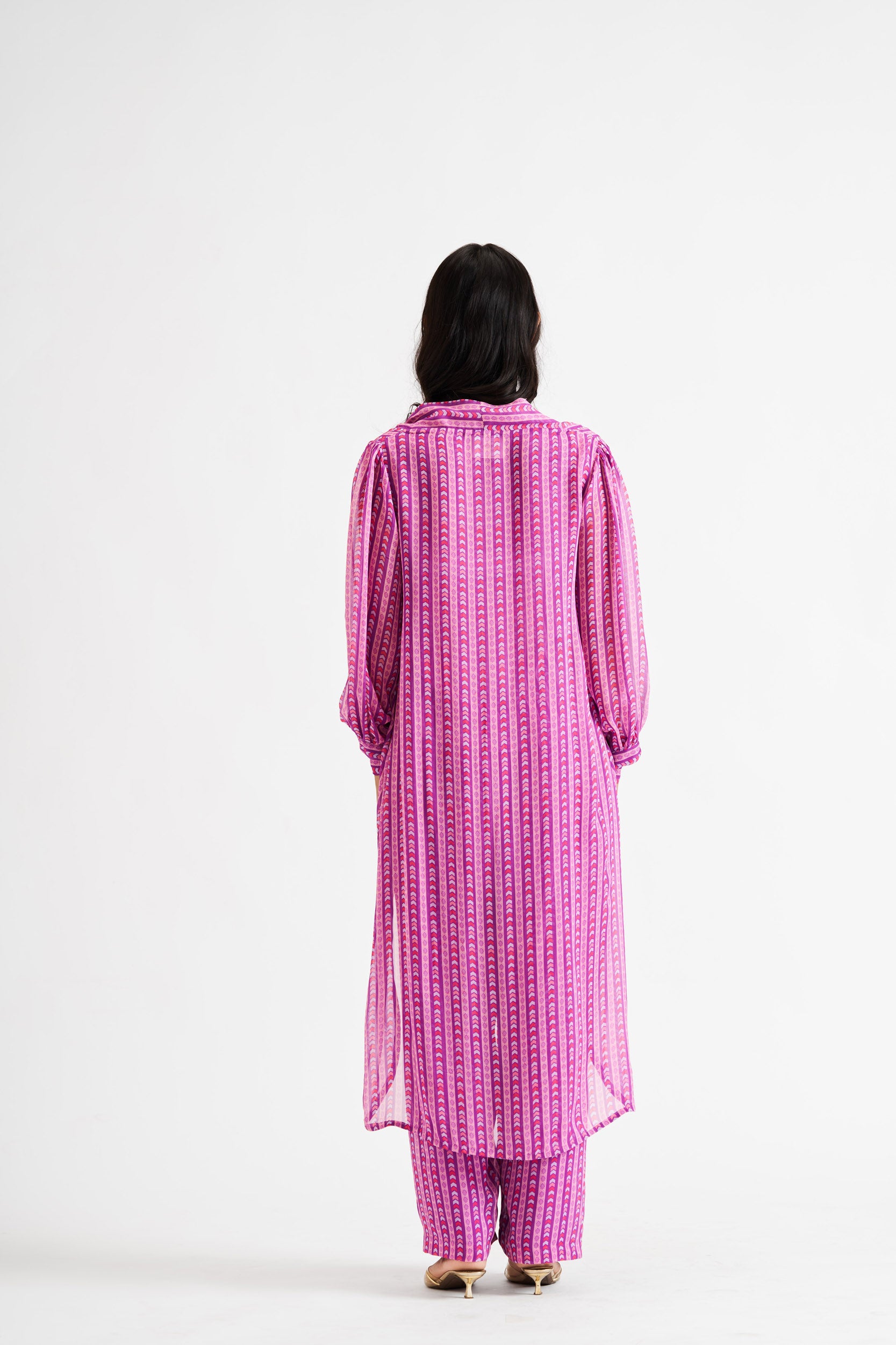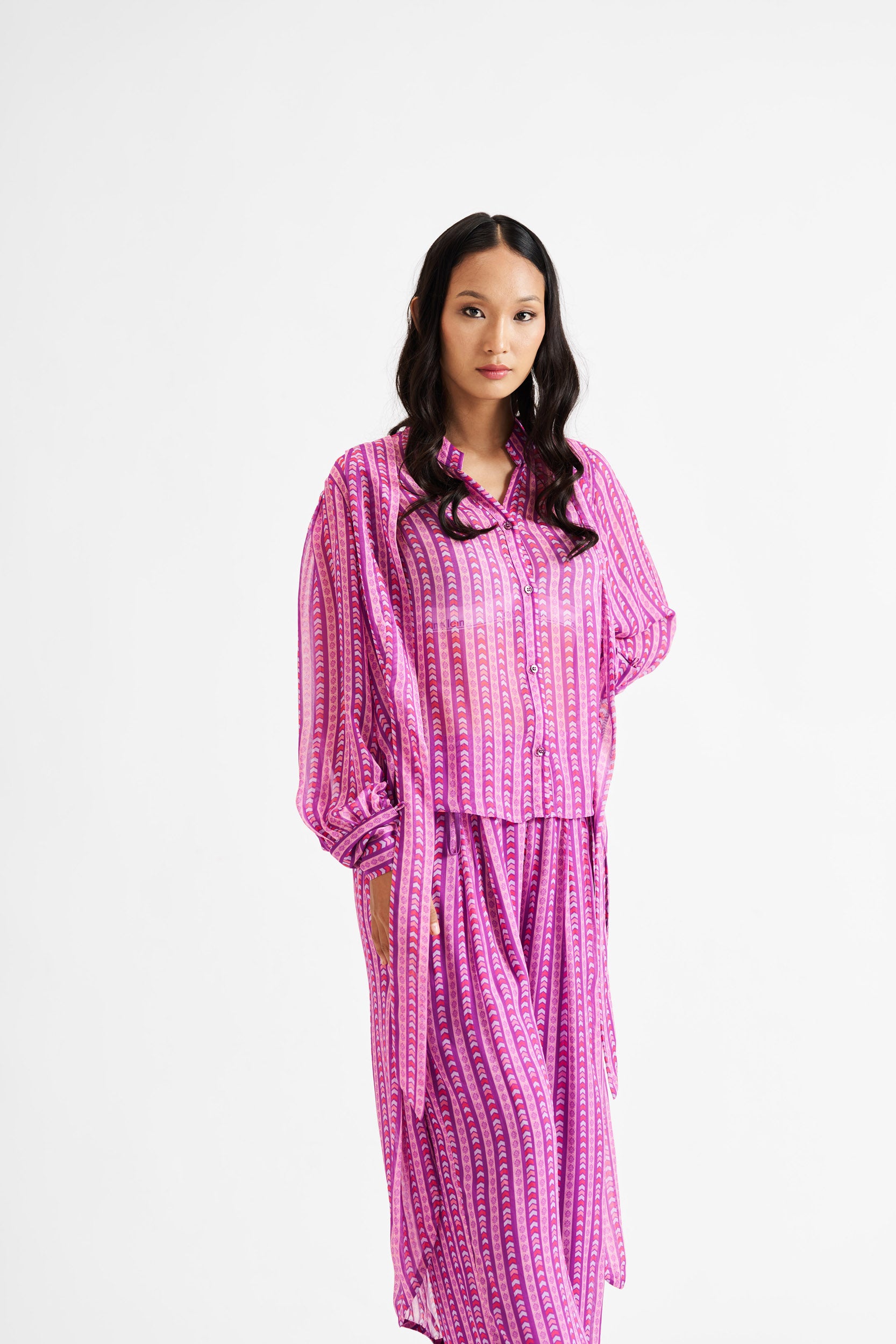 Description: A fusion of a structured shirt and kurta, featuring bold purple lines for a statement look.