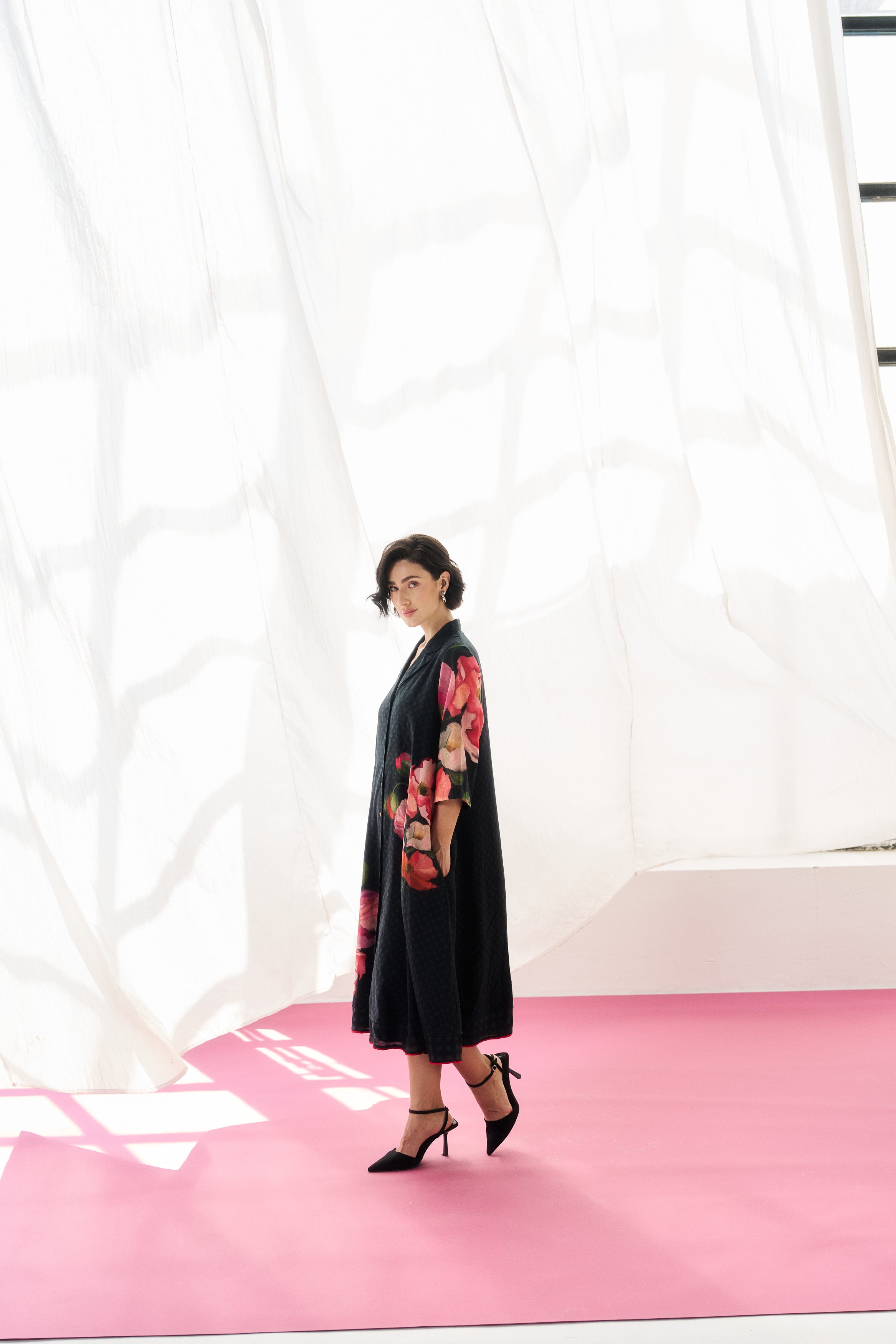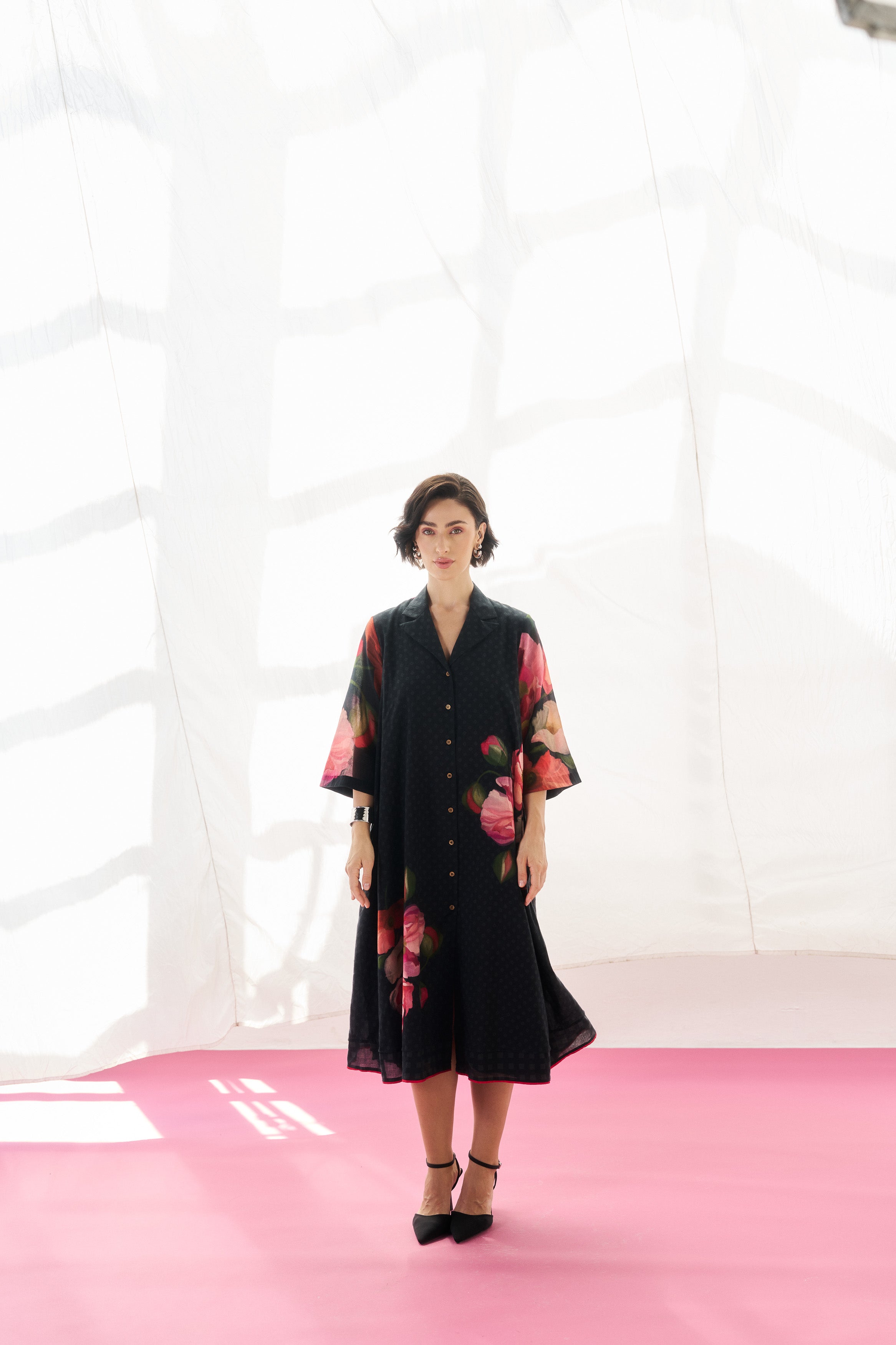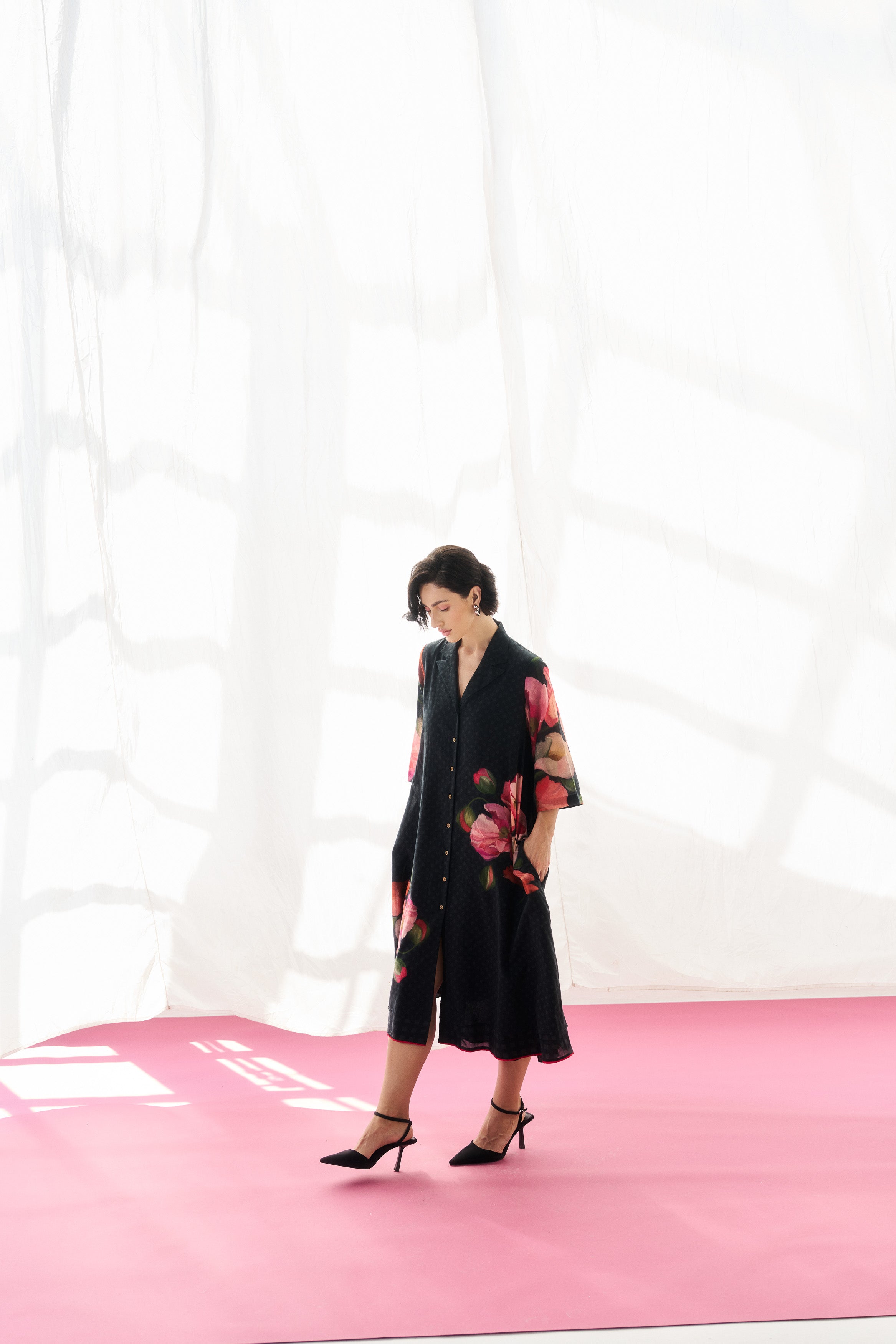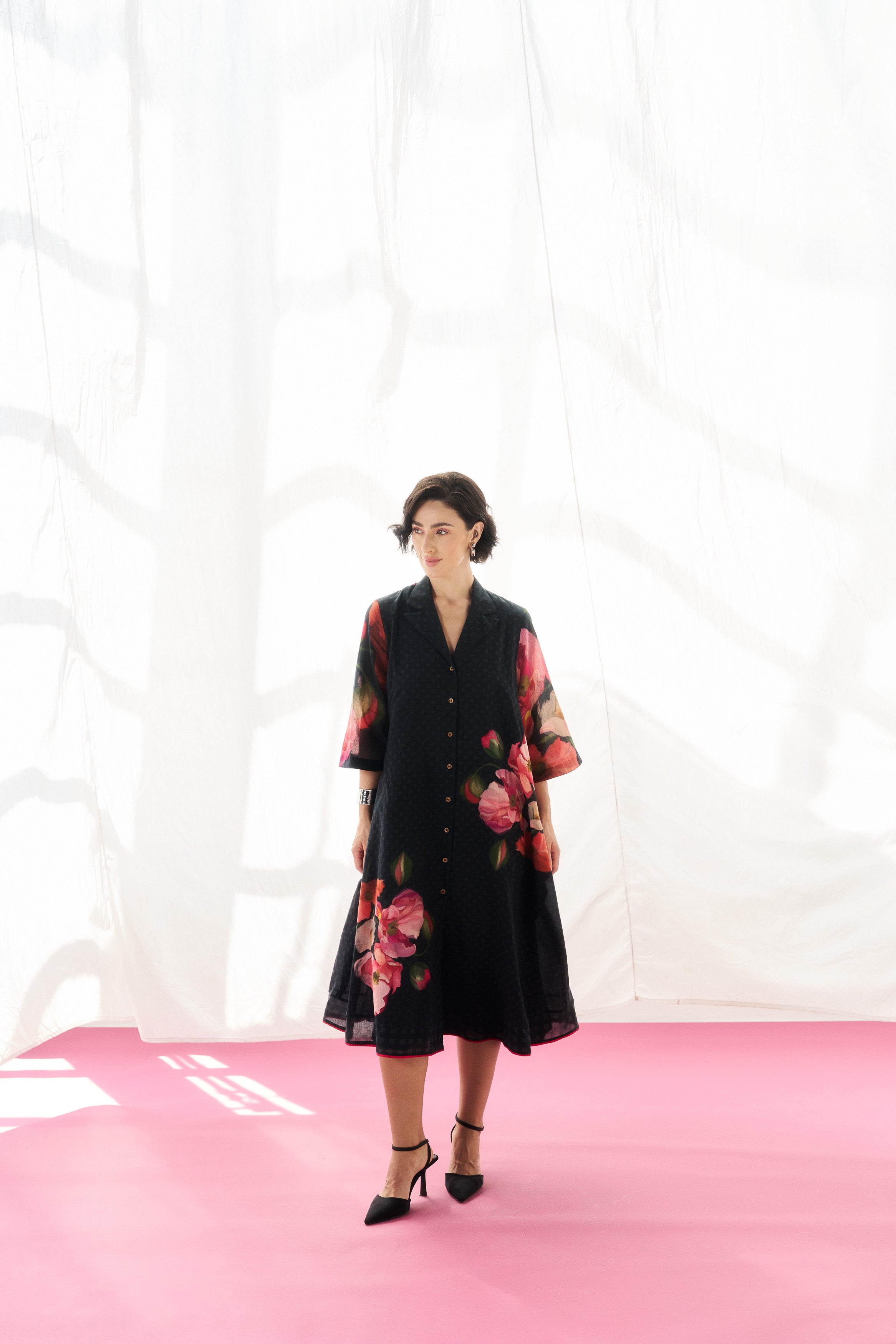 Description: A fluid black mul mul dress tailored for effortless elegance.