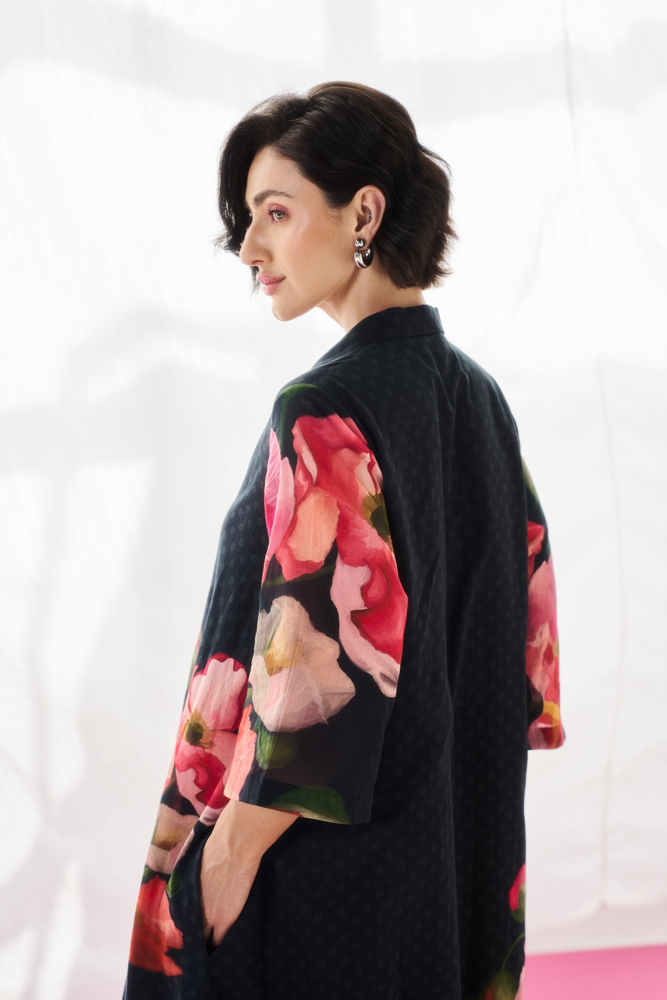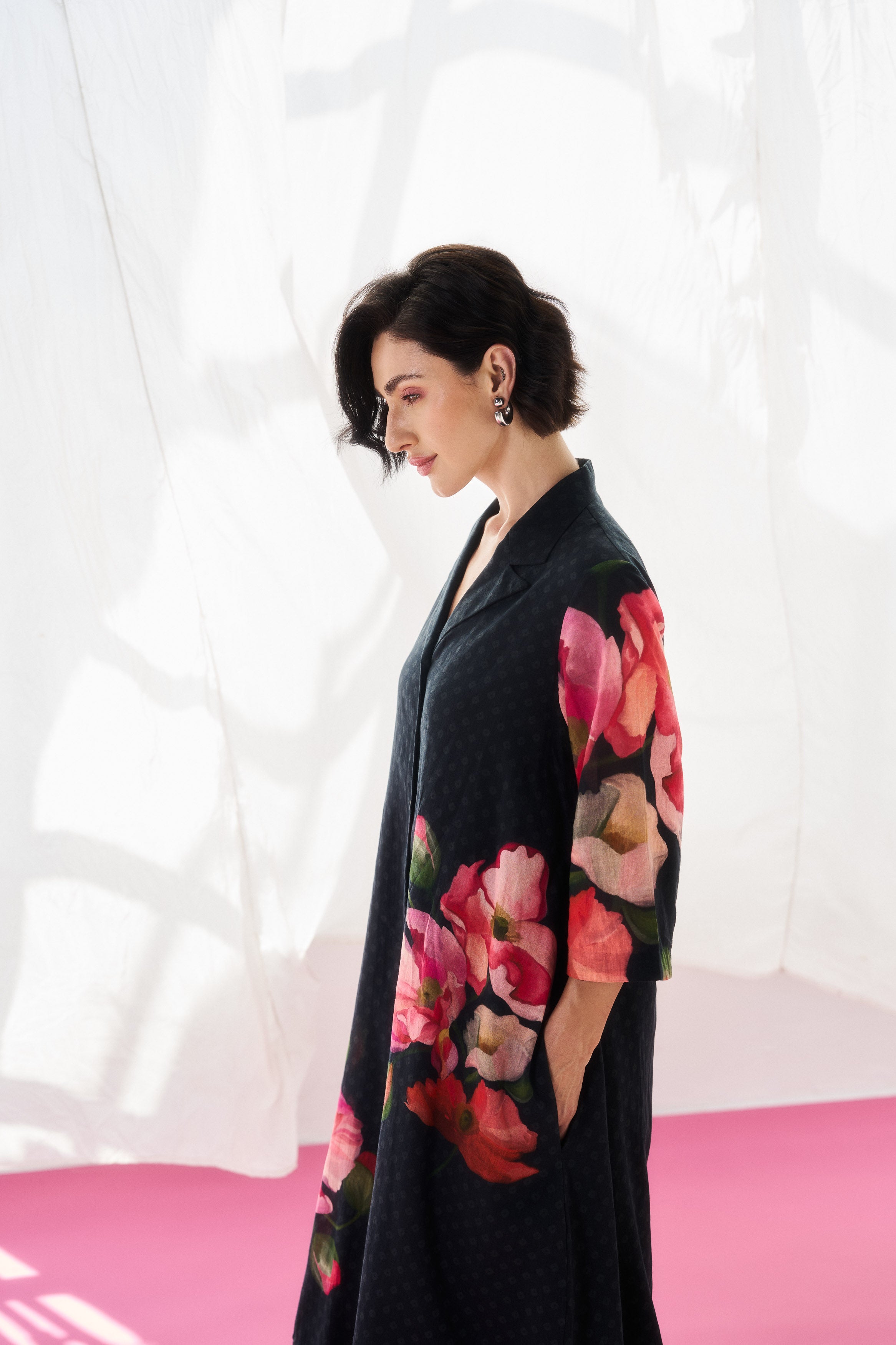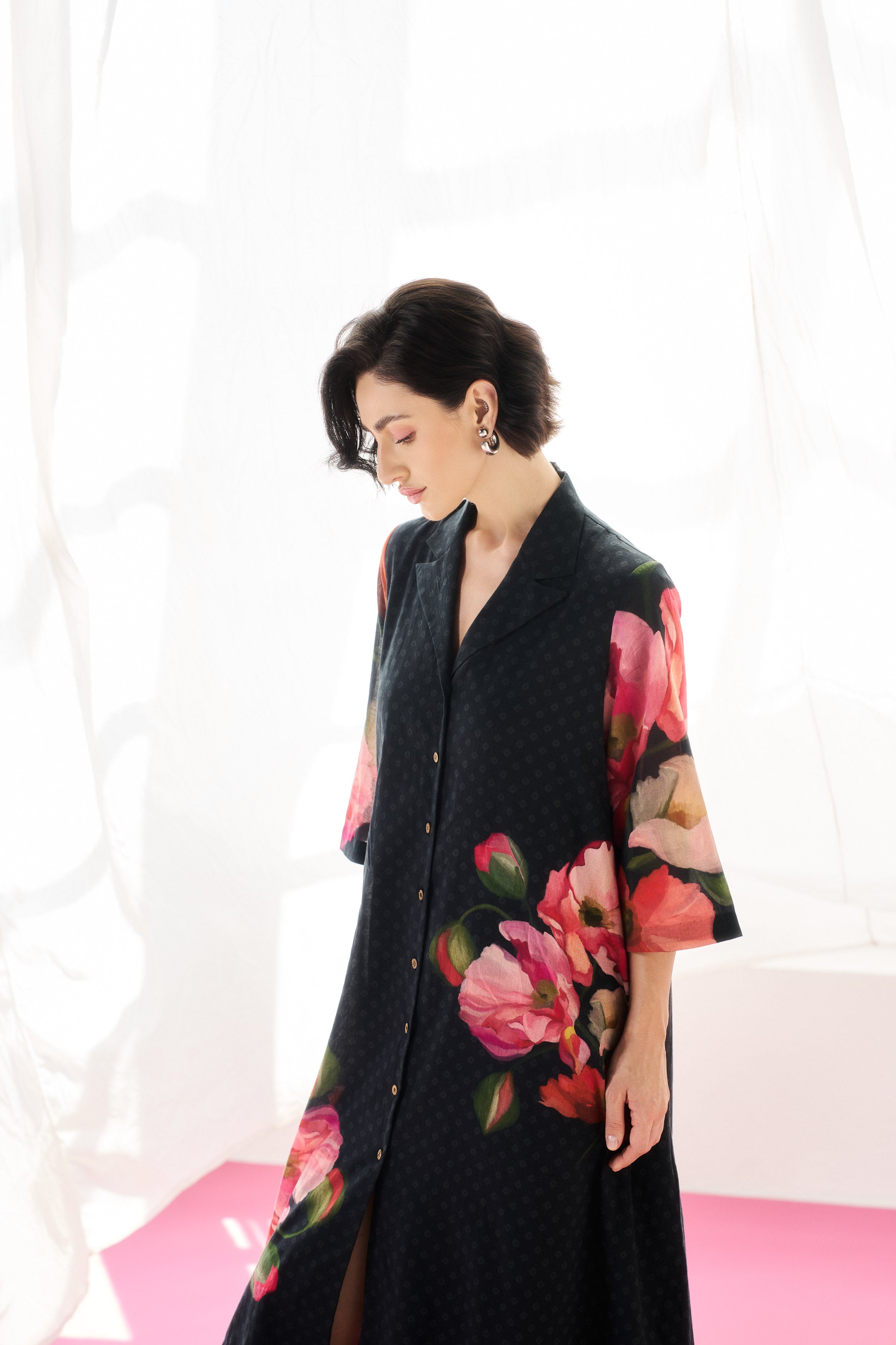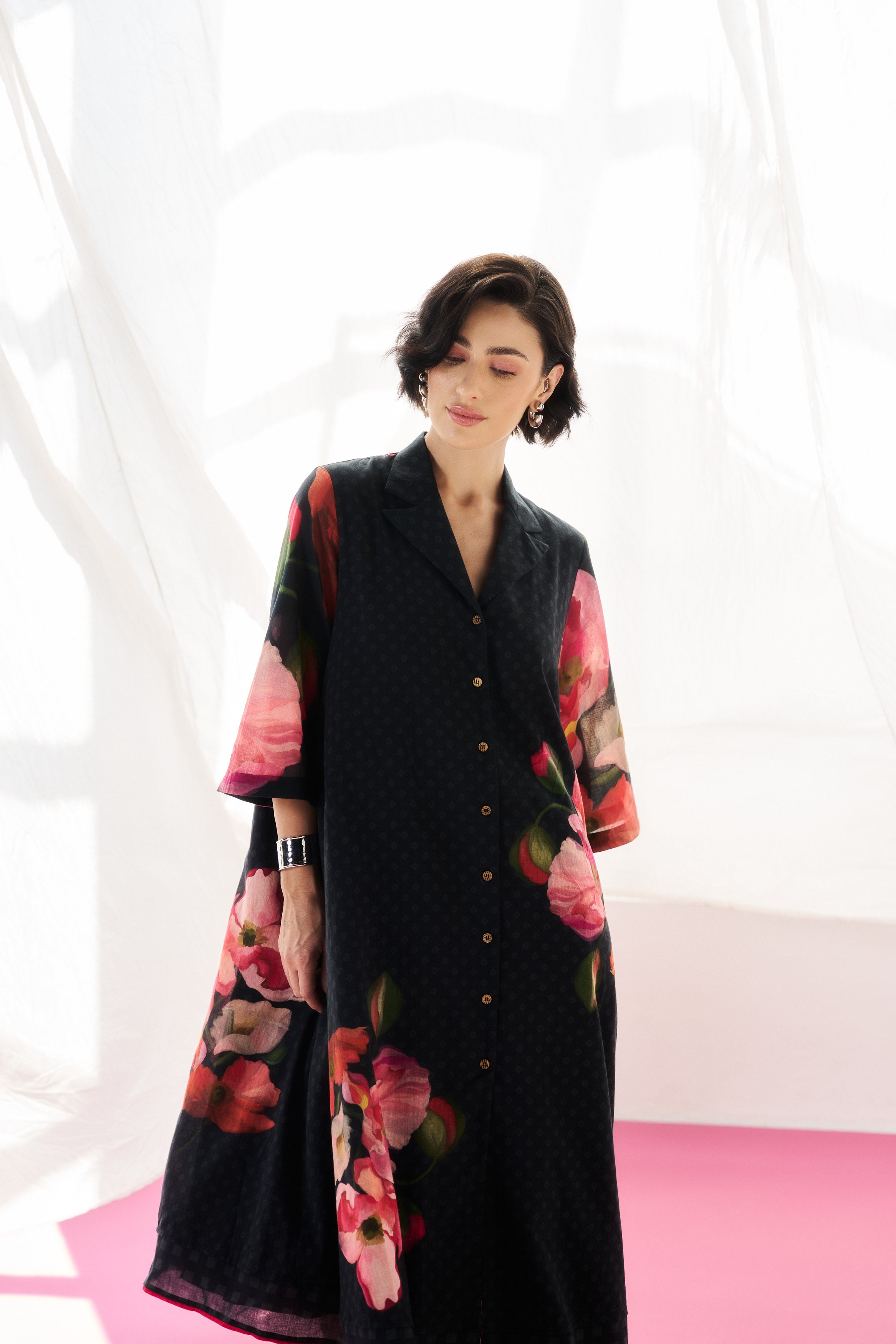 Description: A fluid black mul mul dress tailored for effortless elegance.