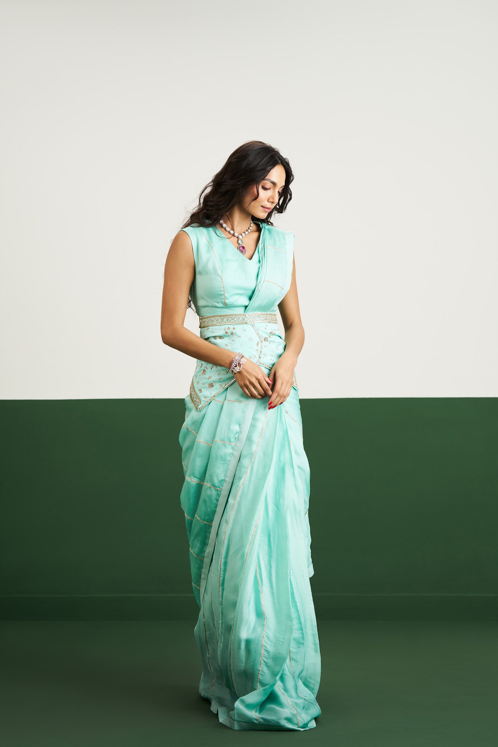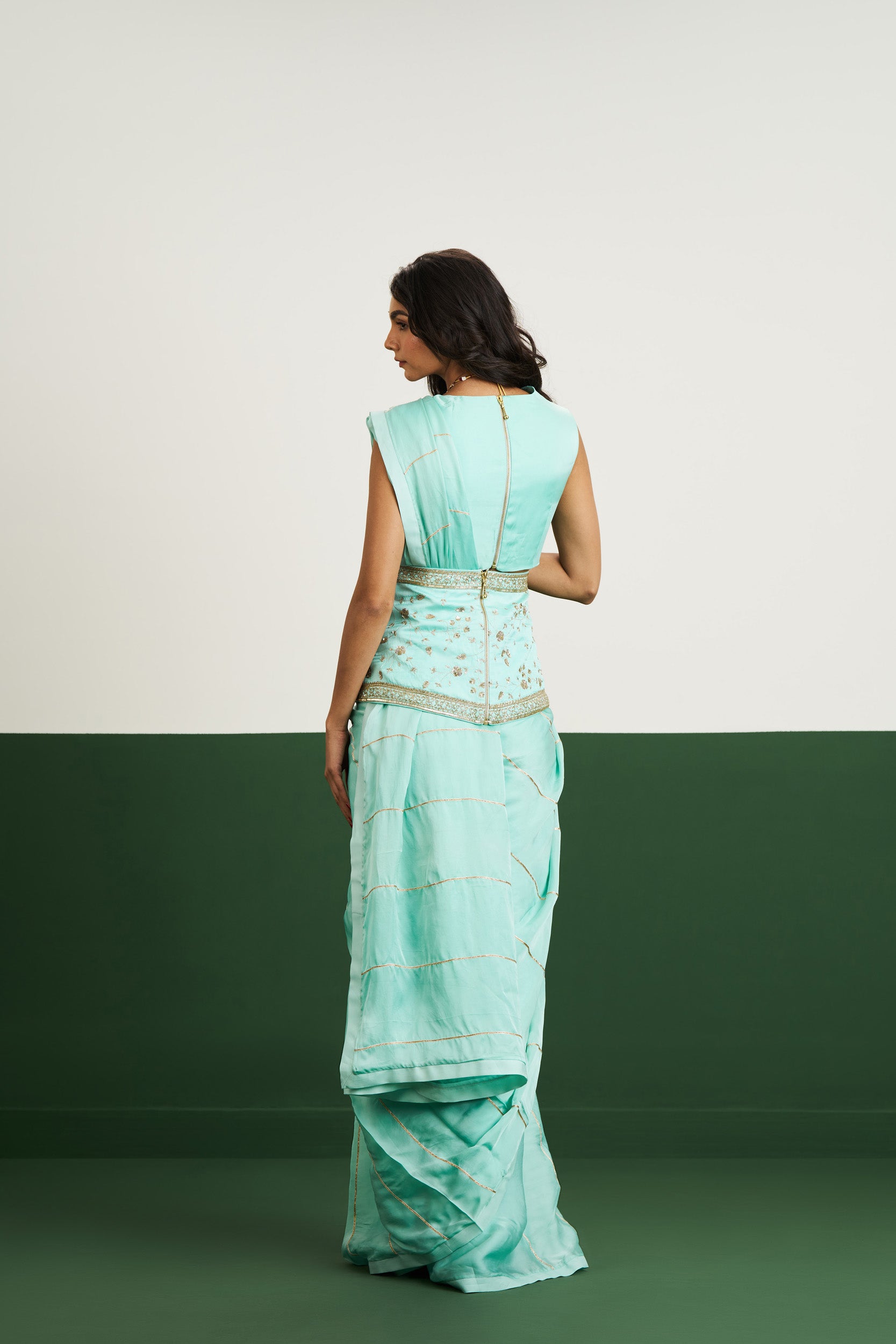 Description: The Vanessa Set in sea green is a fusion of contemporary draping and corset structure. Cool-toned and chic, it’s ideal for making a subtle statement.